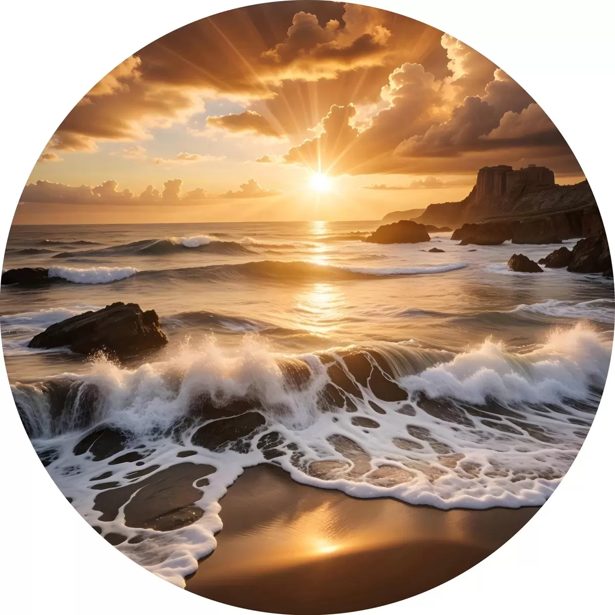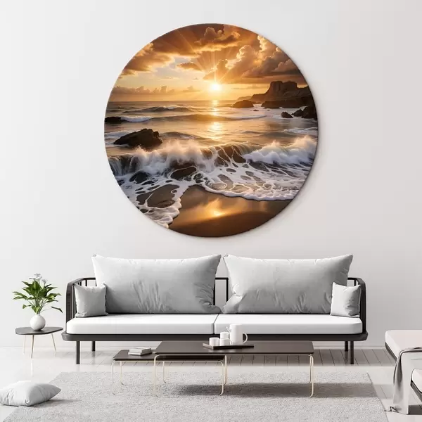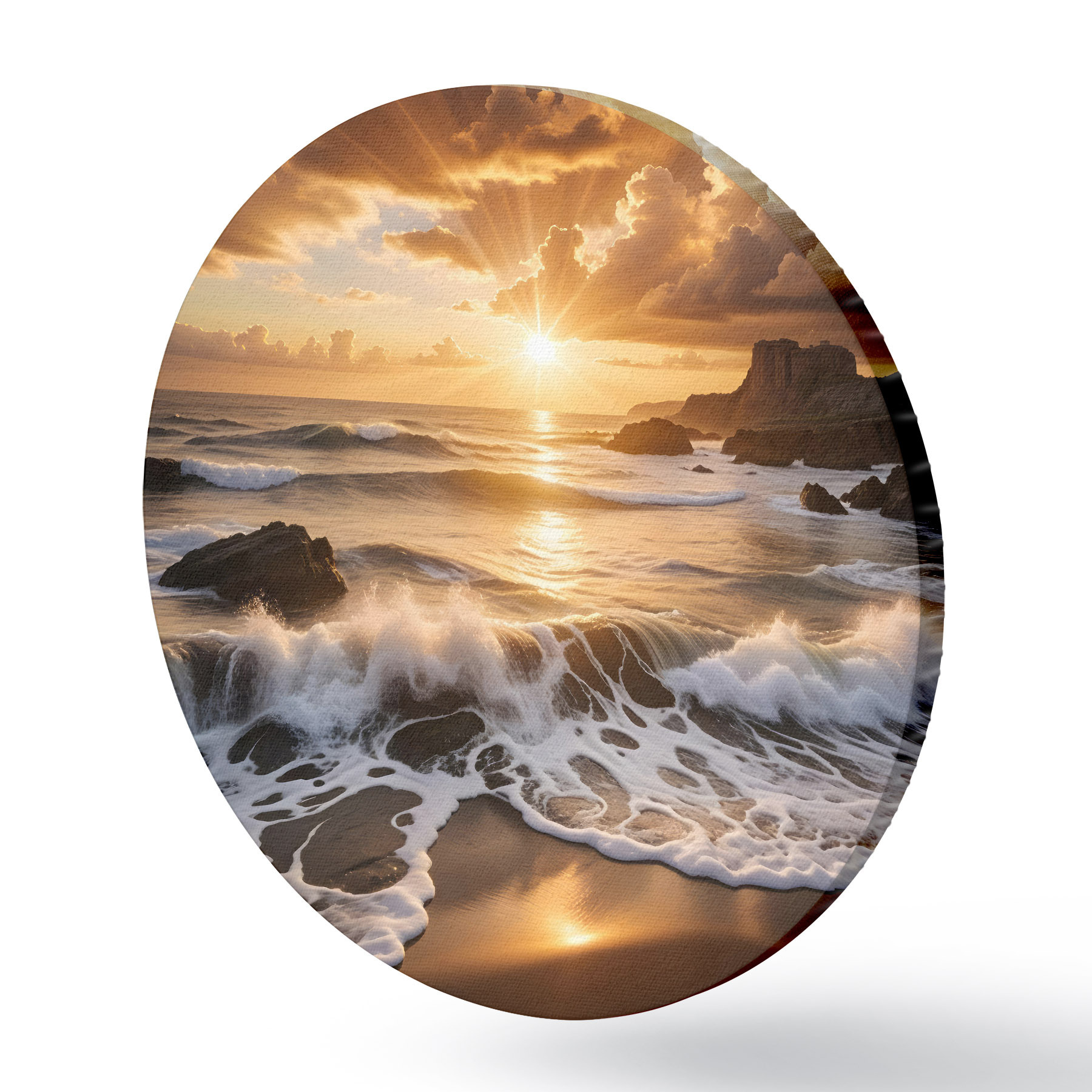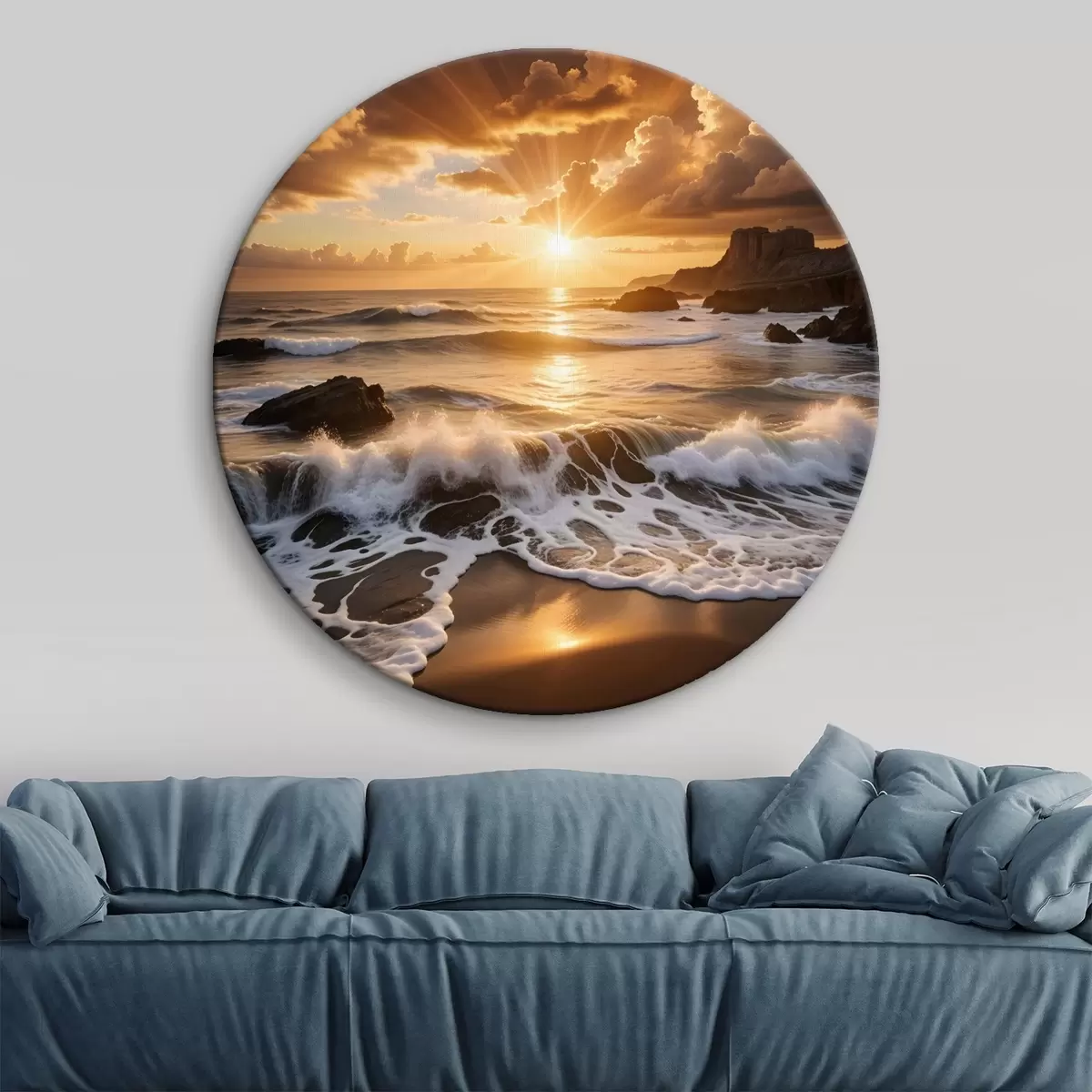 Ronde schilderijen Dramatische zonsondergang boven de rotsachtige kust, met beukende golven en dramatische wolken in de lucht r41245