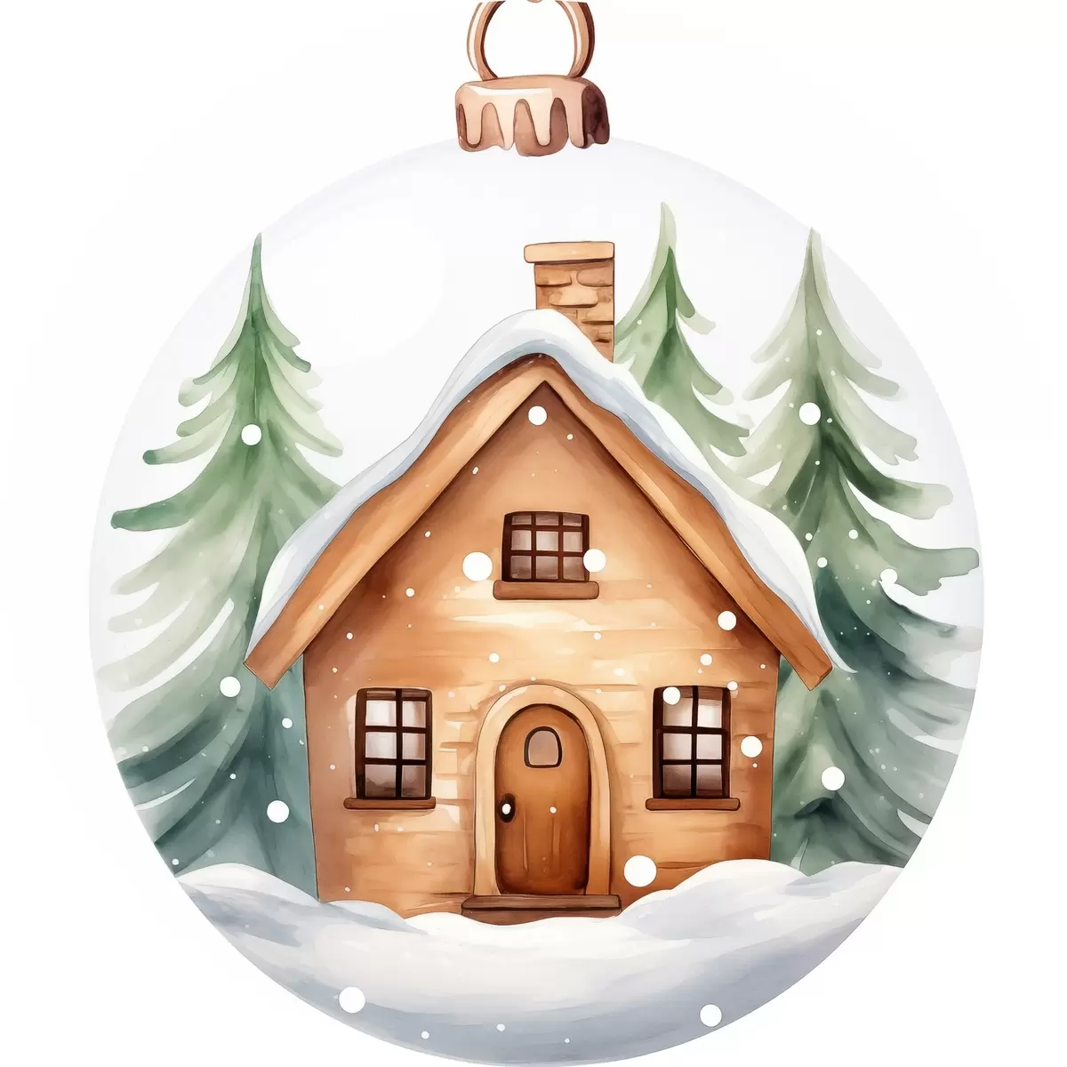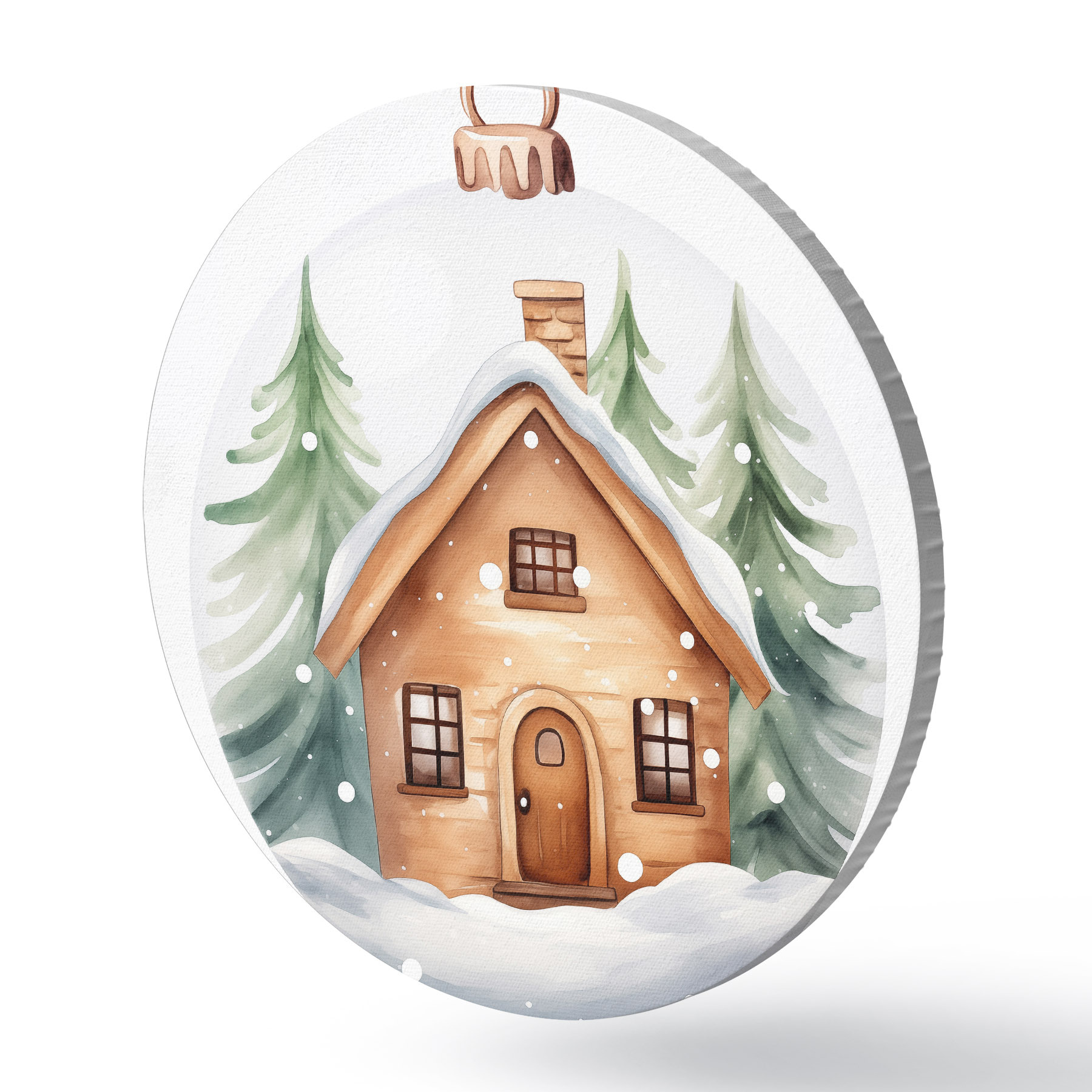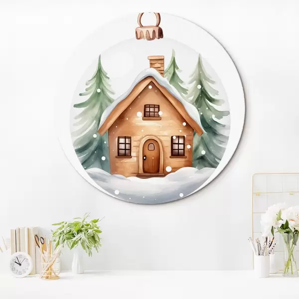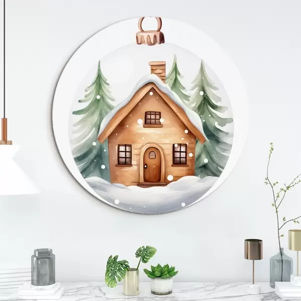 Ronde schilderijen Kristallen bol met aquarel huis in de sneeuw, dennenbomen r41362