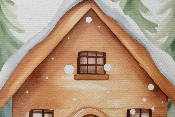 Afbeelding Kristallen bol met aquarel huis in de sneeuw, dennenbomen Nr r41362