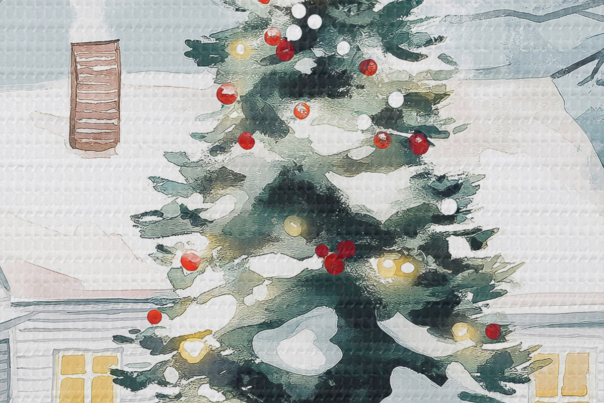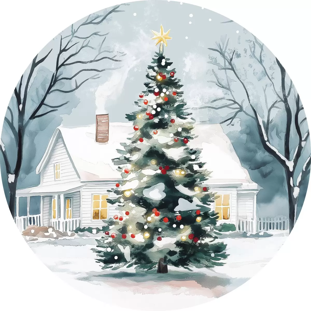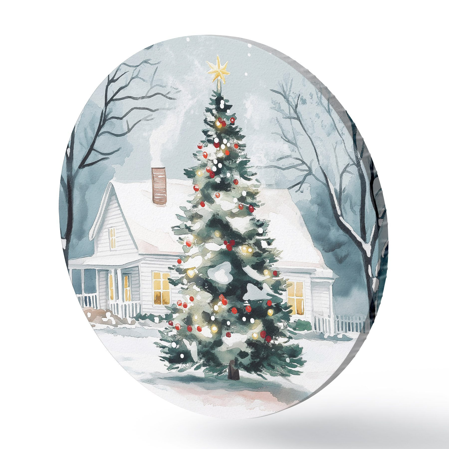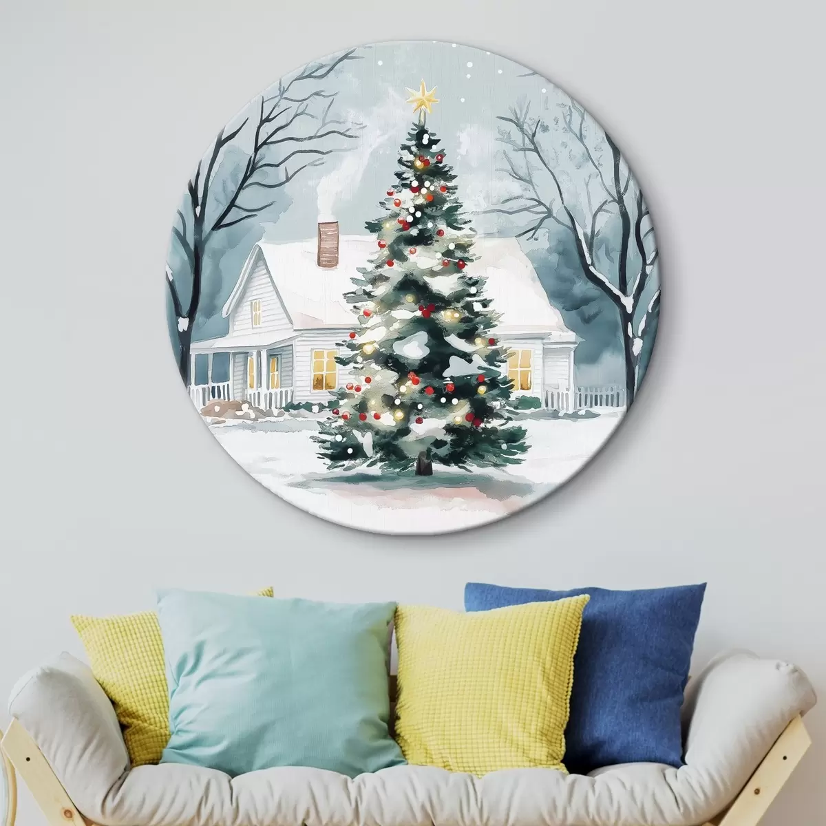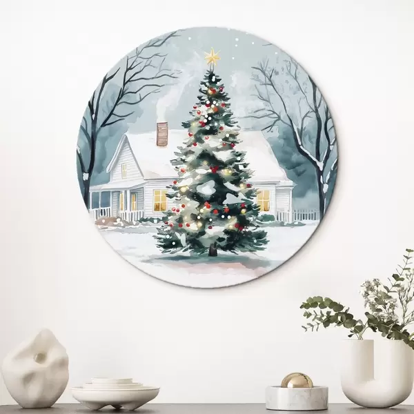Ronde schilderijen Winterstad, versierde dennenboom, kerstmis, aquarel r41364