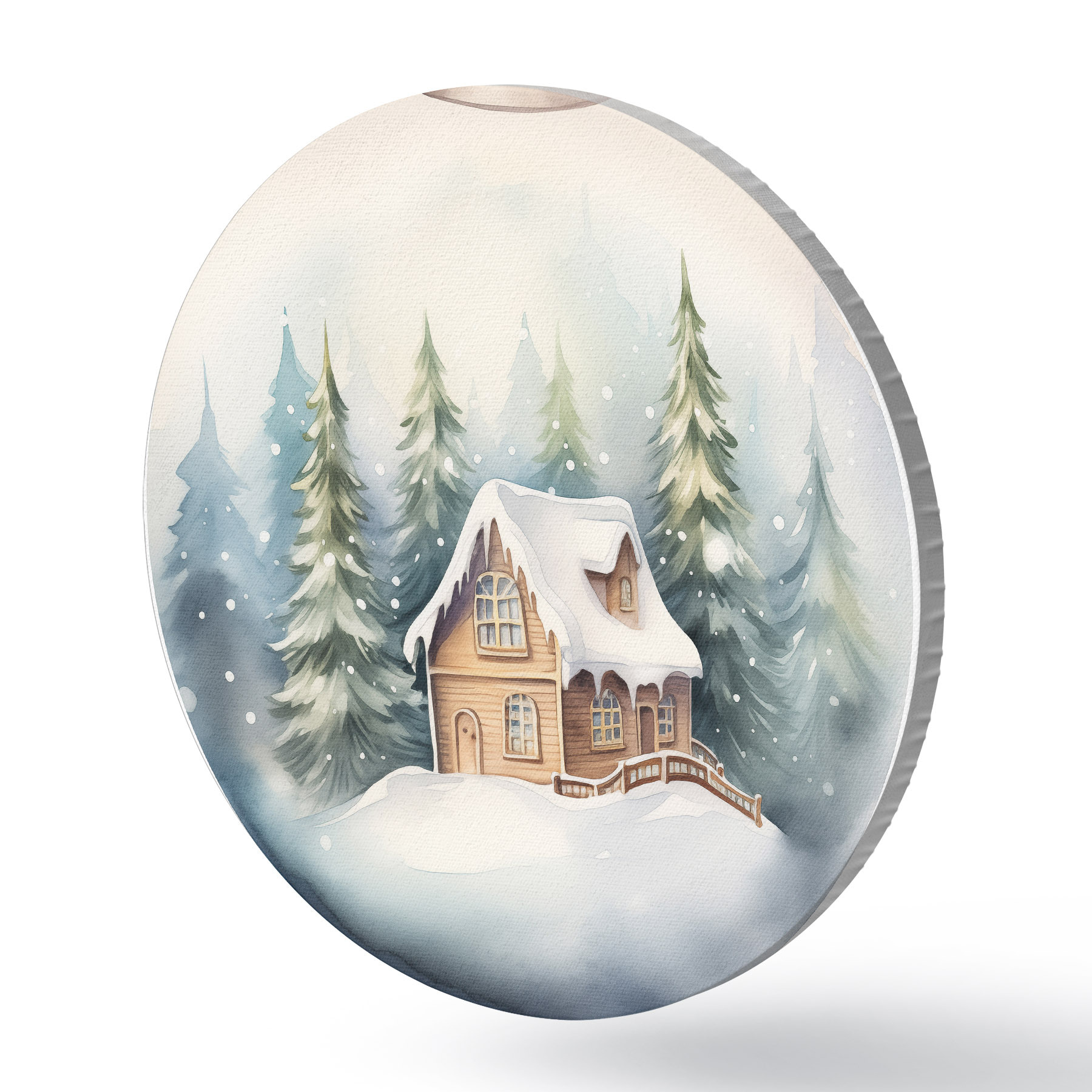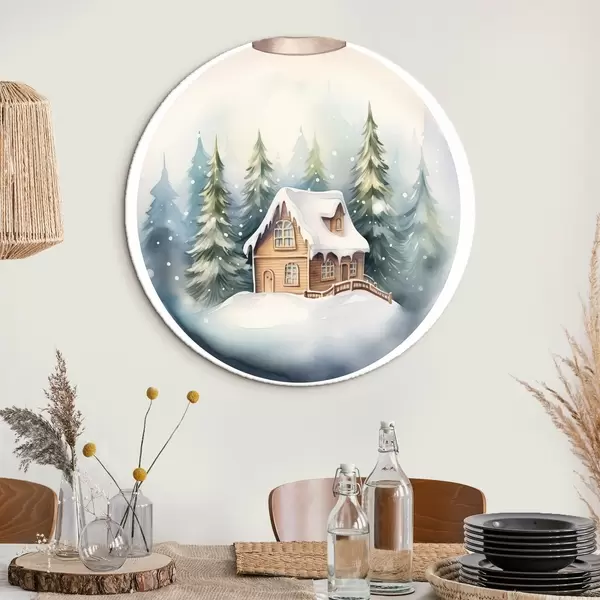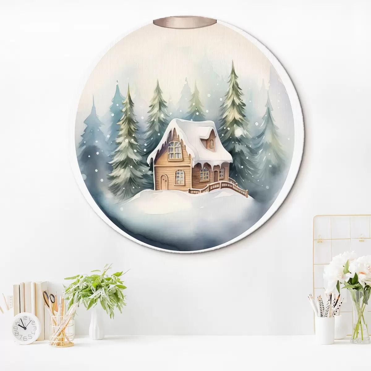 Ronde schilderijen Aquarel kristallen bol met winterlandschap, huis in het bos, sneeuw r41366