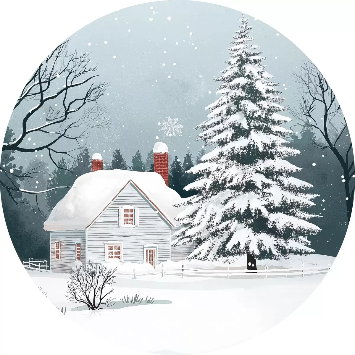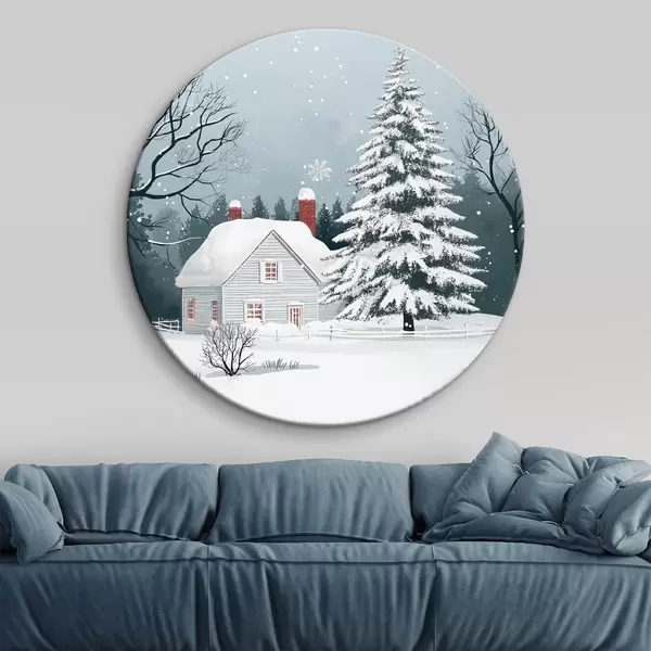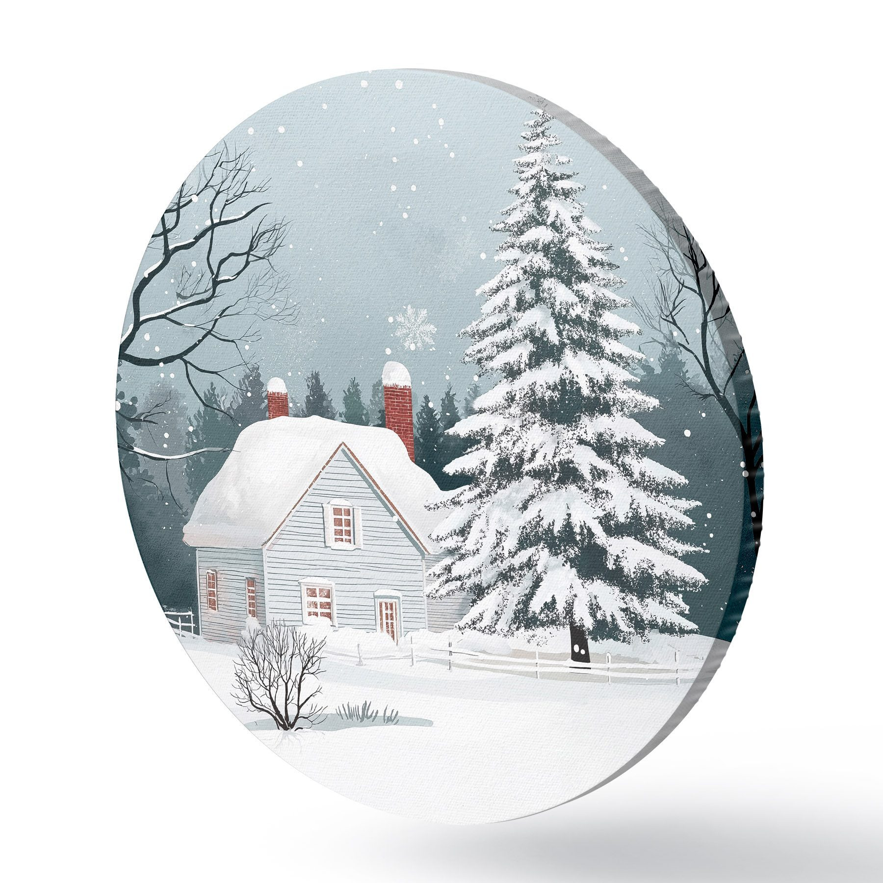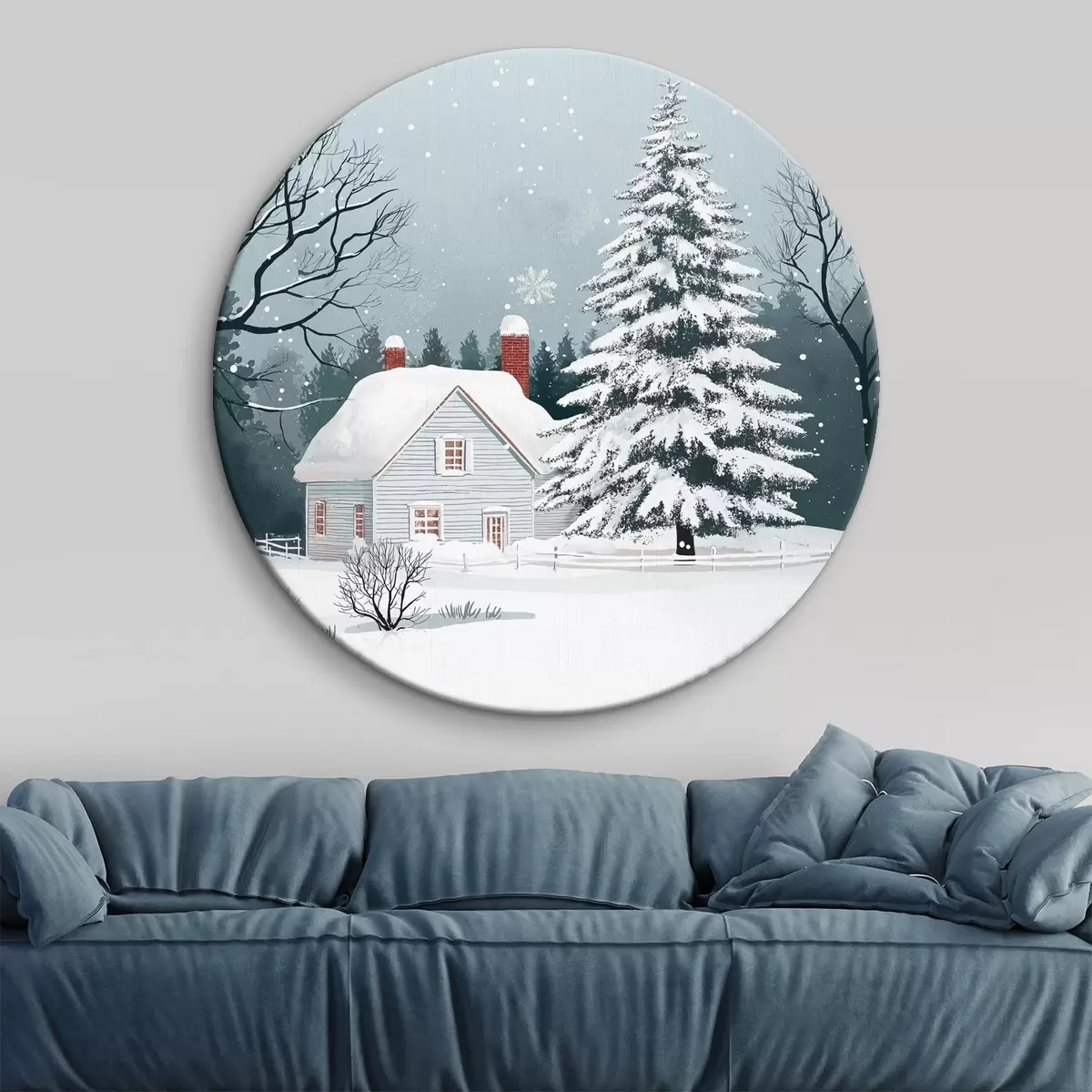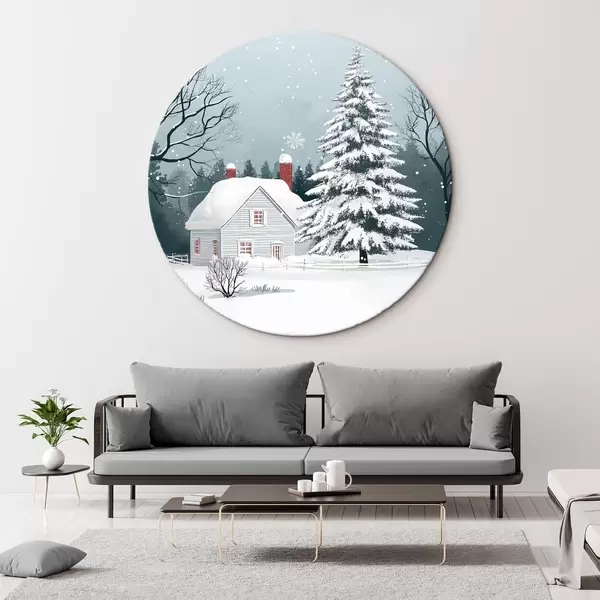 Ronde schilderijen Winterscène met huis bedekt met sneeuw, bos, pijnbomen r41369