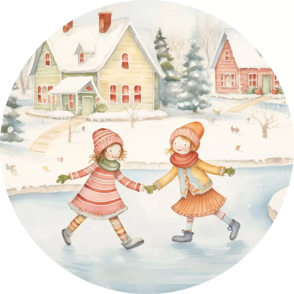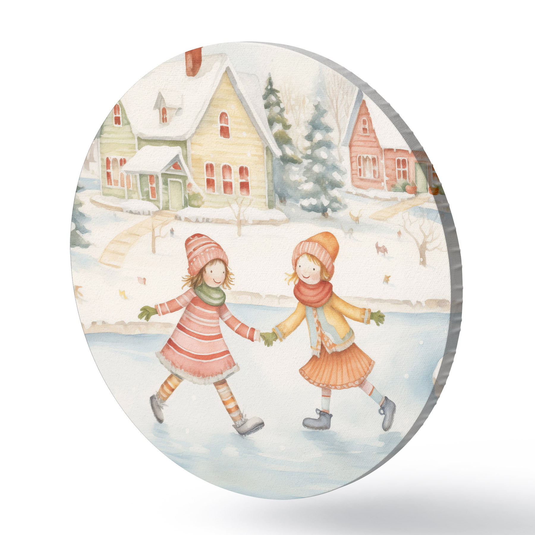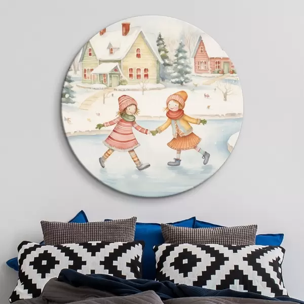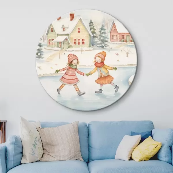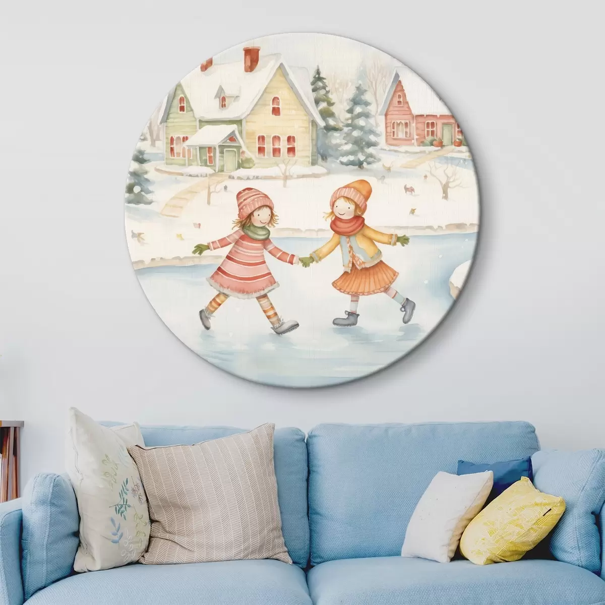 Ronde schilderijen Winterscène met twee meisjes die, winterstad, huizen, bos schaatsen r41377