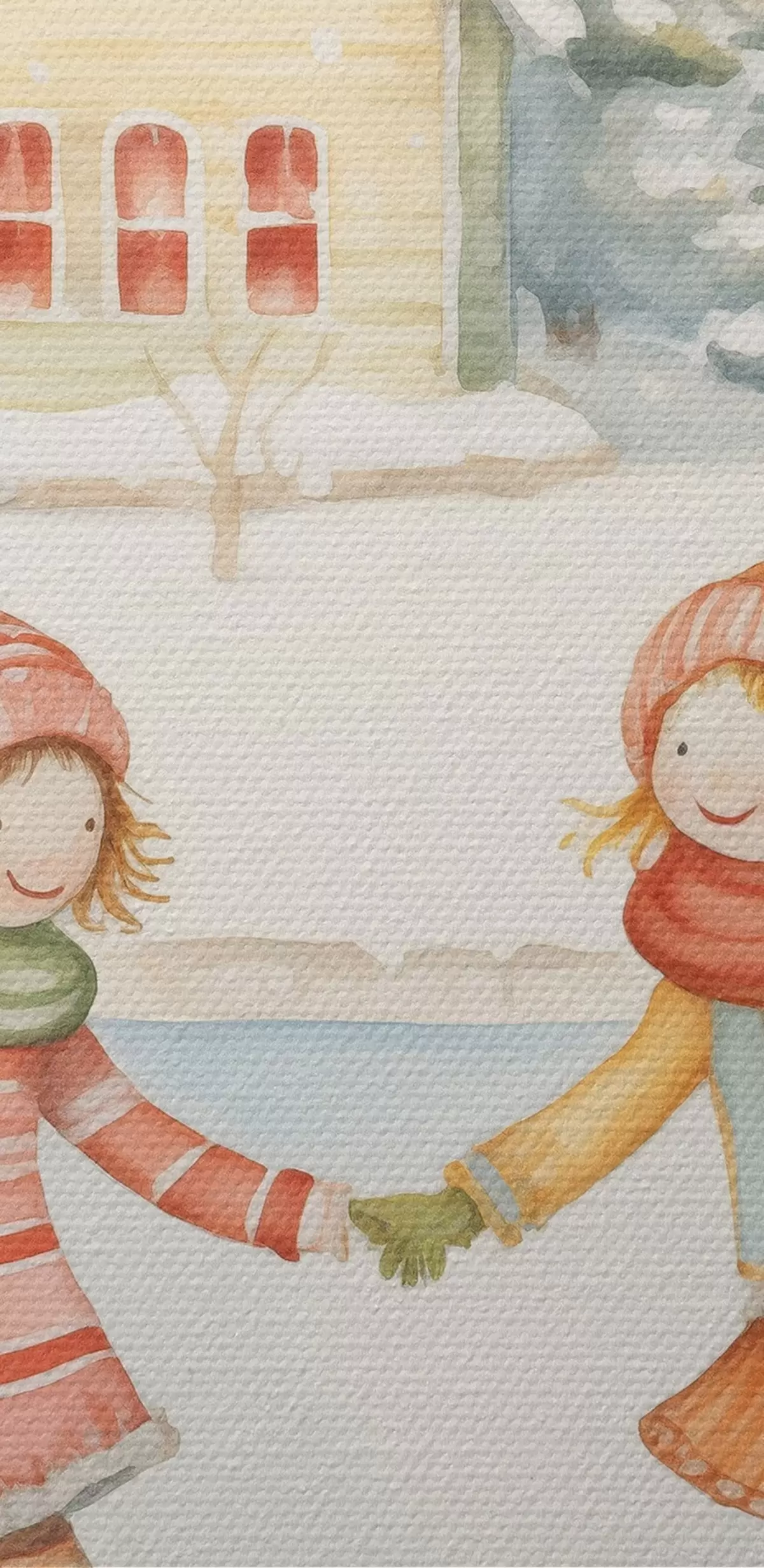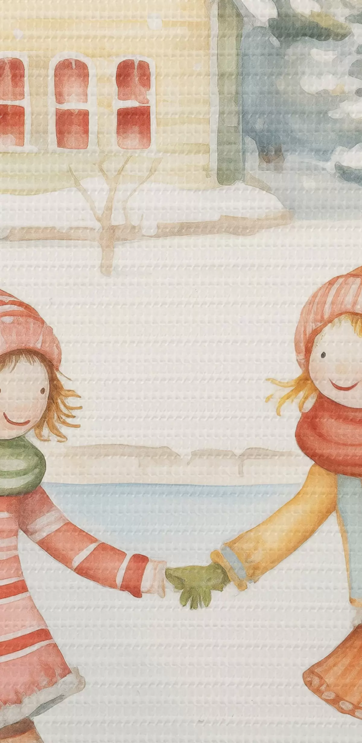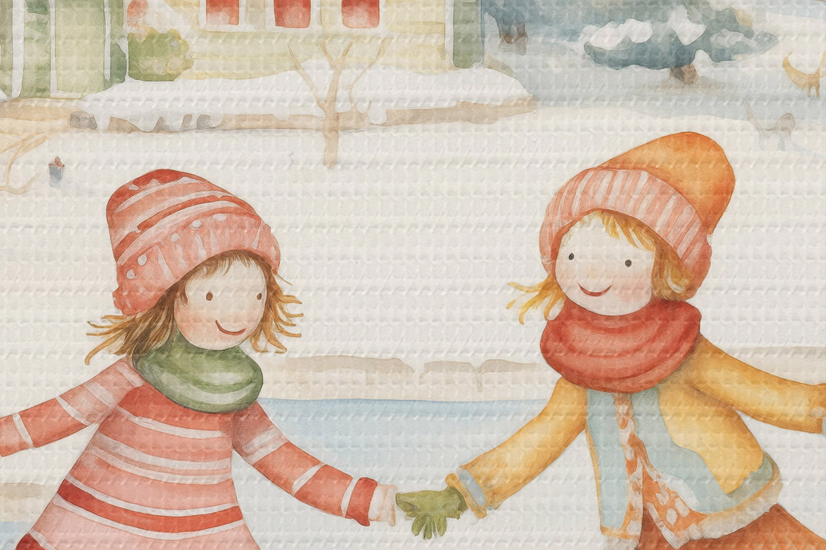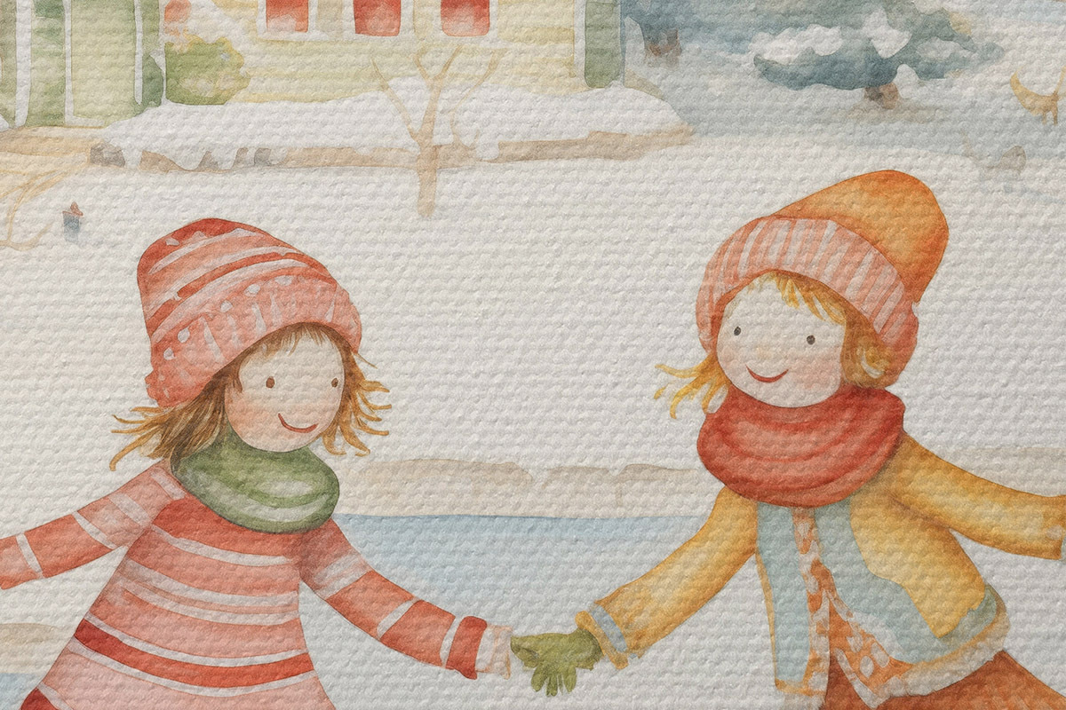 Afbeelding Winterscène met twee meisjes die, winterstad, huizen, bos schaatsen Nr r41377