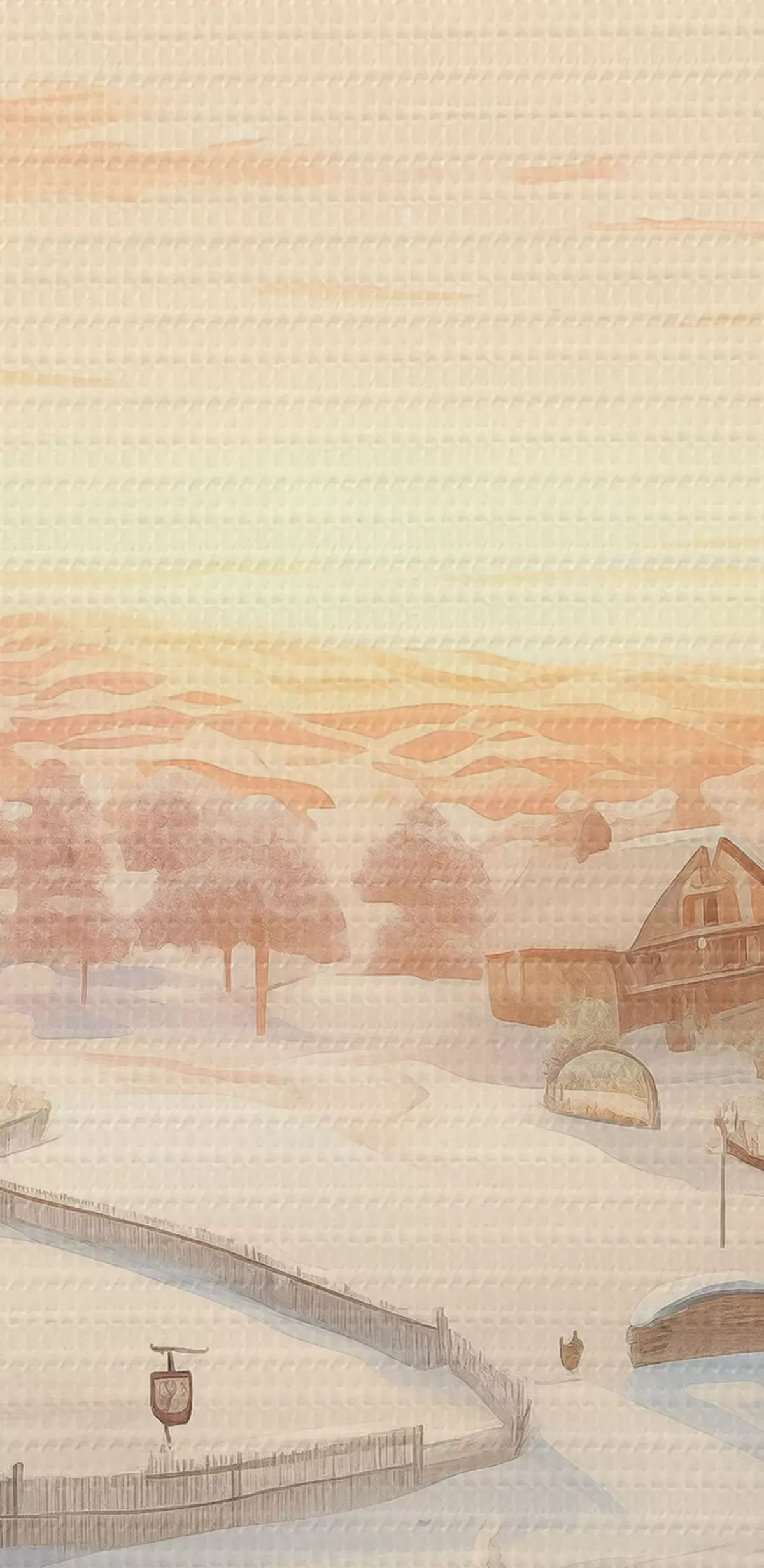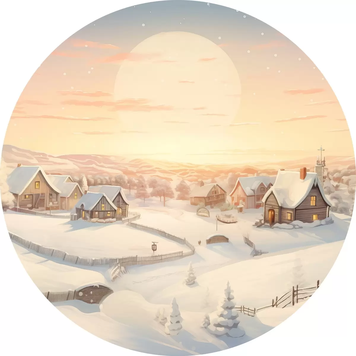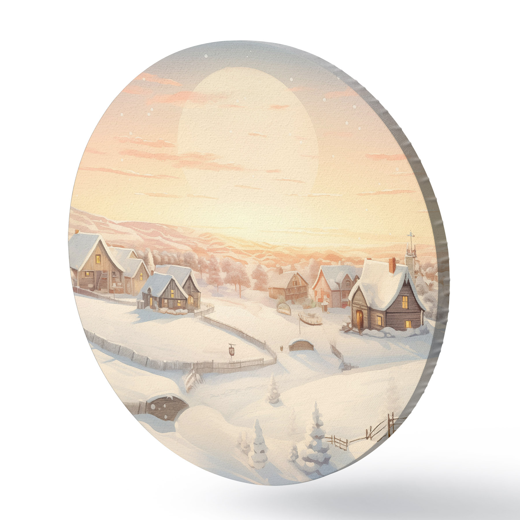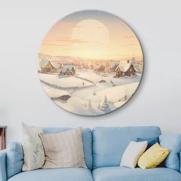 Ronde schilderijen Winterdorp bij zonsondergang, huizen bedekt met sneeuw, dennenbomen r41380