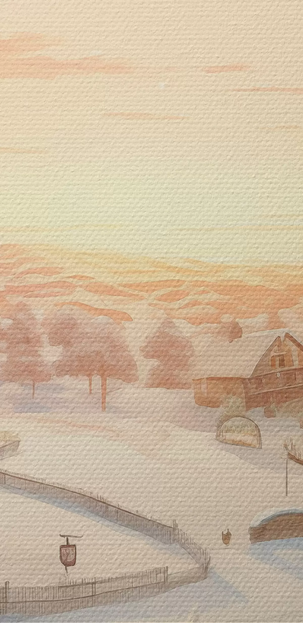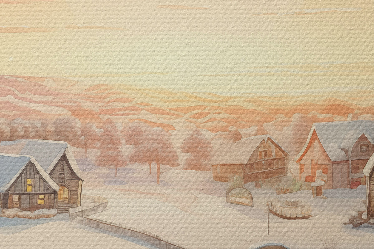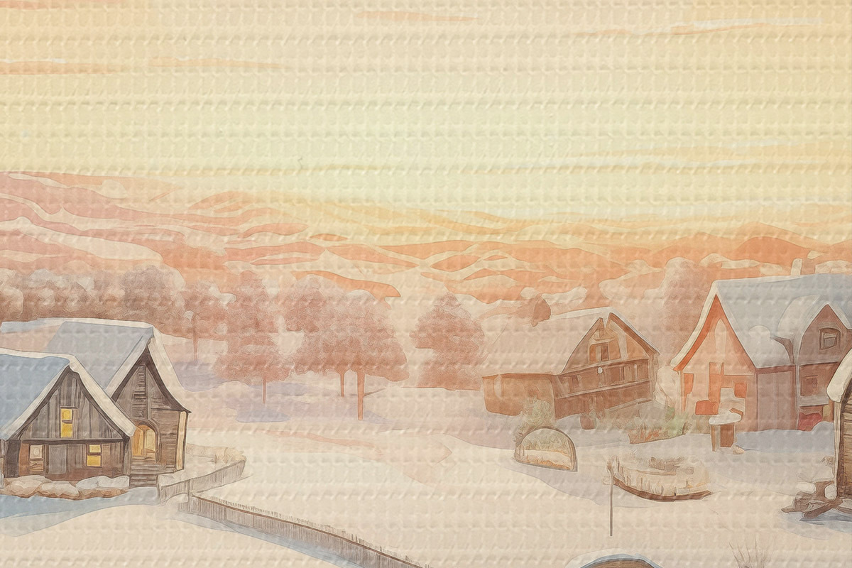 Afbeelding Winterdorp bij zonsondergang, huizen bedekt met sneeuw, dennenbomen Nr r41380