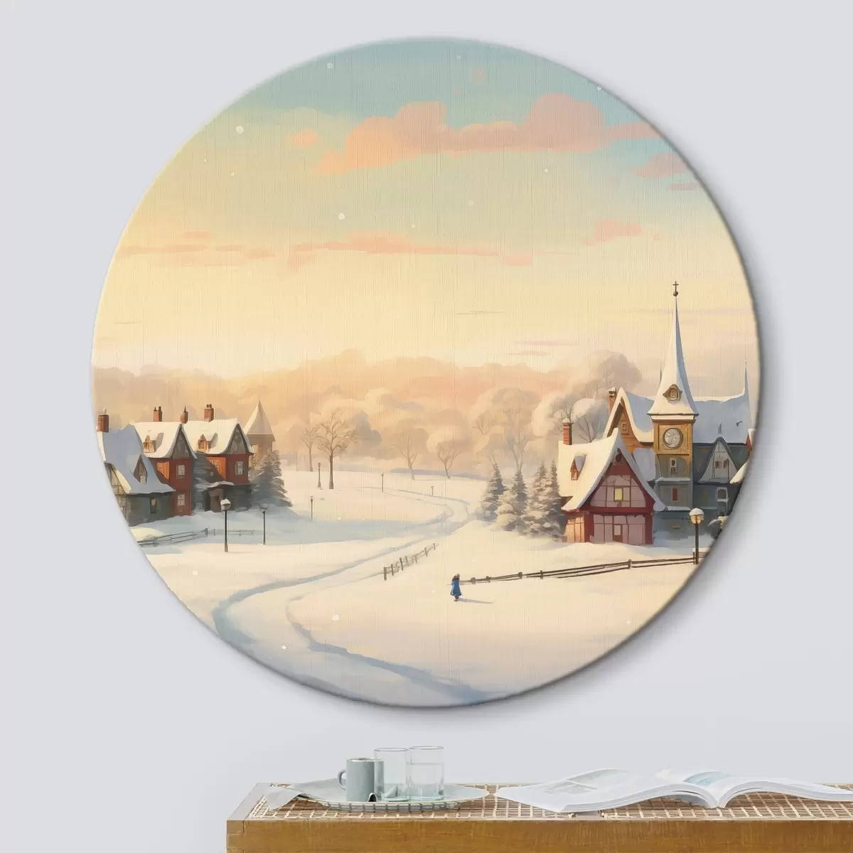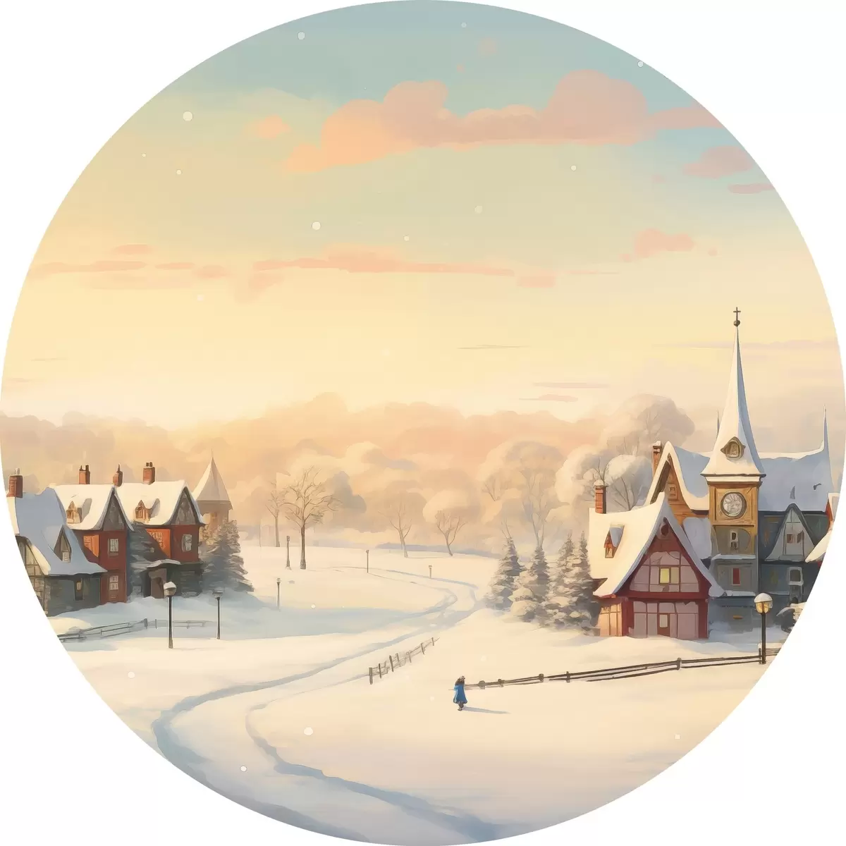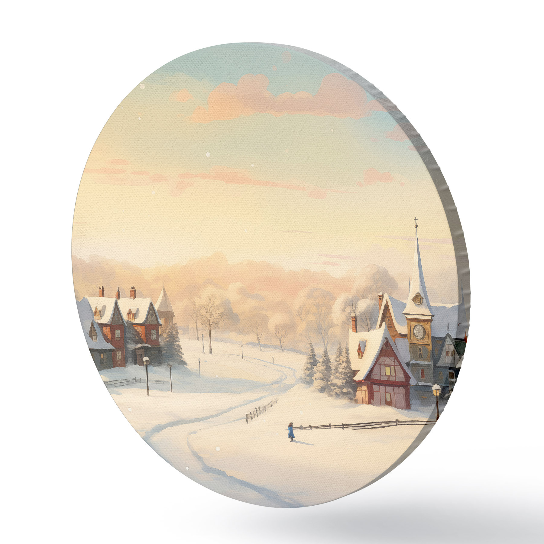 Ronde schilderijen Winterlandschap, huizen, zonsondergang, bomen, aquarel r41383