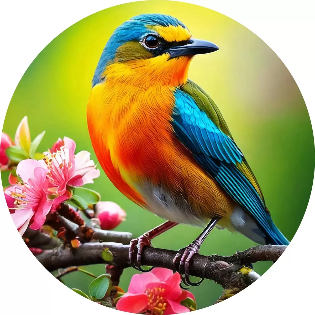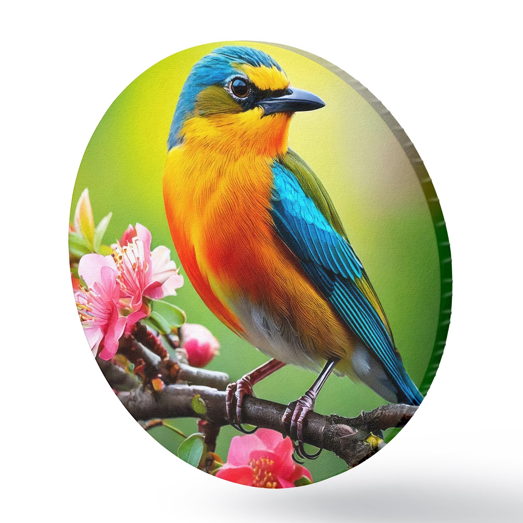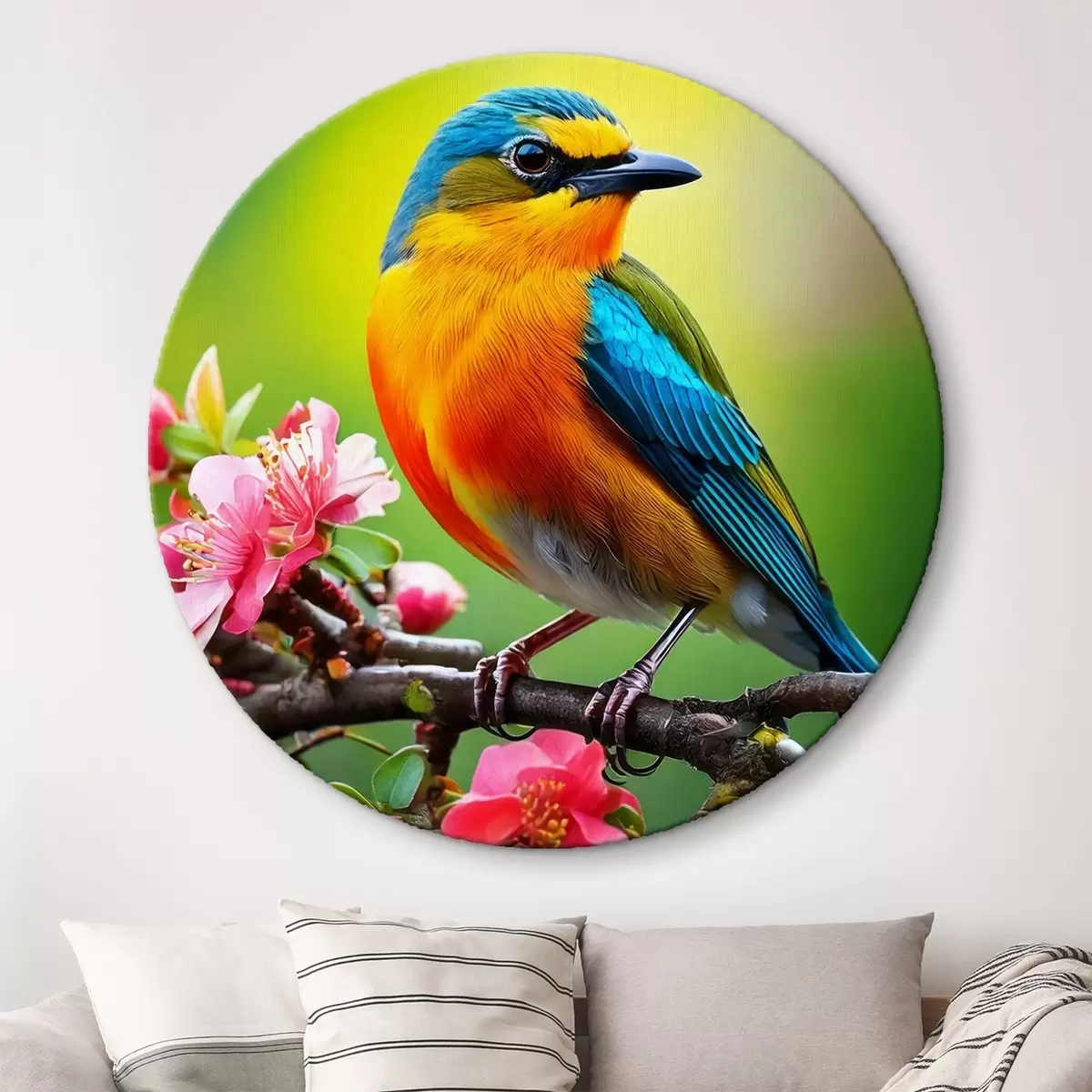 Ronde schilderijen heldere vogel op een tak met bloemen r41412