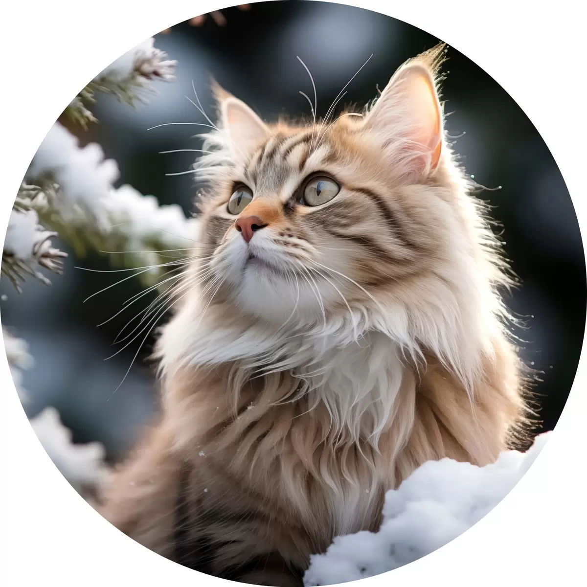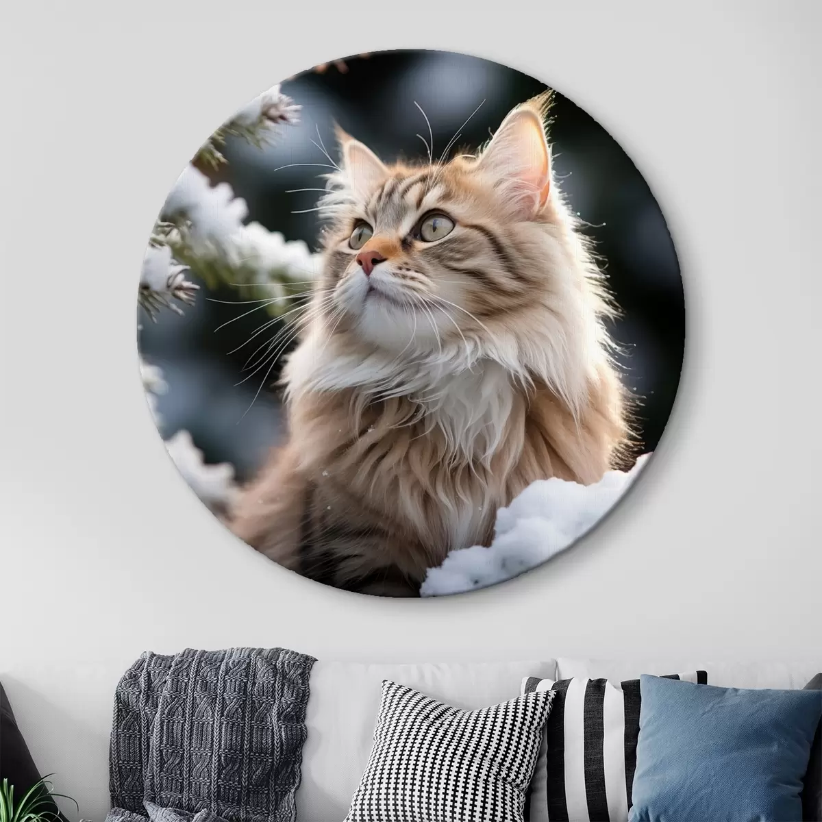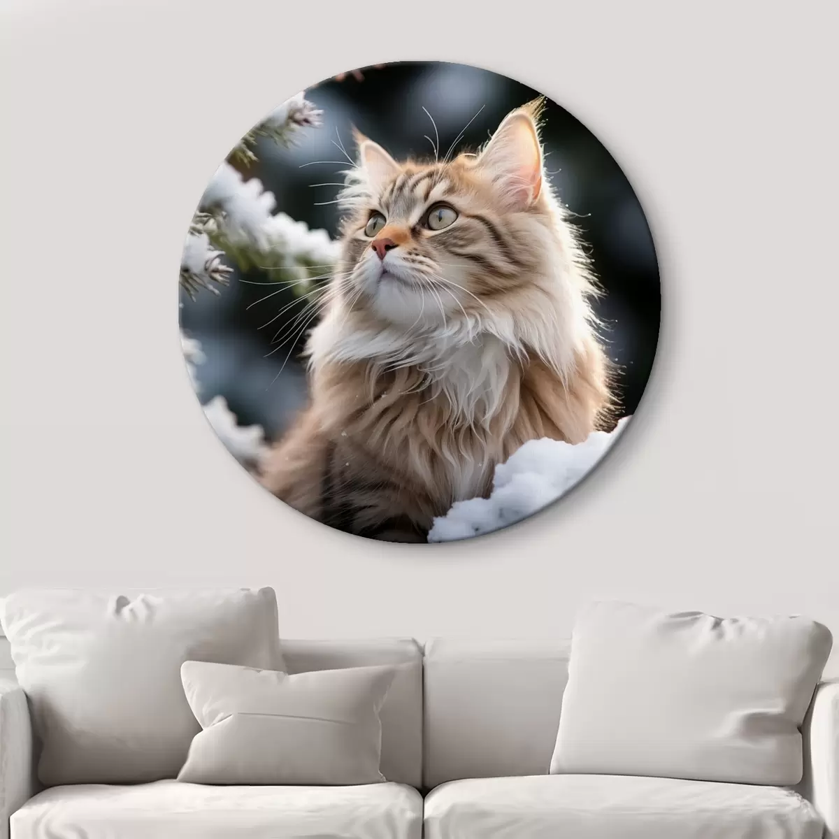 Ronde schilderijen Een pluizige roodharige kat zit in de sneeuw op een donkere achtergrond r41435