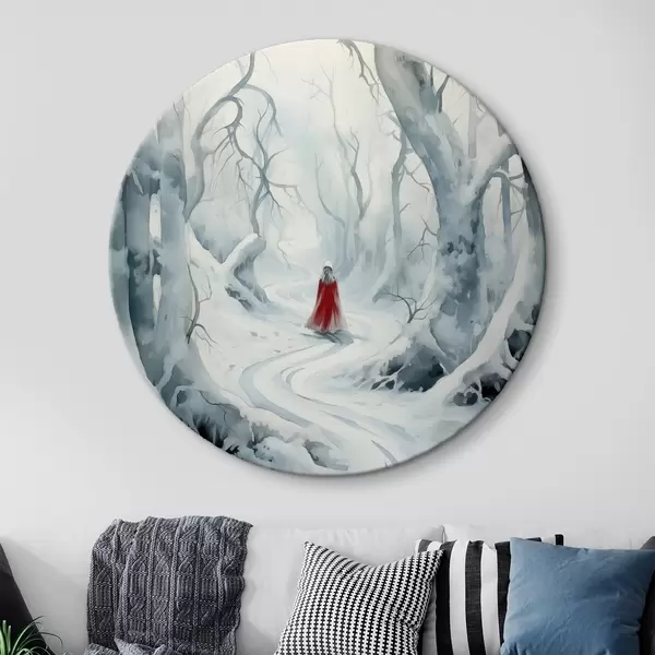Ronde schilderijen Een man in een rode jas midden in een winters bos r41438