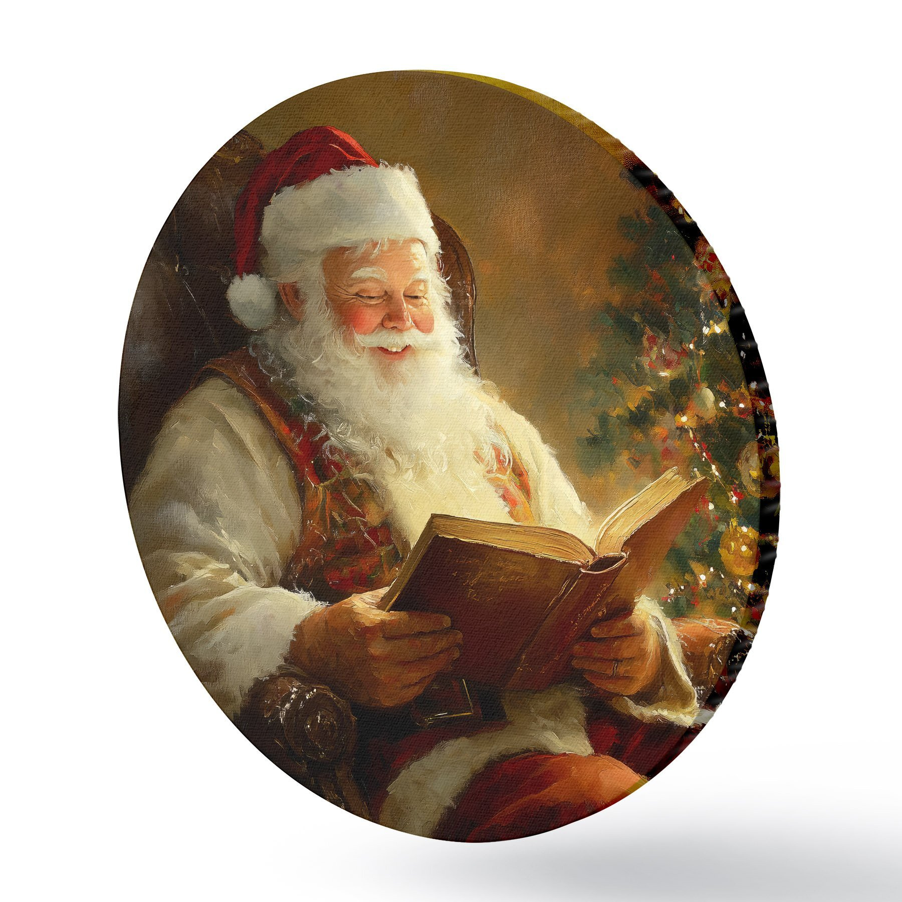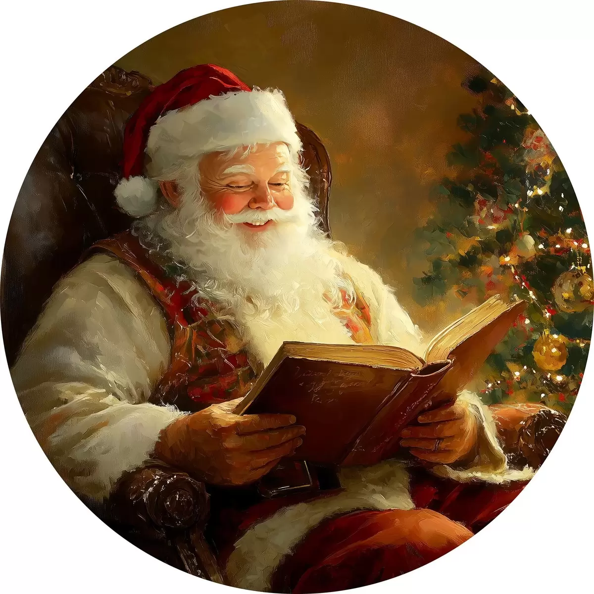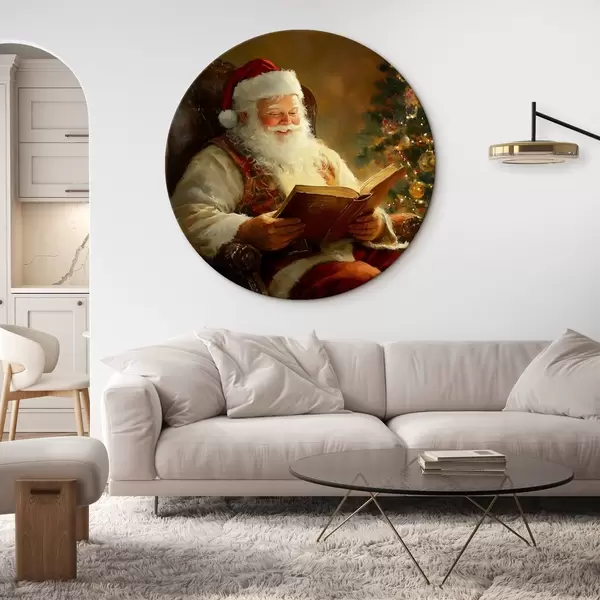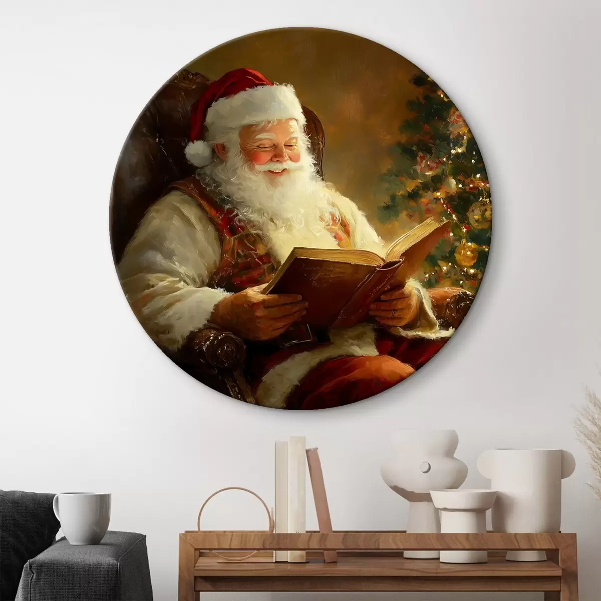 Ronde schilderijen De Kerstman leest een boek bij de kerstboom r42100