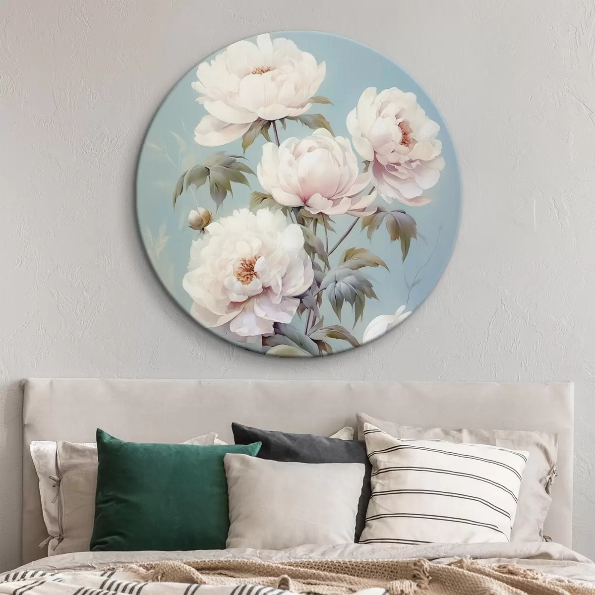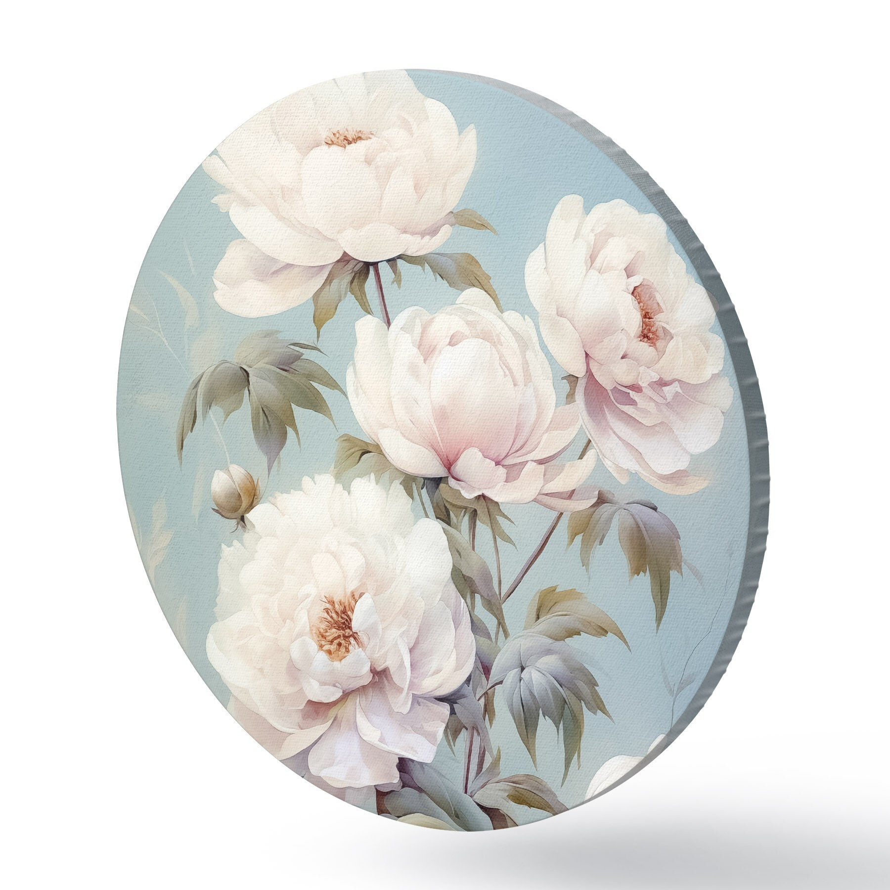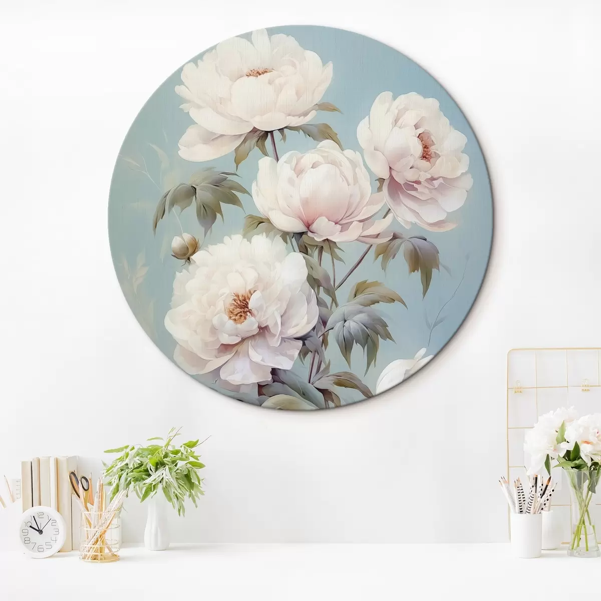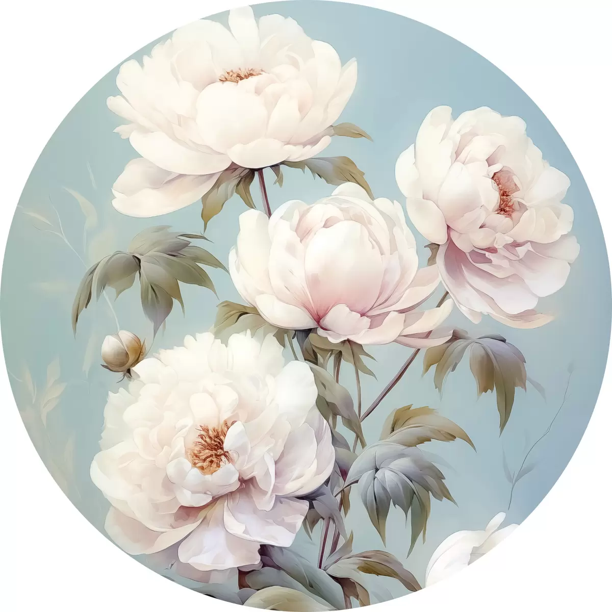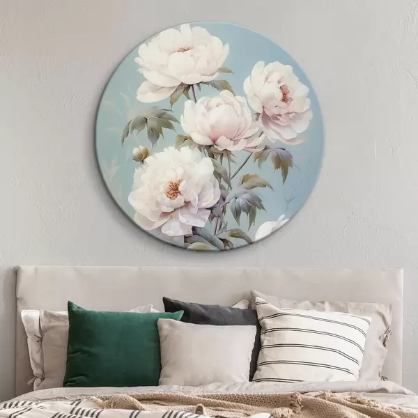 Ronde schilderijen Pioenrozen op pastelblauwe achtergrond vintage stijl r42123