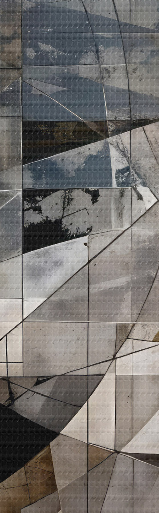 Afbeelding Een abstracte moderne geometrische compositie met overlappende vormen en print in grijstinten, zwart en beige Nr r42212