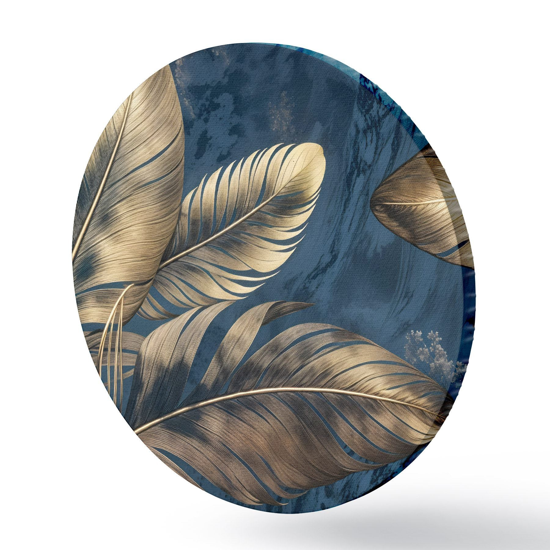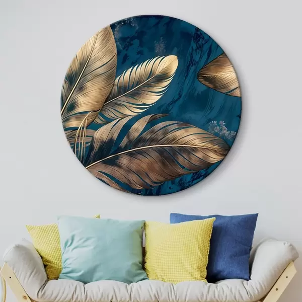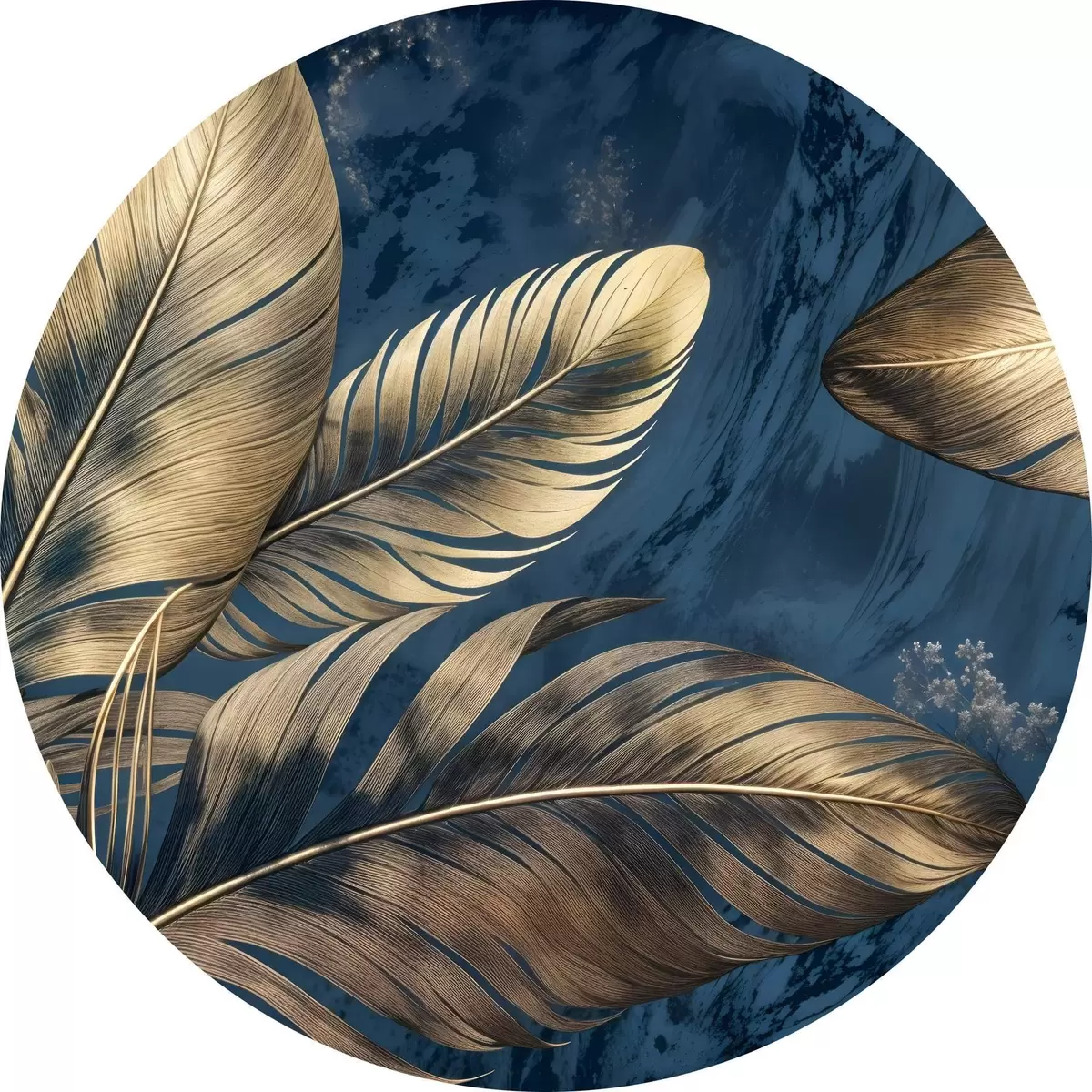 Ronde schilderijen Gele en beige abstracte decoratieve veren drijvend op een donkerblauwe textuurachtergrond r42218