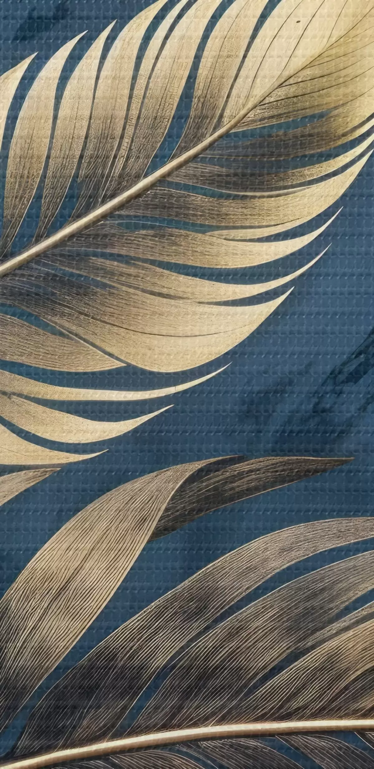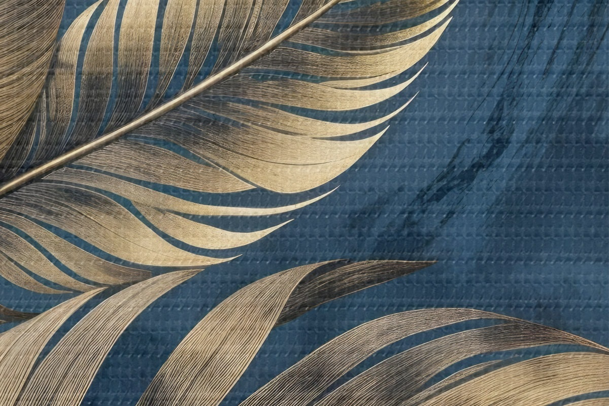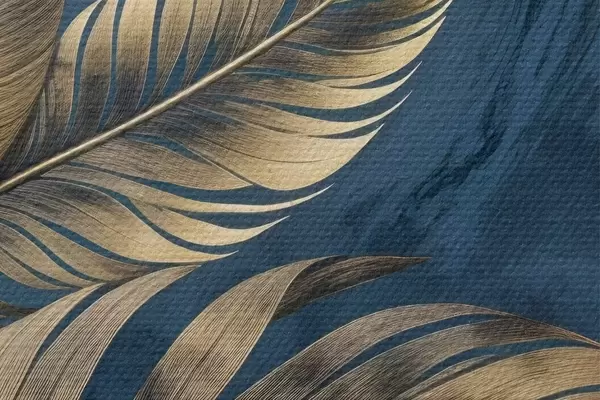 Afbeelding Gele en beige abstracte decoratieve veren drijvend op een donkerblauwe textuurachtergrond Nr r42218
