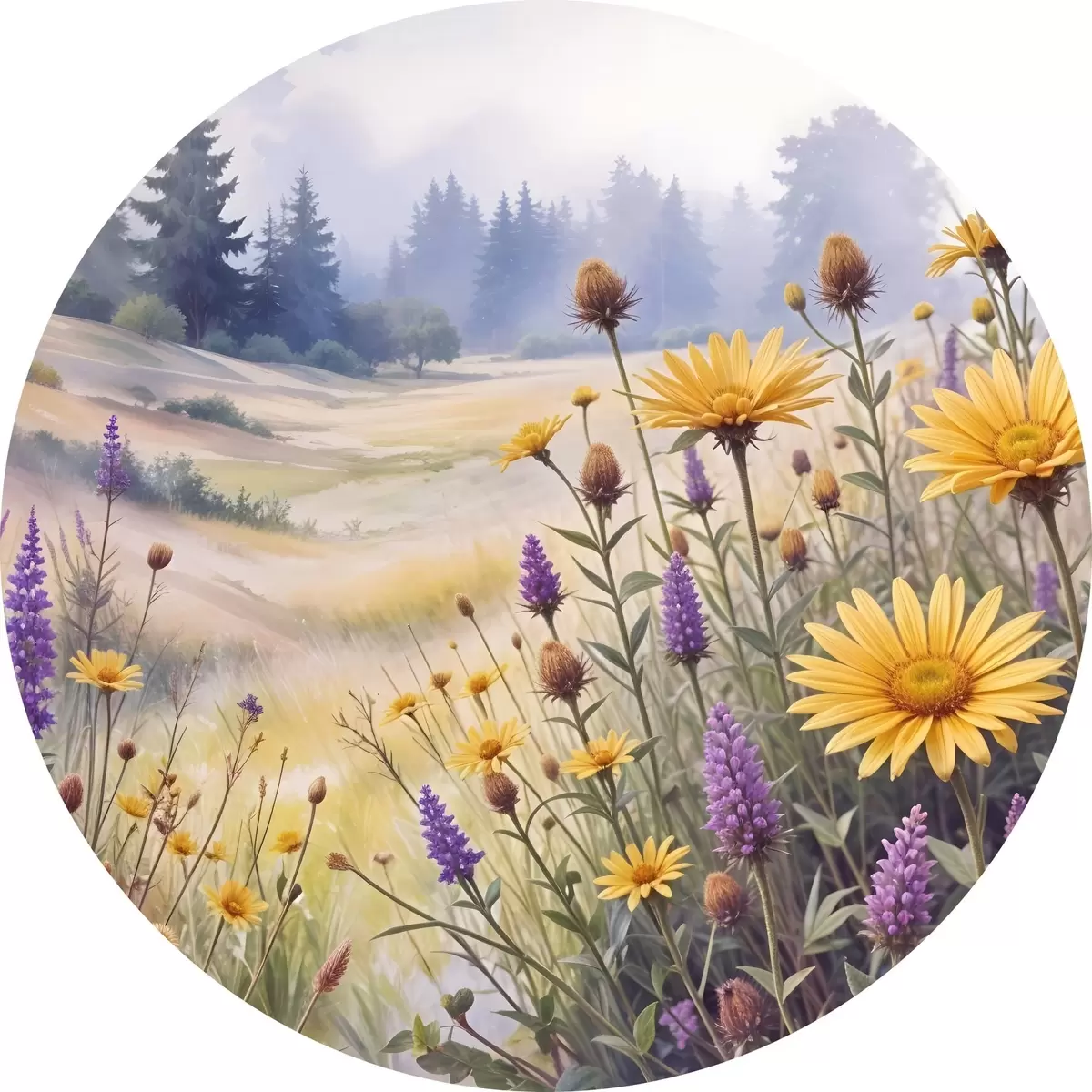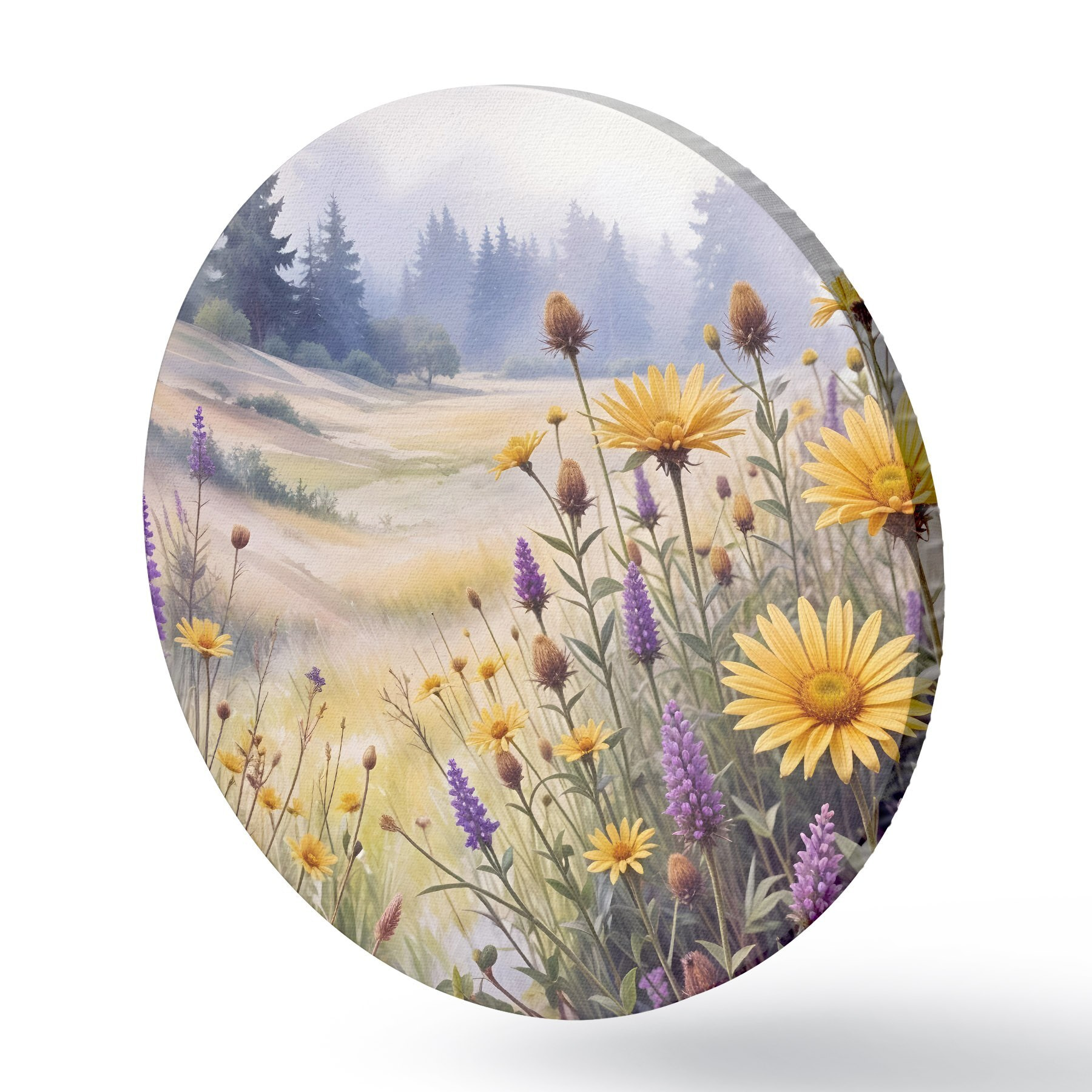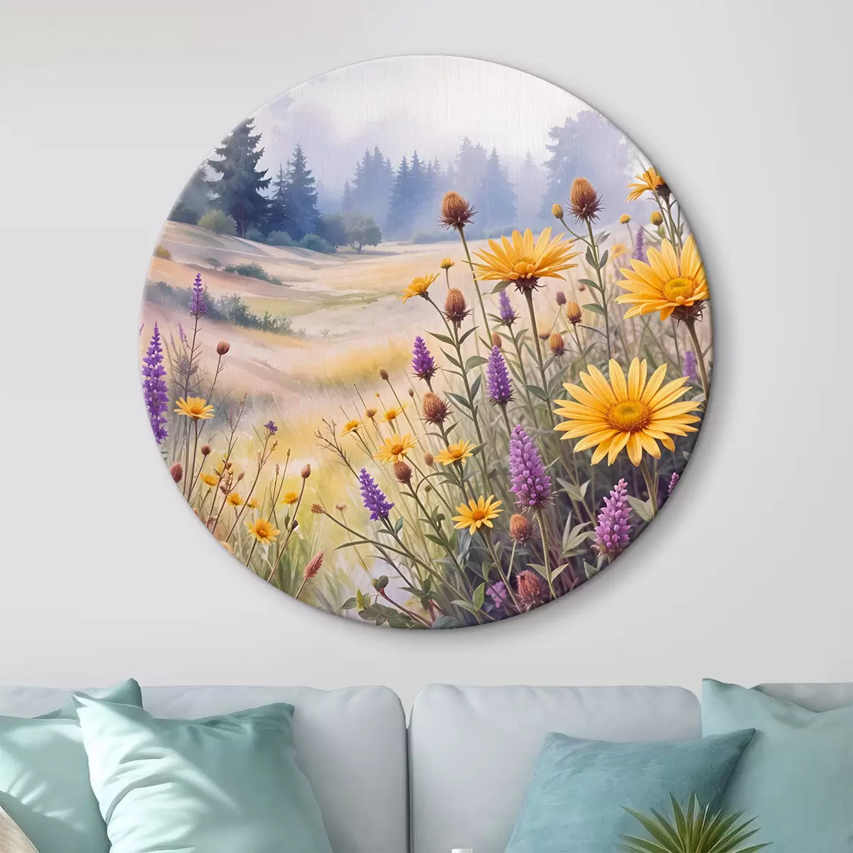 Ronde schilderijen Een veld met gele zonnebloemen en paarse wilde bloemen in een mistig boslandschap met pijnbomen op de achtergrond r42223