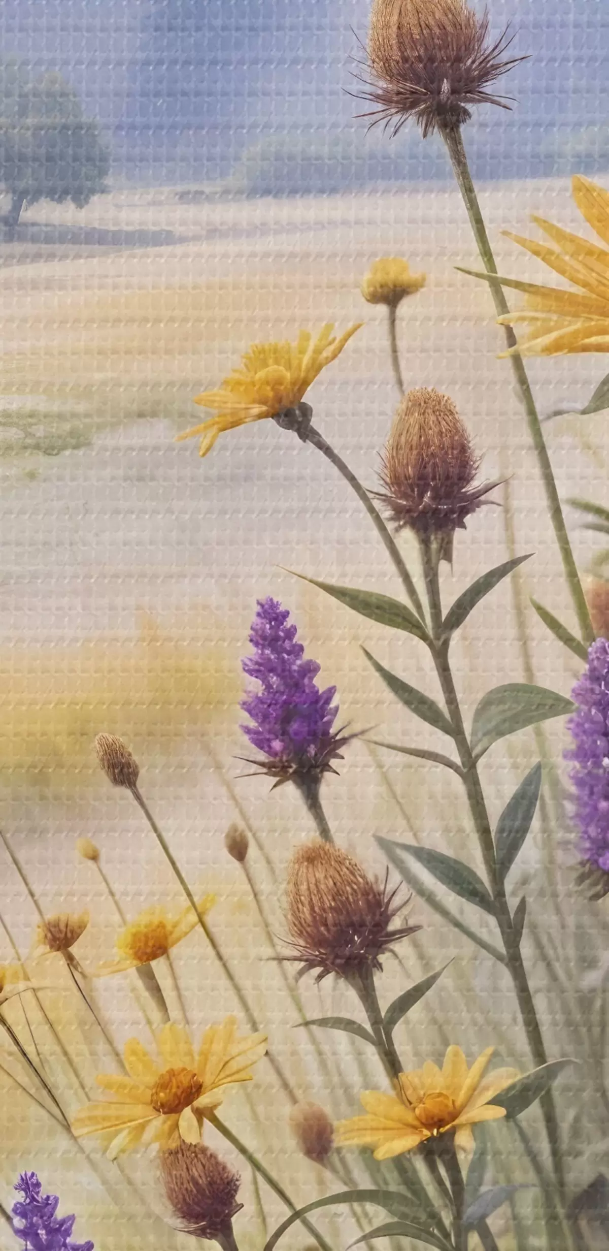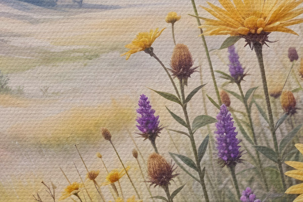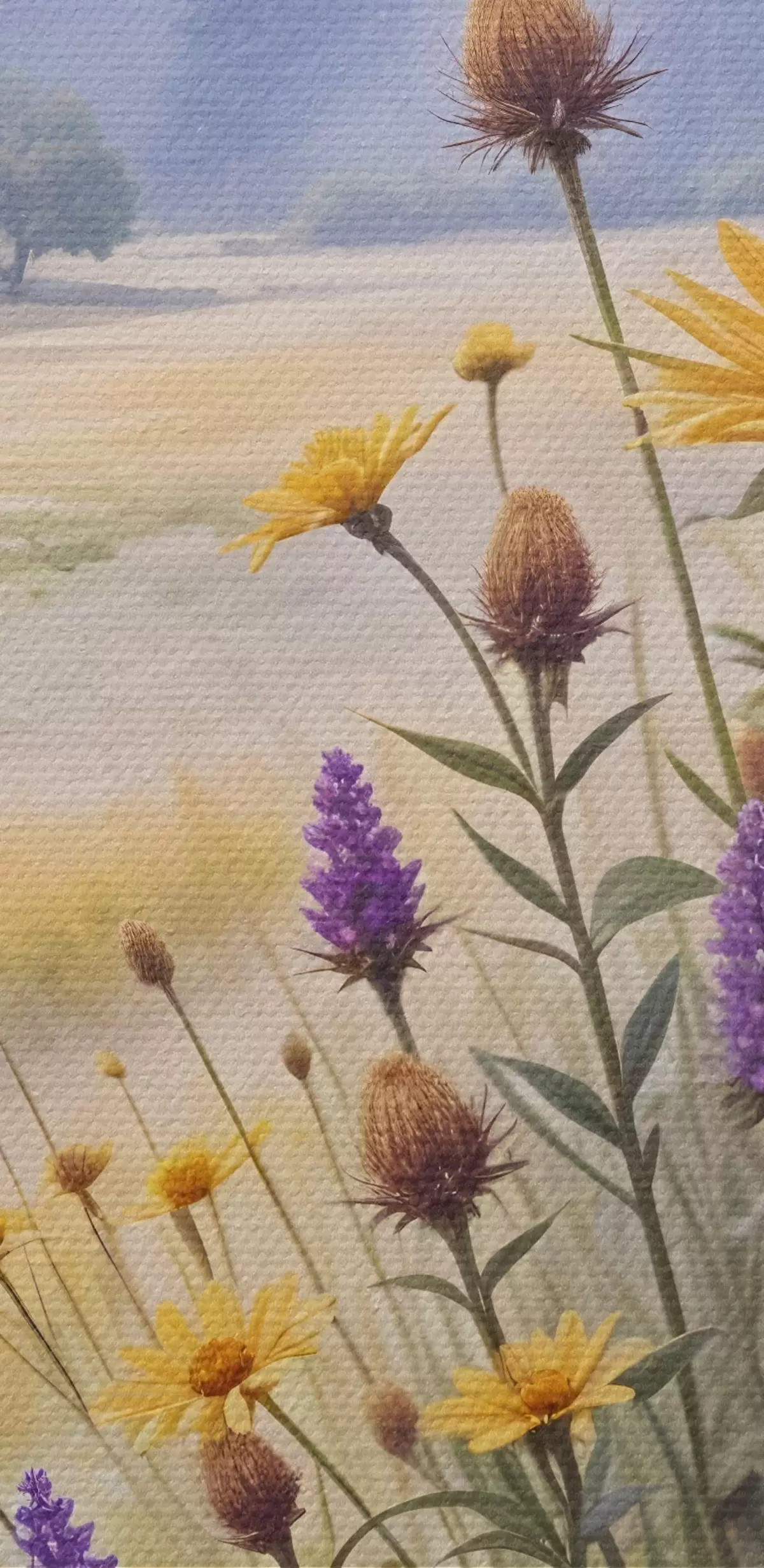 Afbeelding Een veld met gele zonnebloemen en paarse wilde bloemen in een mistig boslandschap met pijnbomen op de achtergrond Nr r42223