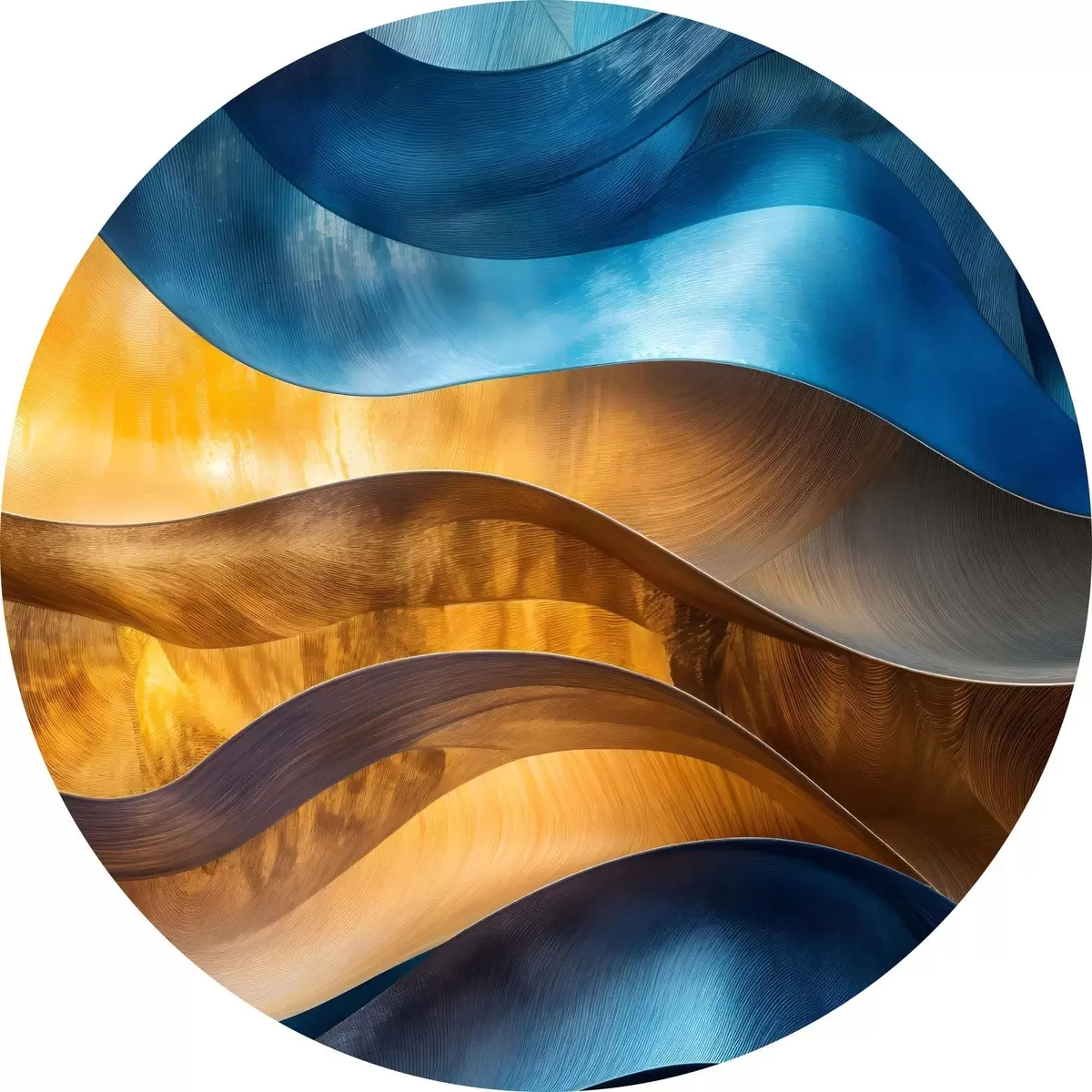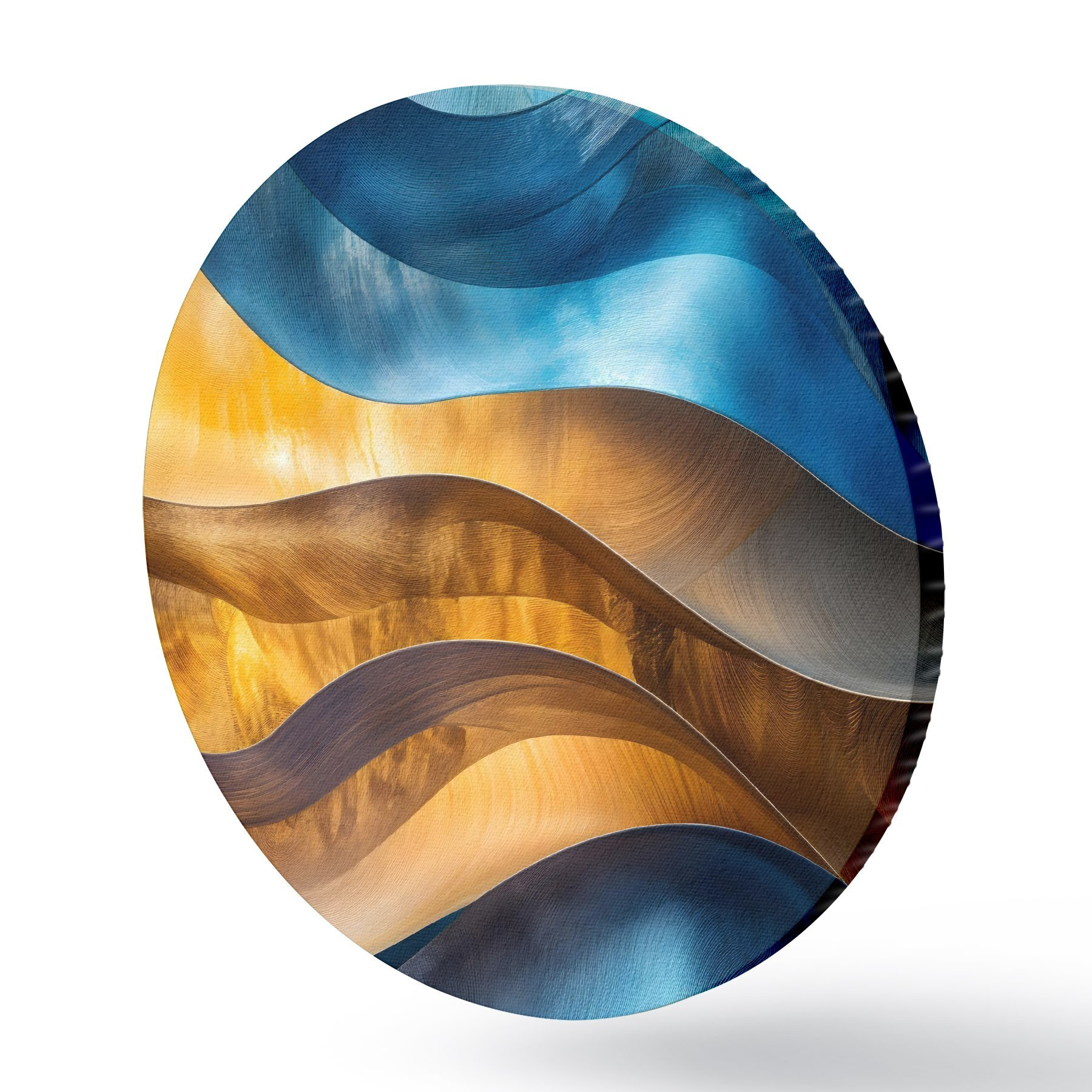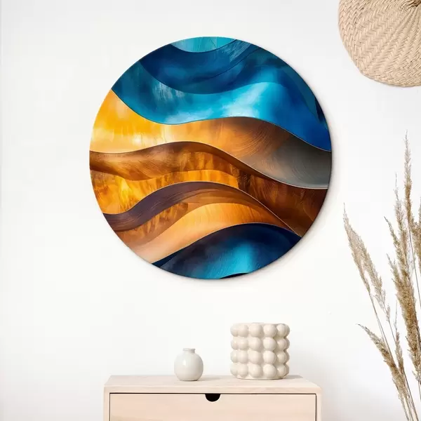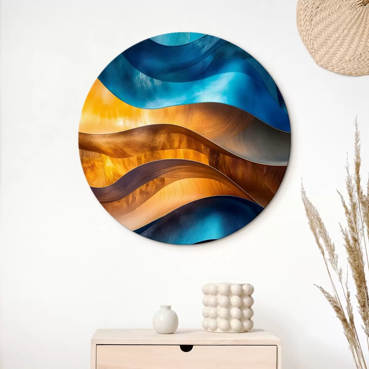 Ronde schilderijen Abstracte moderne kunst golvende vormen in tinten blauw, oranje en bruin r42224