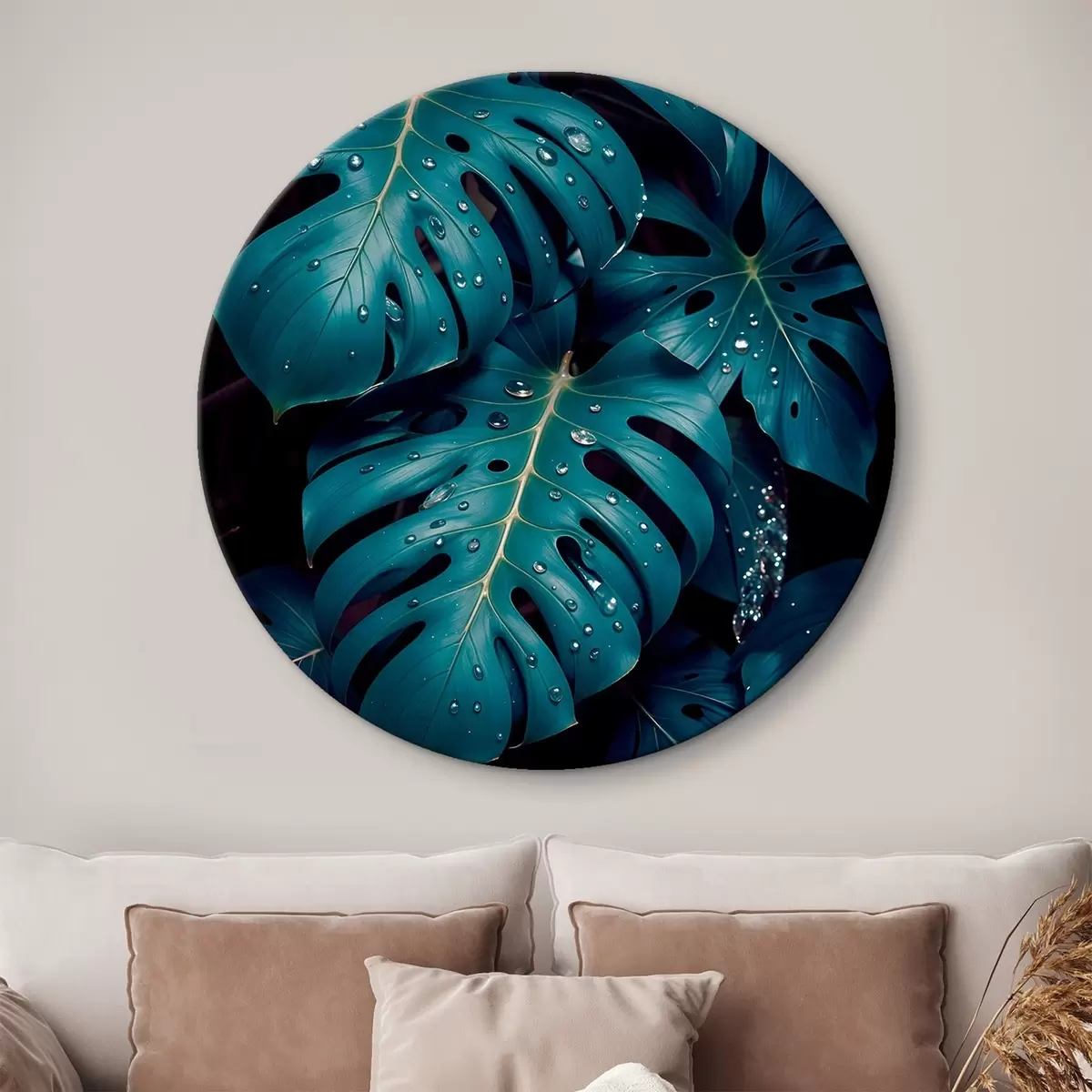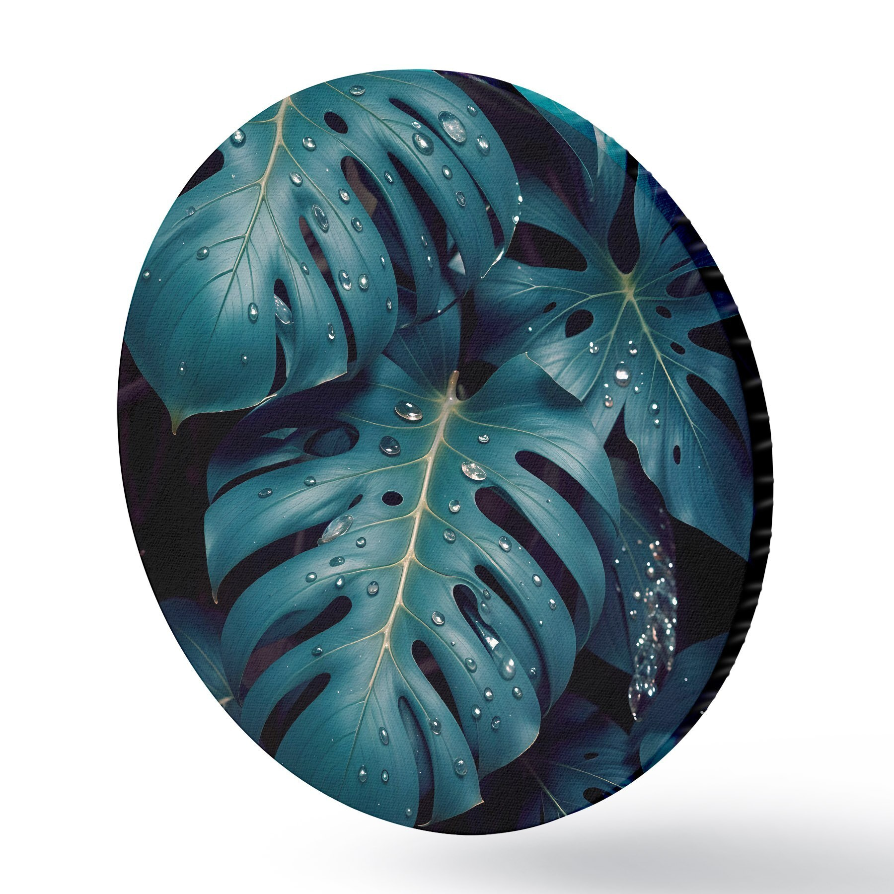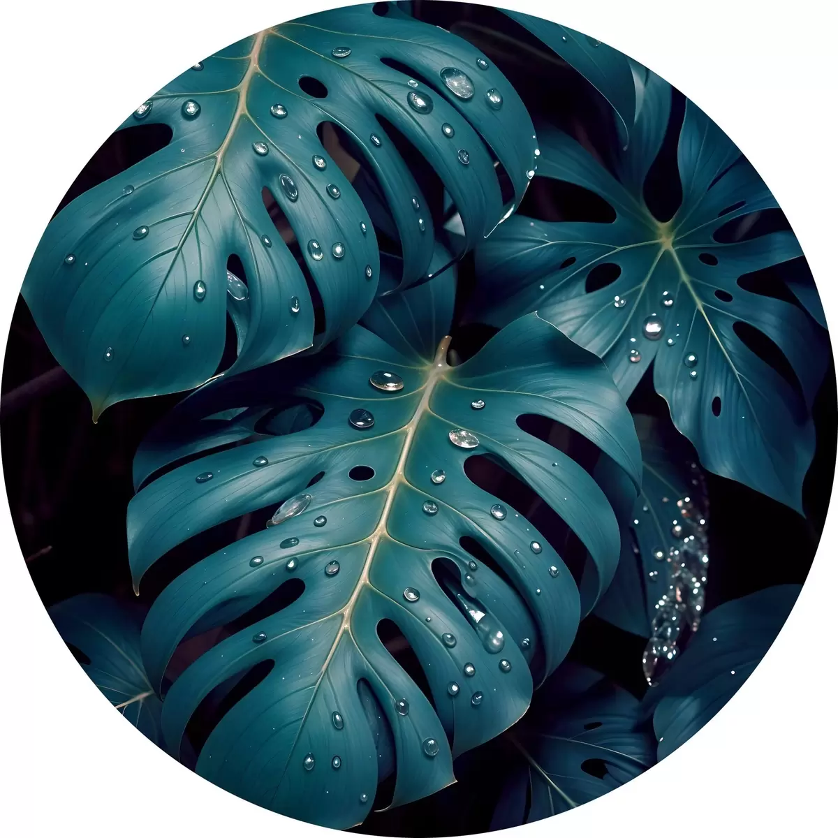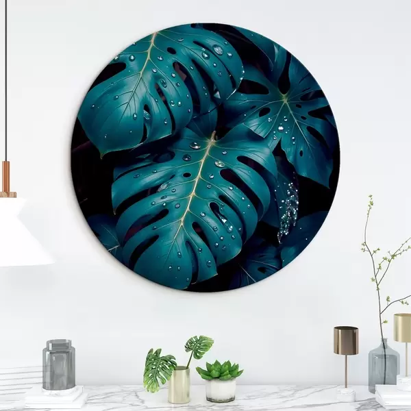 Ronde schilderijen Weelderige tropische monsterabladeren met waterdruppels tegen een donkere achtergrond, waardoor een stemmige en sfeervolle print ontstaat r42233