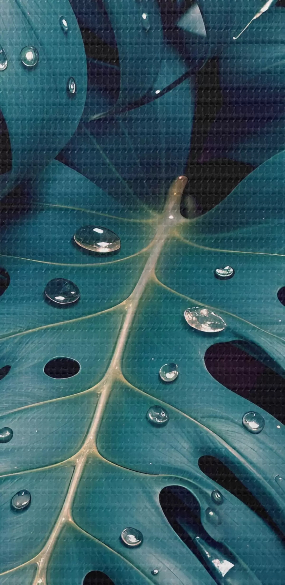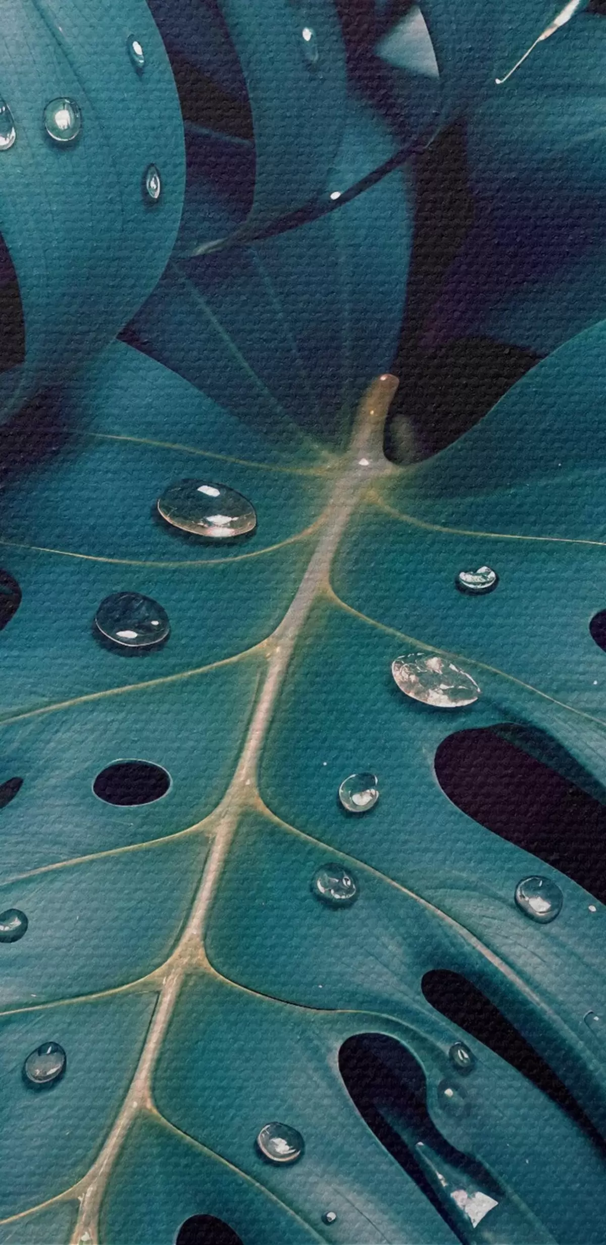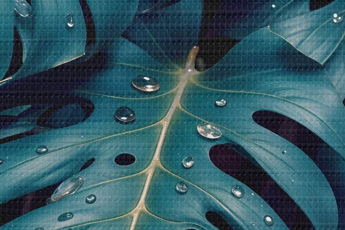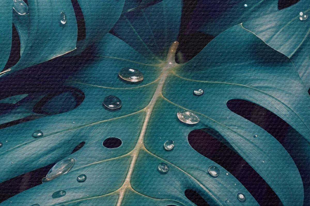 Afbeelding Weelderige tropische monsterabladeren met waterdruppels tegen een donkere achtergrond, waardoor een stemmige en sfeervolle print ontstaat Nr r42233
