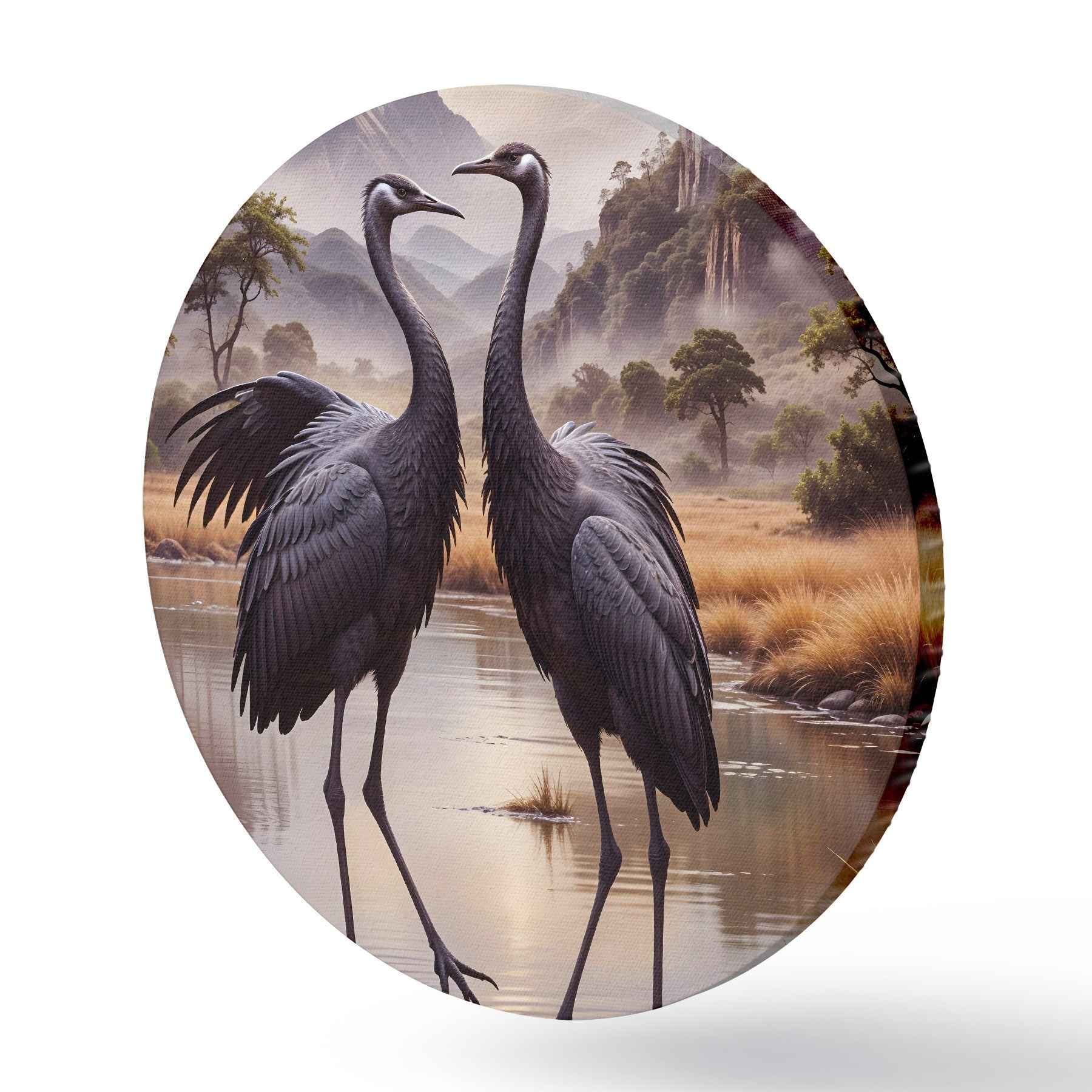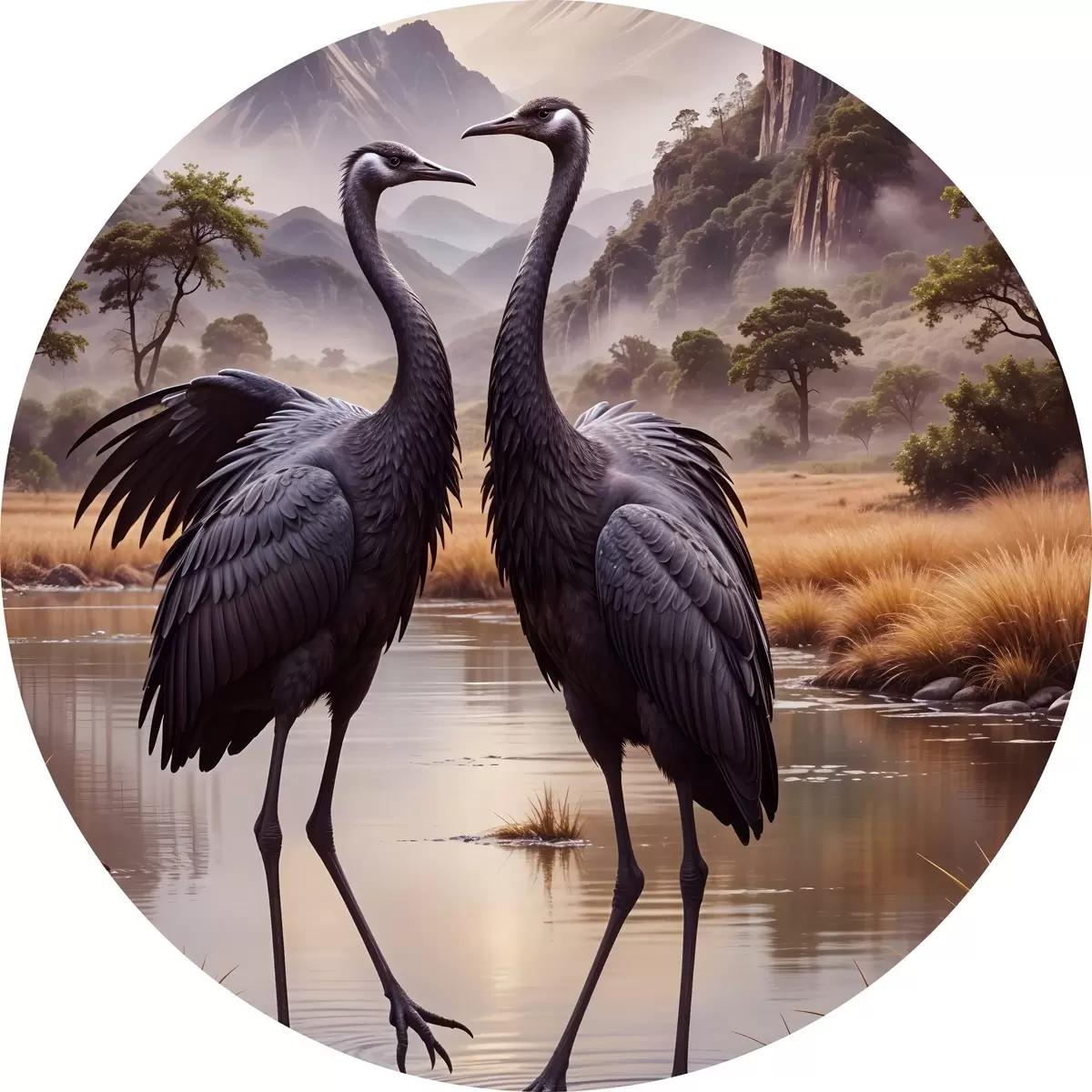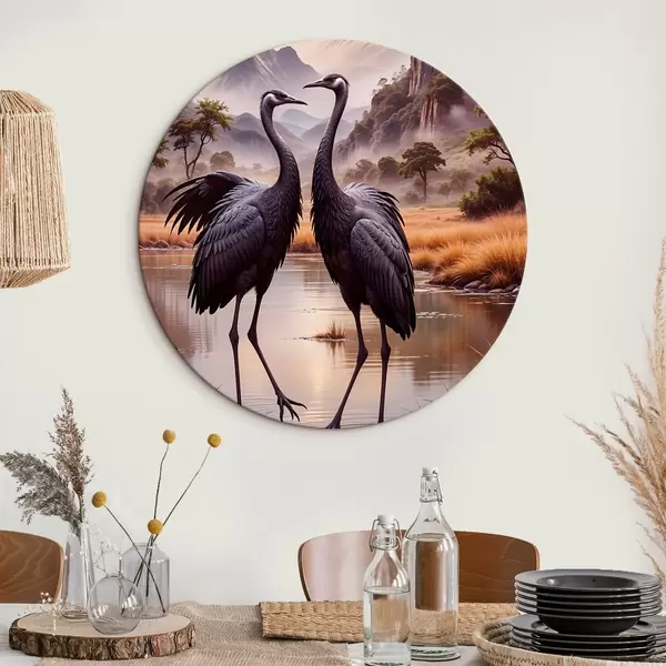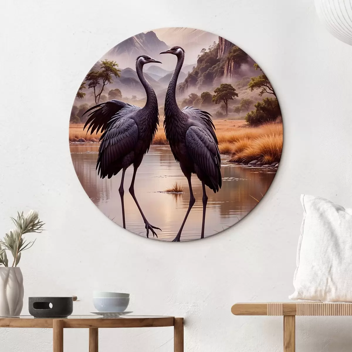 Ronde schilderijen Twee grote zwarte kraanvogels staan in een ondiepe vijver, met een berglandschap op de achtergrond r42240