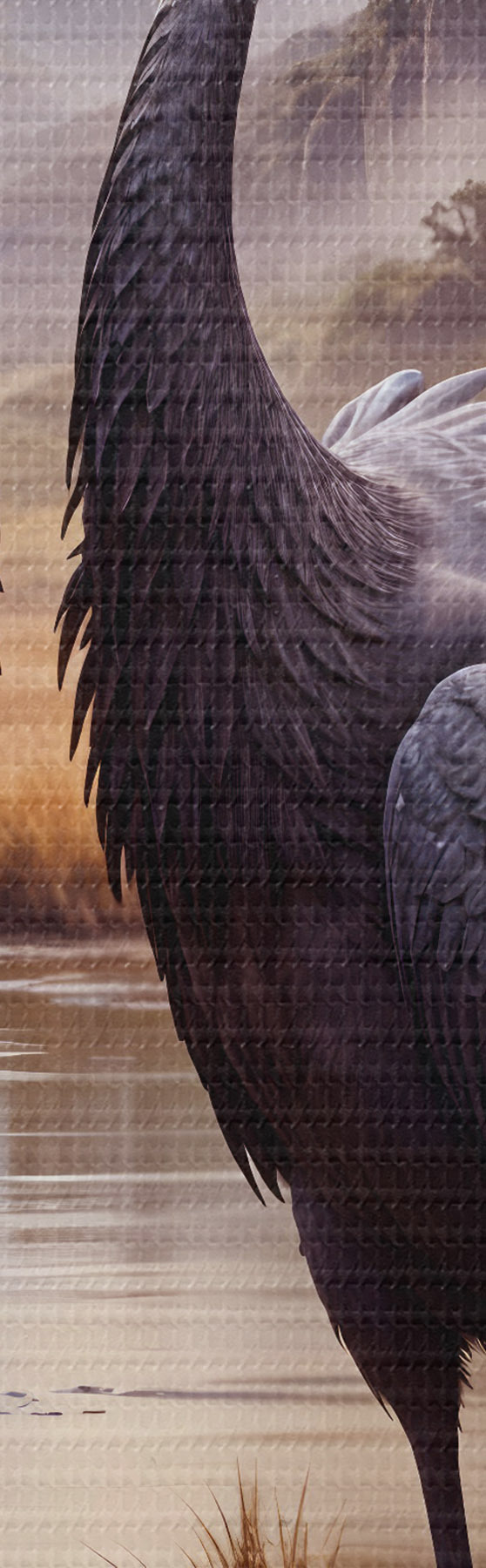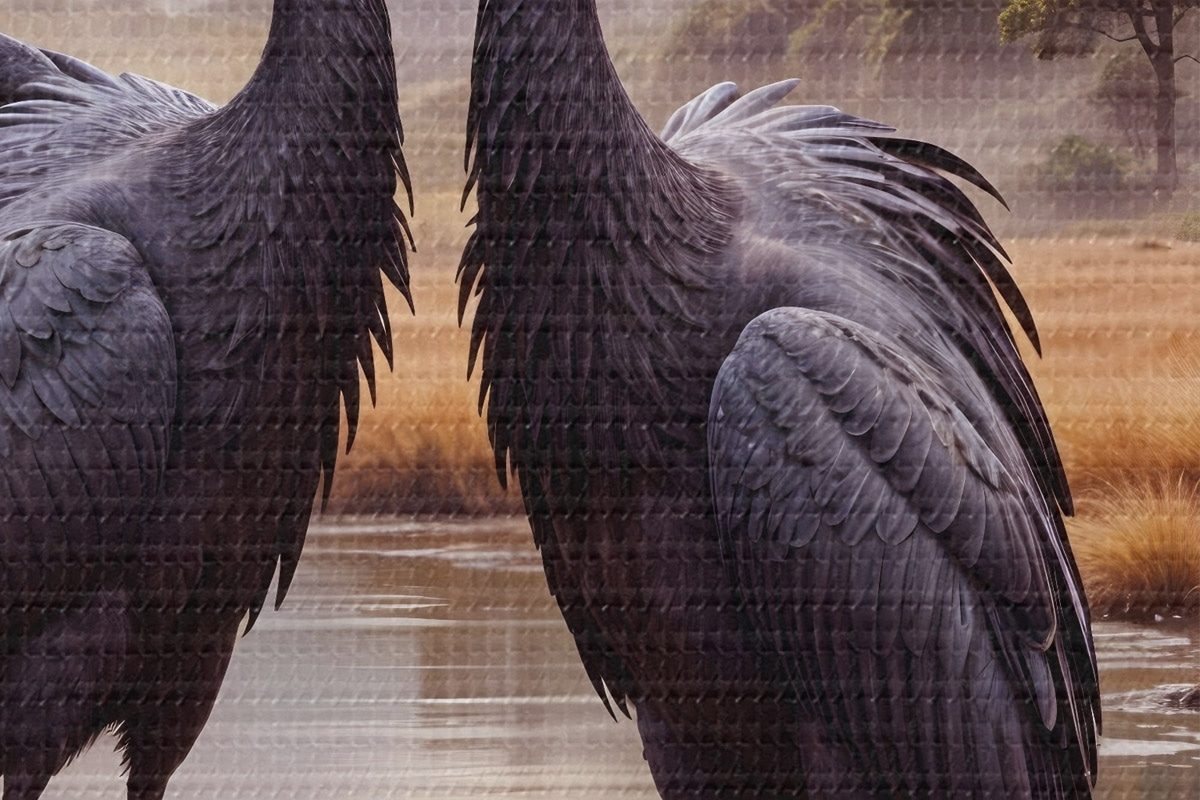 Afbeelding Twee grote zwarte kraanvogels staan in een ondiepe vijver, met een berglandschap op de achtergrond Nr r42240