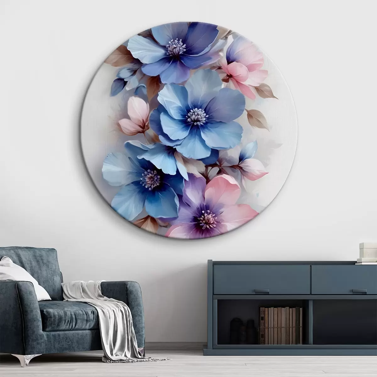 Ronde schilderijen Delicate blauwe en roze bloemen met zachte bloemblaadjes en hartjes, gerangschikt in een prachtige bloemenprint op een lichte achtergrond r42241