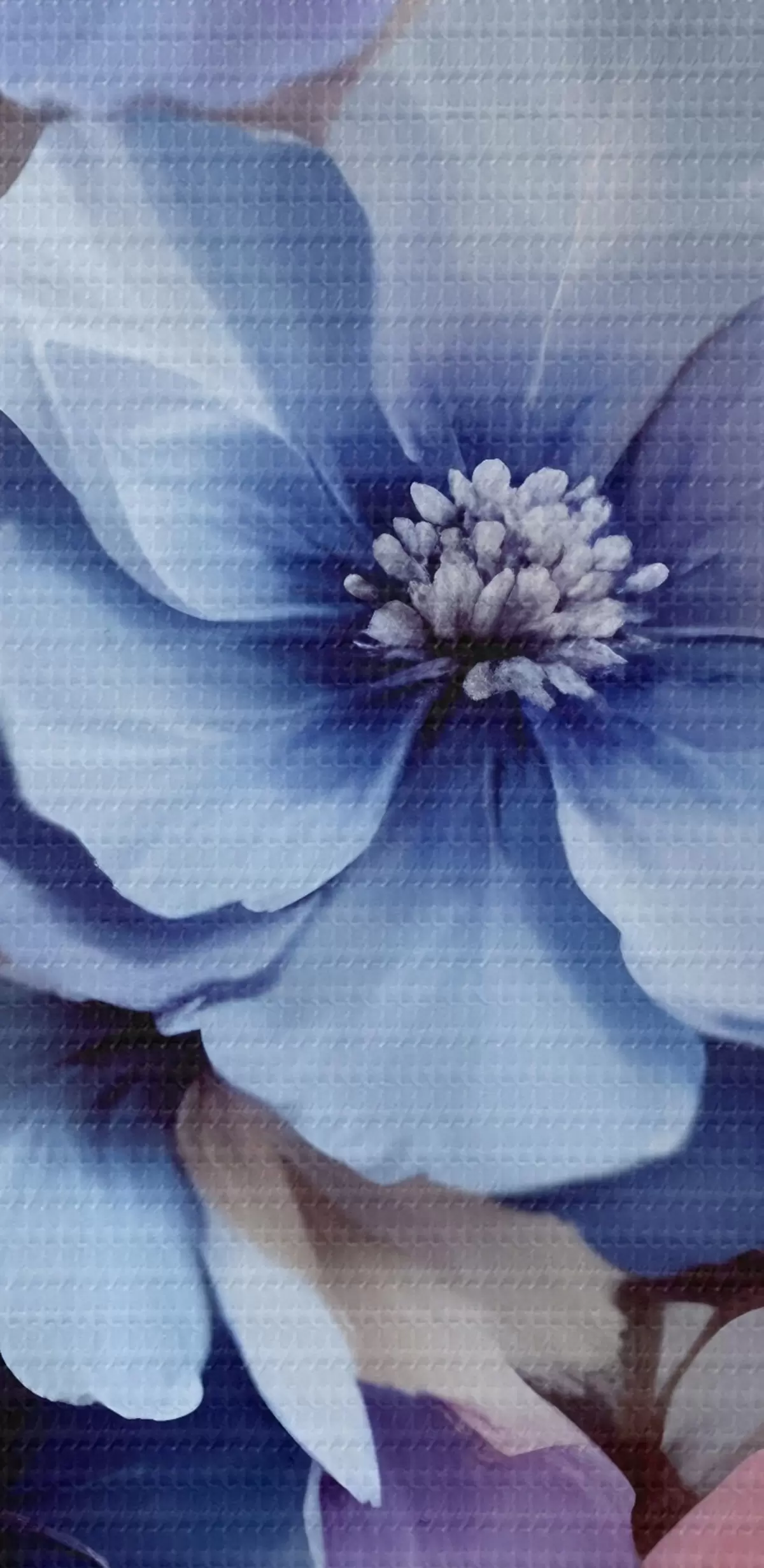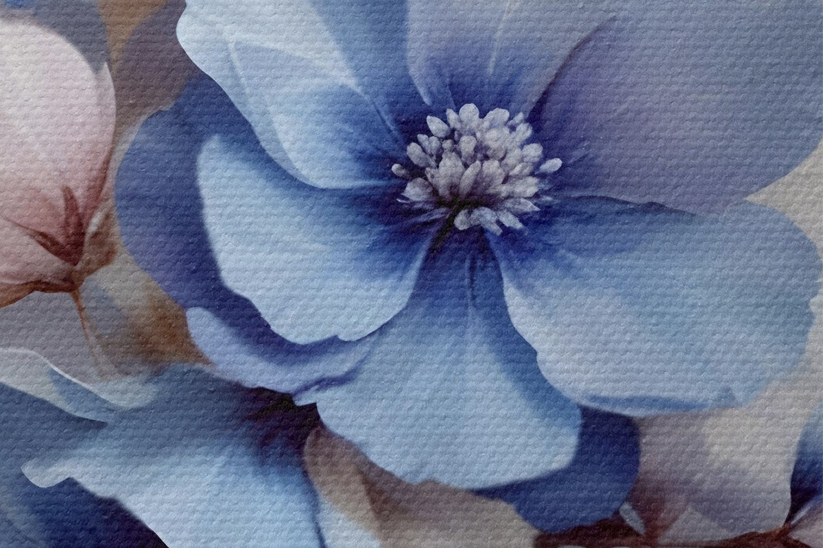 Afbeelding Delicate blauwe en roze bloemen met zachte bloemblaadjes en hartjes, gerangschikt in een prachtige bloemenprint op een lichte achtergrond Nr r42241