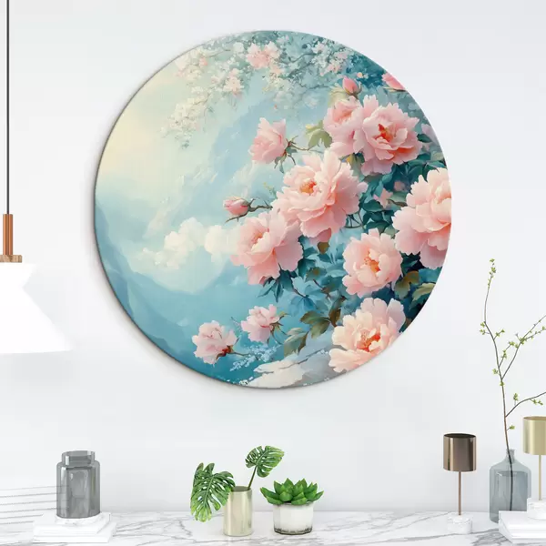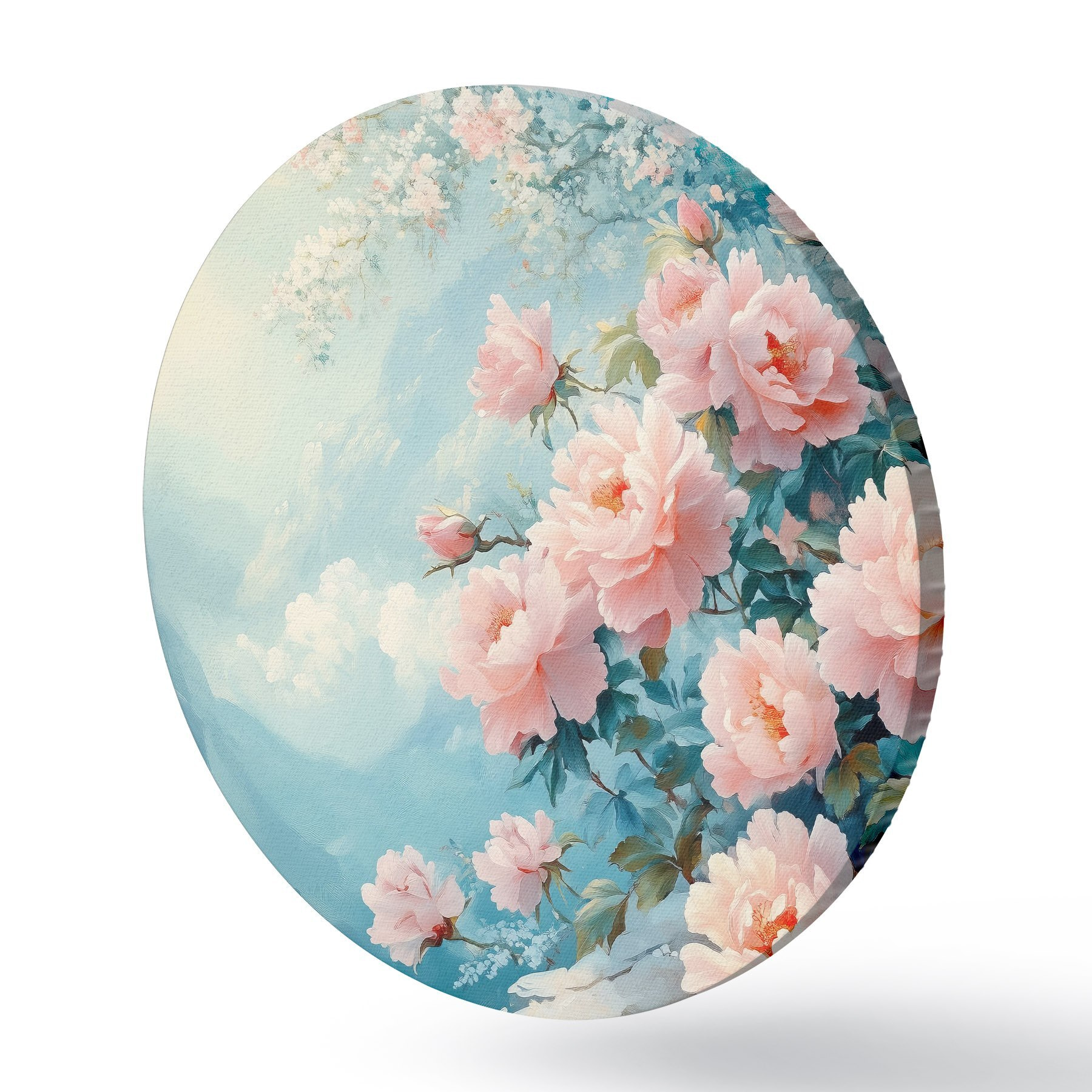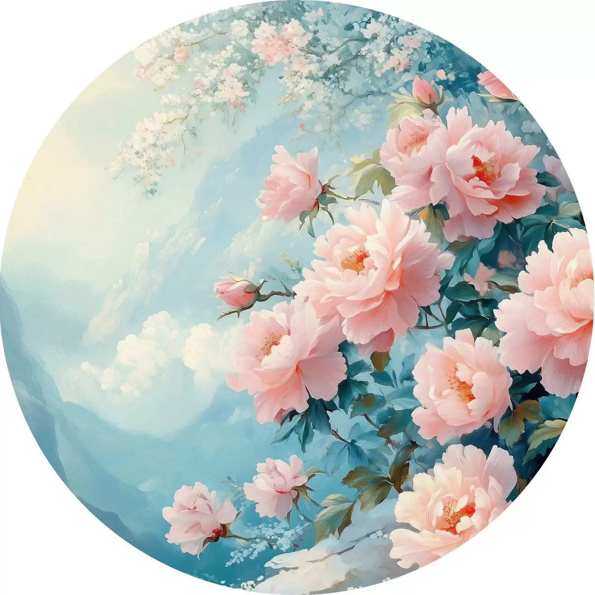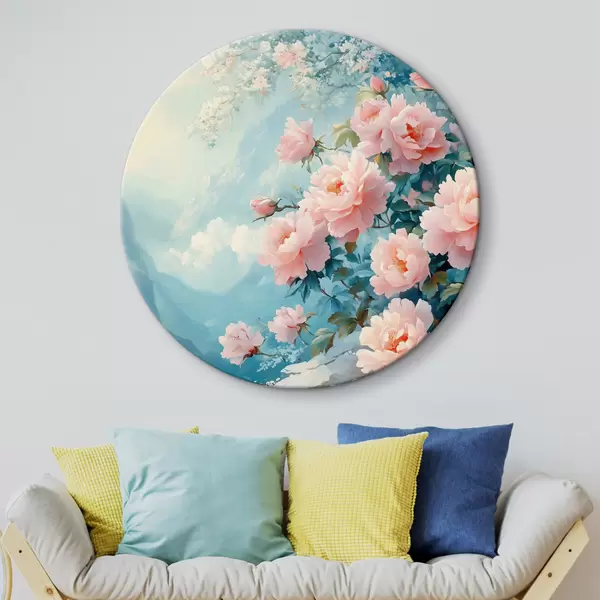Ronde schilderijen Blauwe bergen en bloemen op de voorgrond r42324