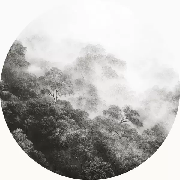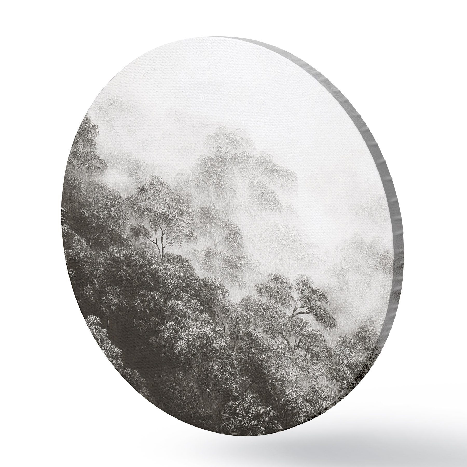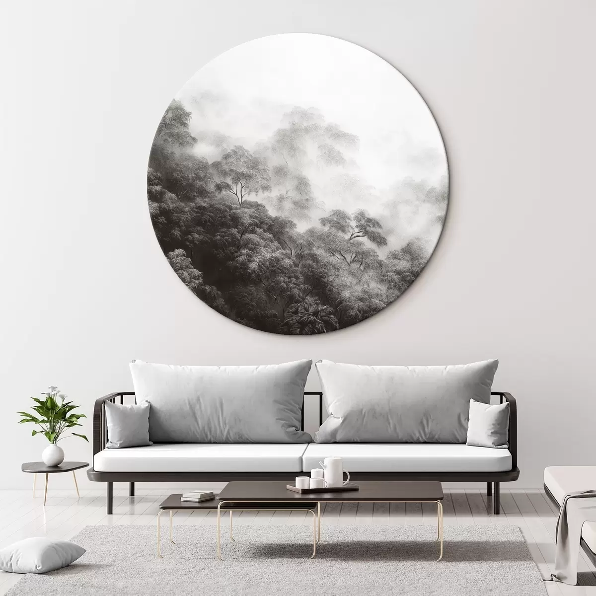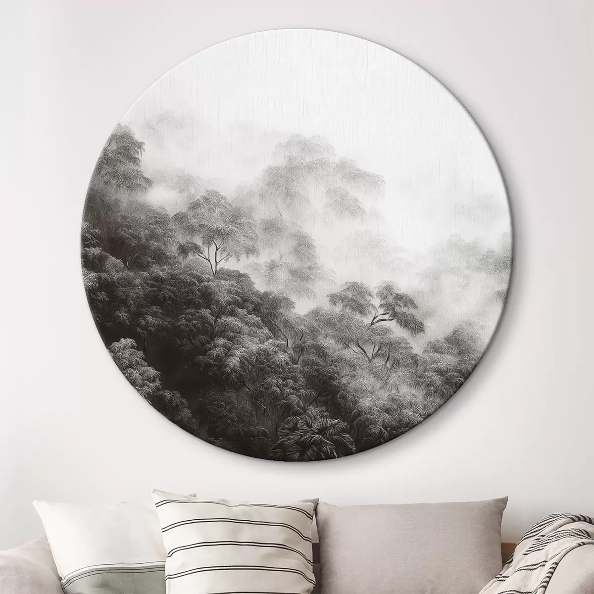Ronde schilderijen Tropisch bos in de mist, palmbomen, grijze kleuren r42371v1