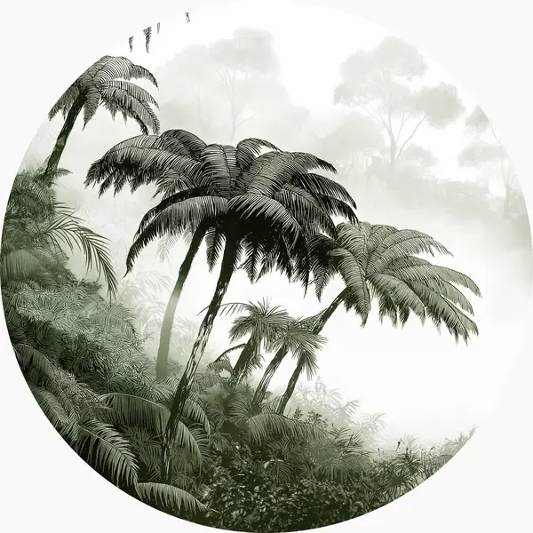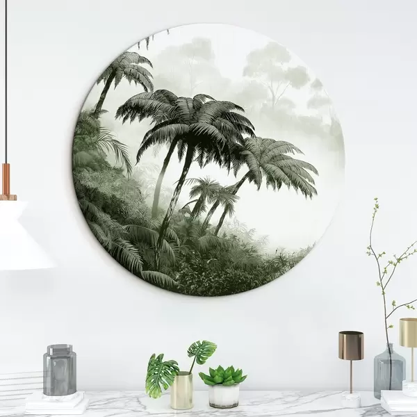 Ronde schilderijen Junglebos in de mist, palmbomen, natuur, groene kleuren r42372v1