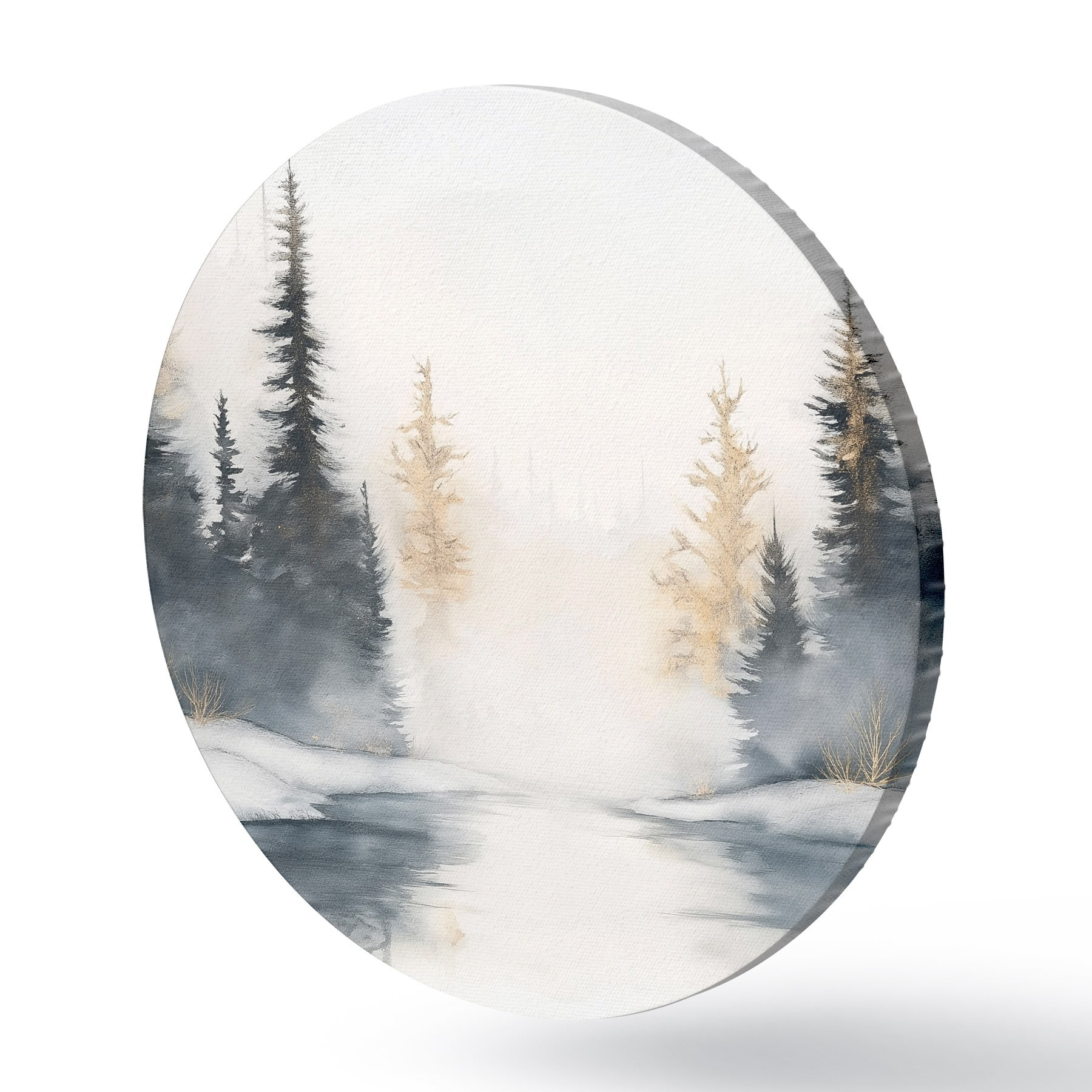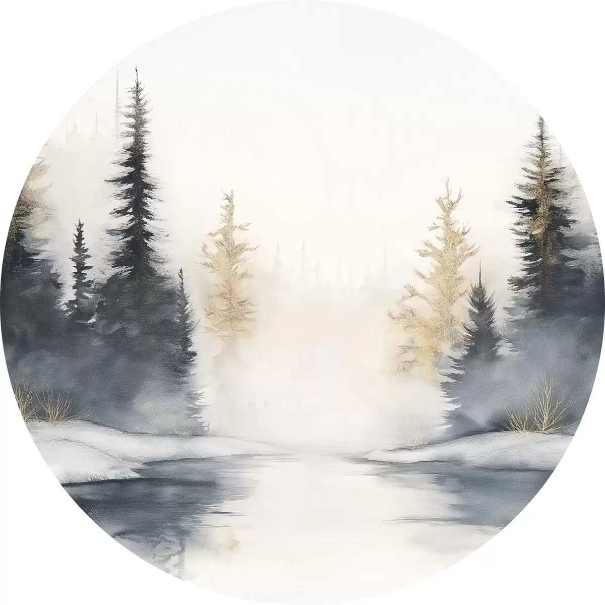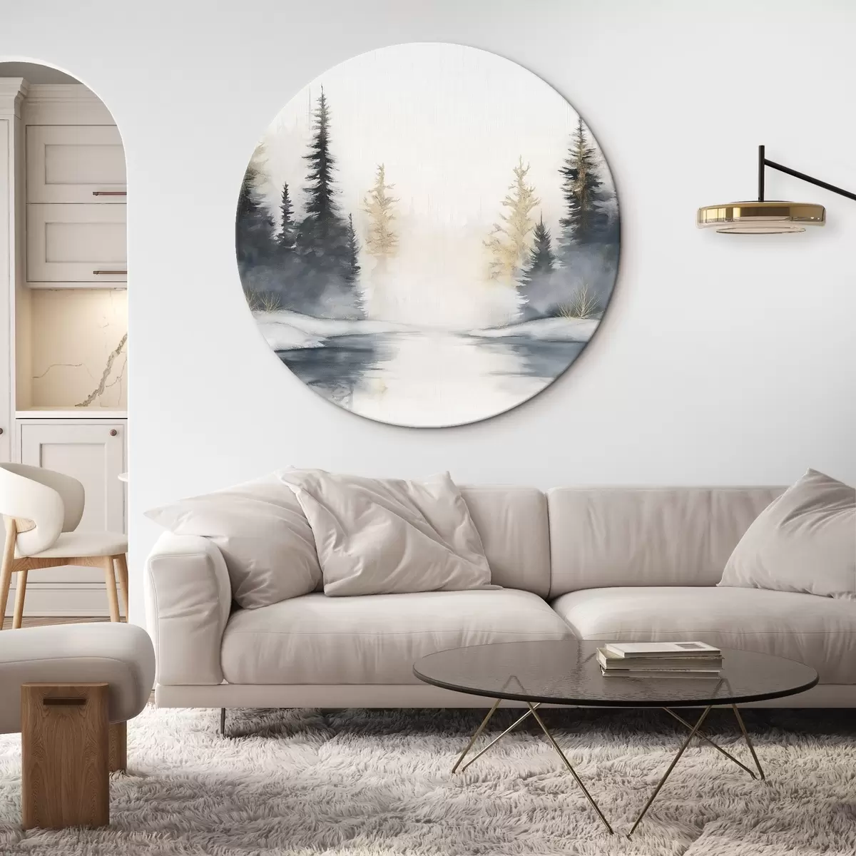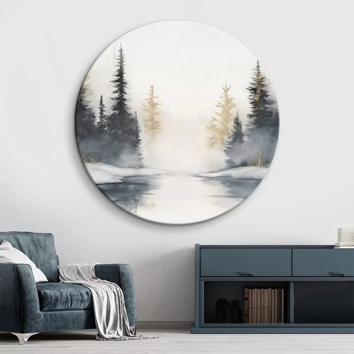 Ronde schilderijen Winterlandschap met rivier en pijnbomen, natuur, bos, mist r42374
