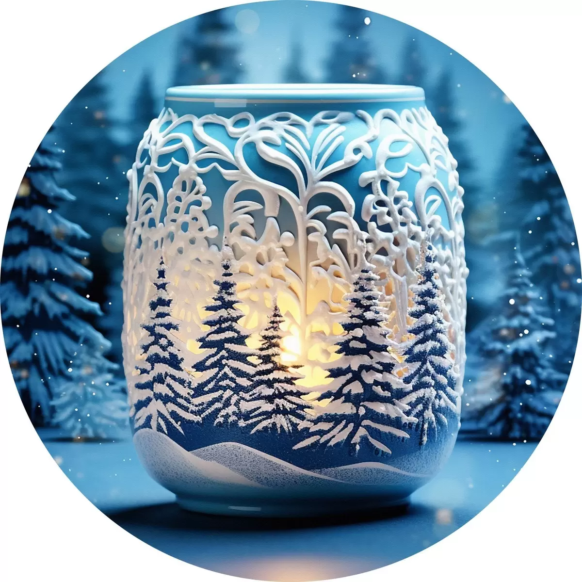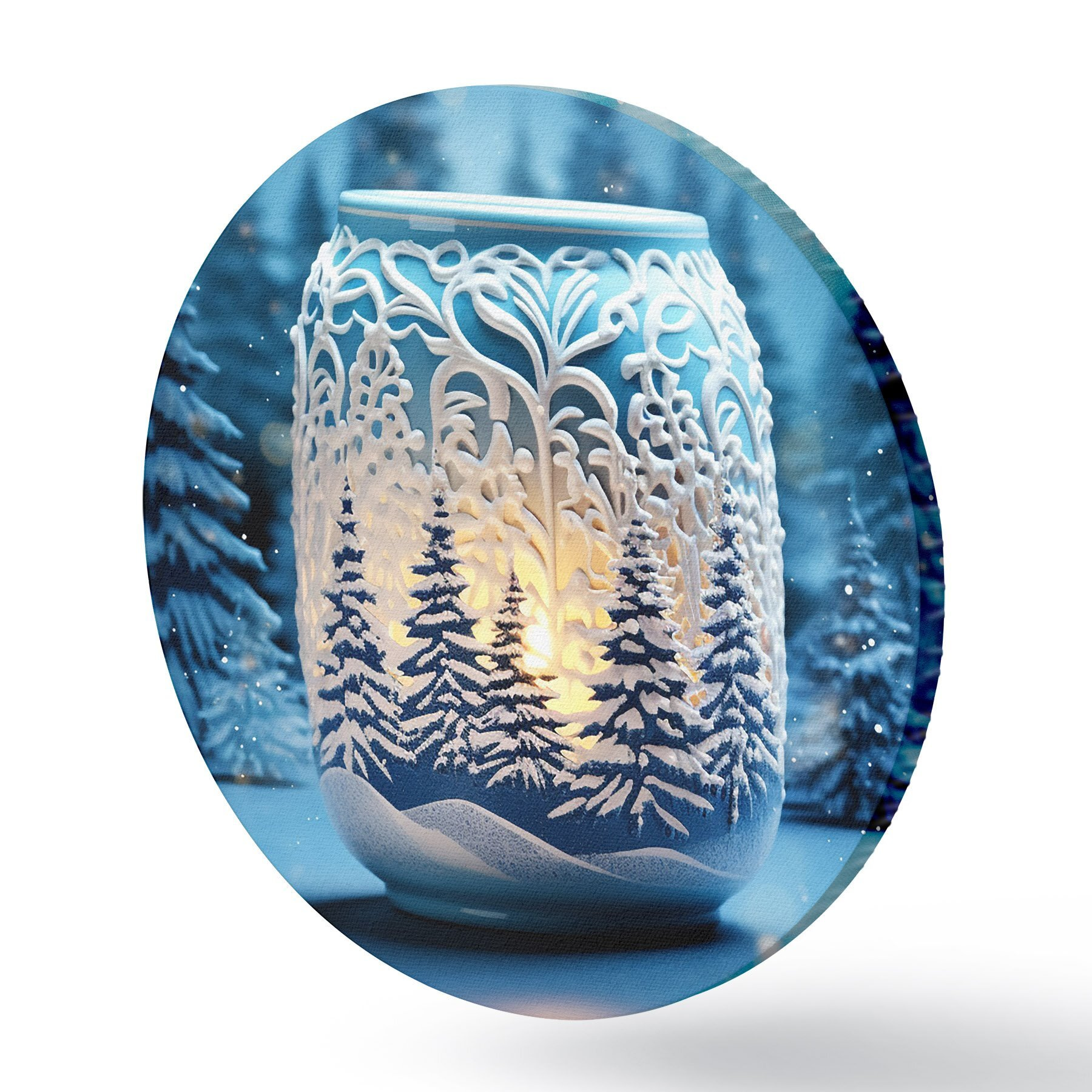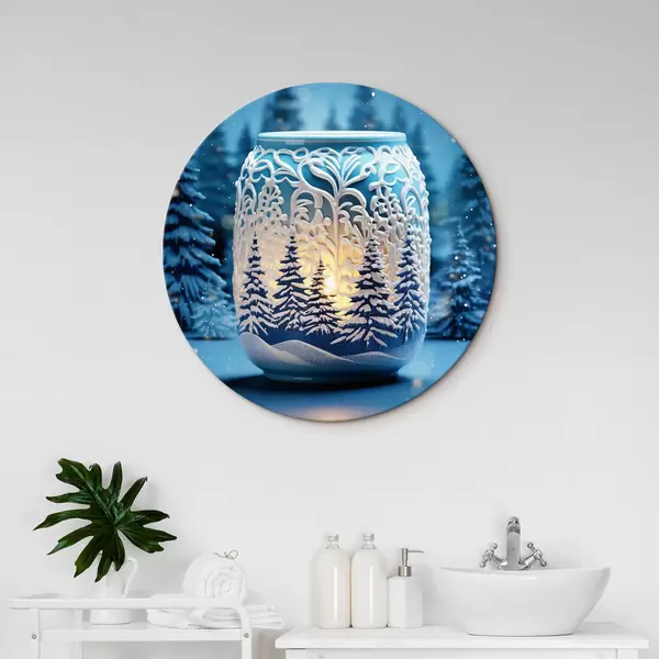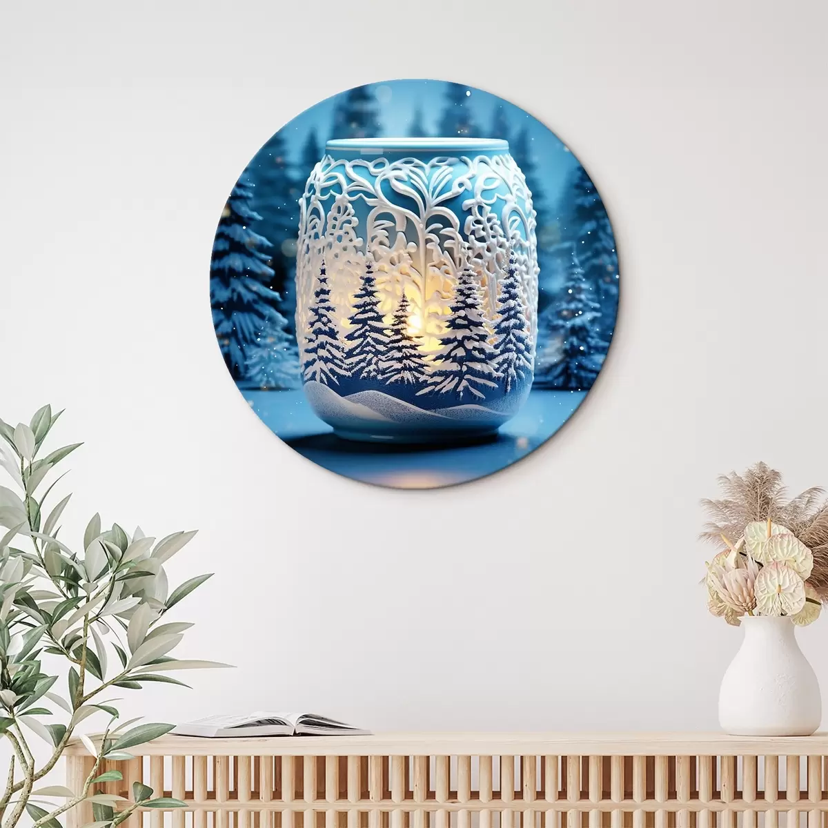 Ronde schilderijen Kaars tegen de achtergrond van een winterlandschap r42380