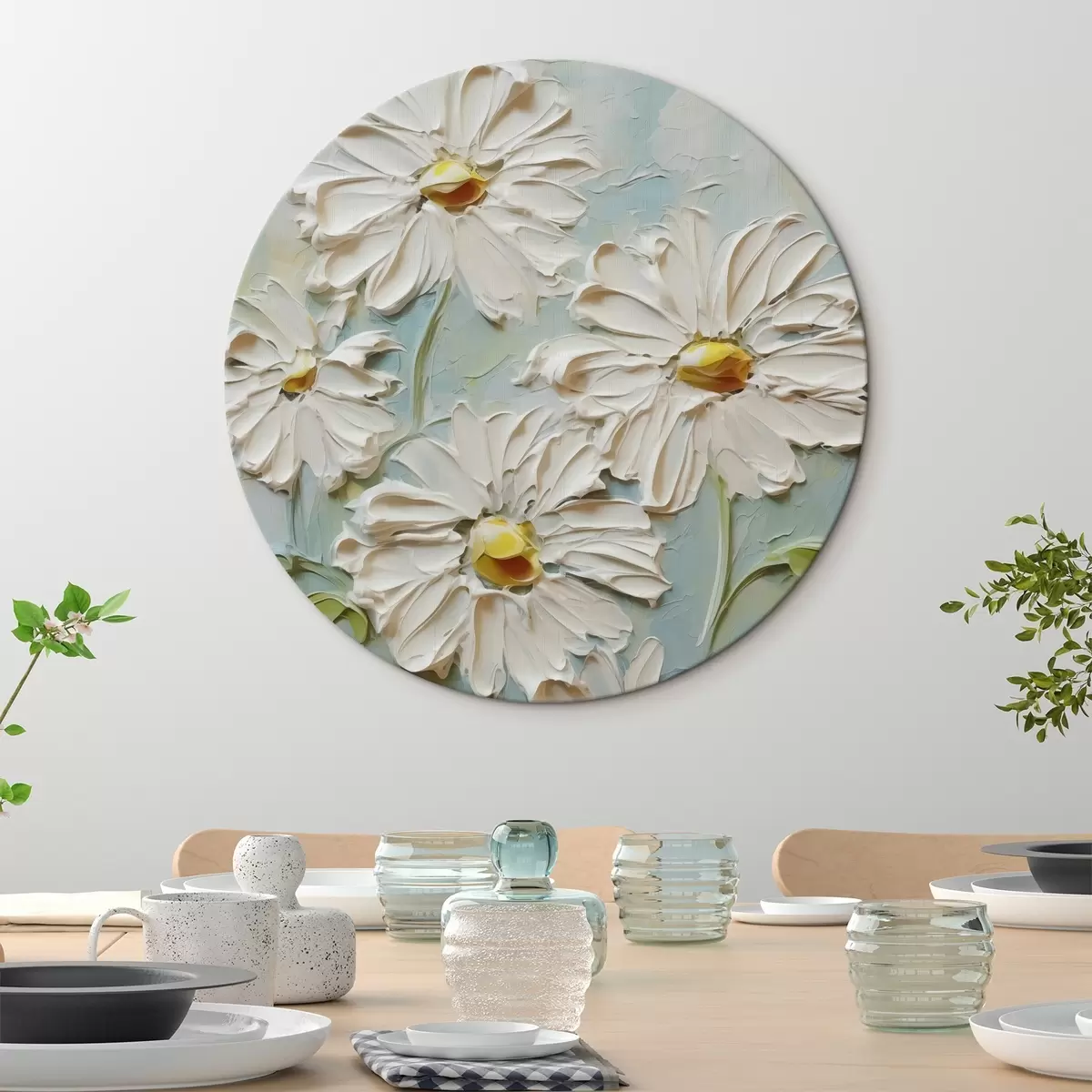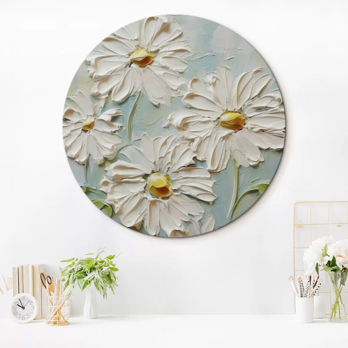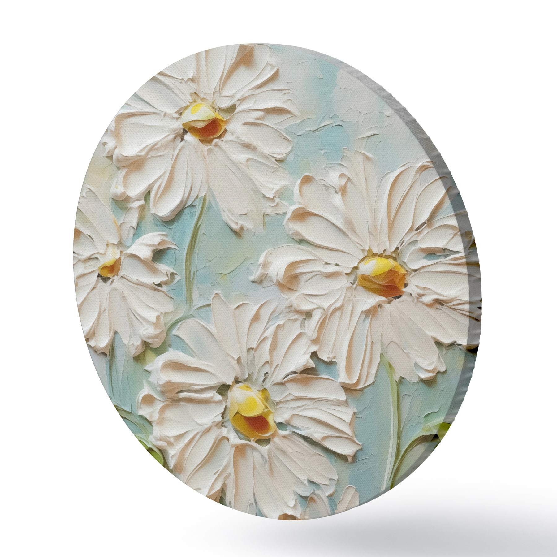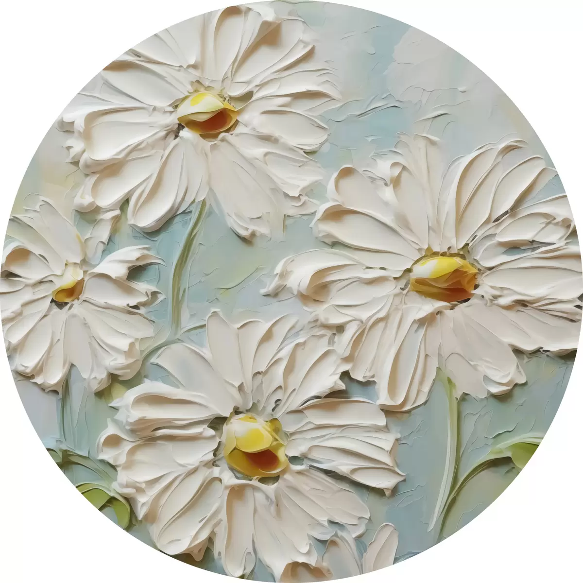 Ronde schilderijen Witte madeliefjes imitatie van verfstreken r42422