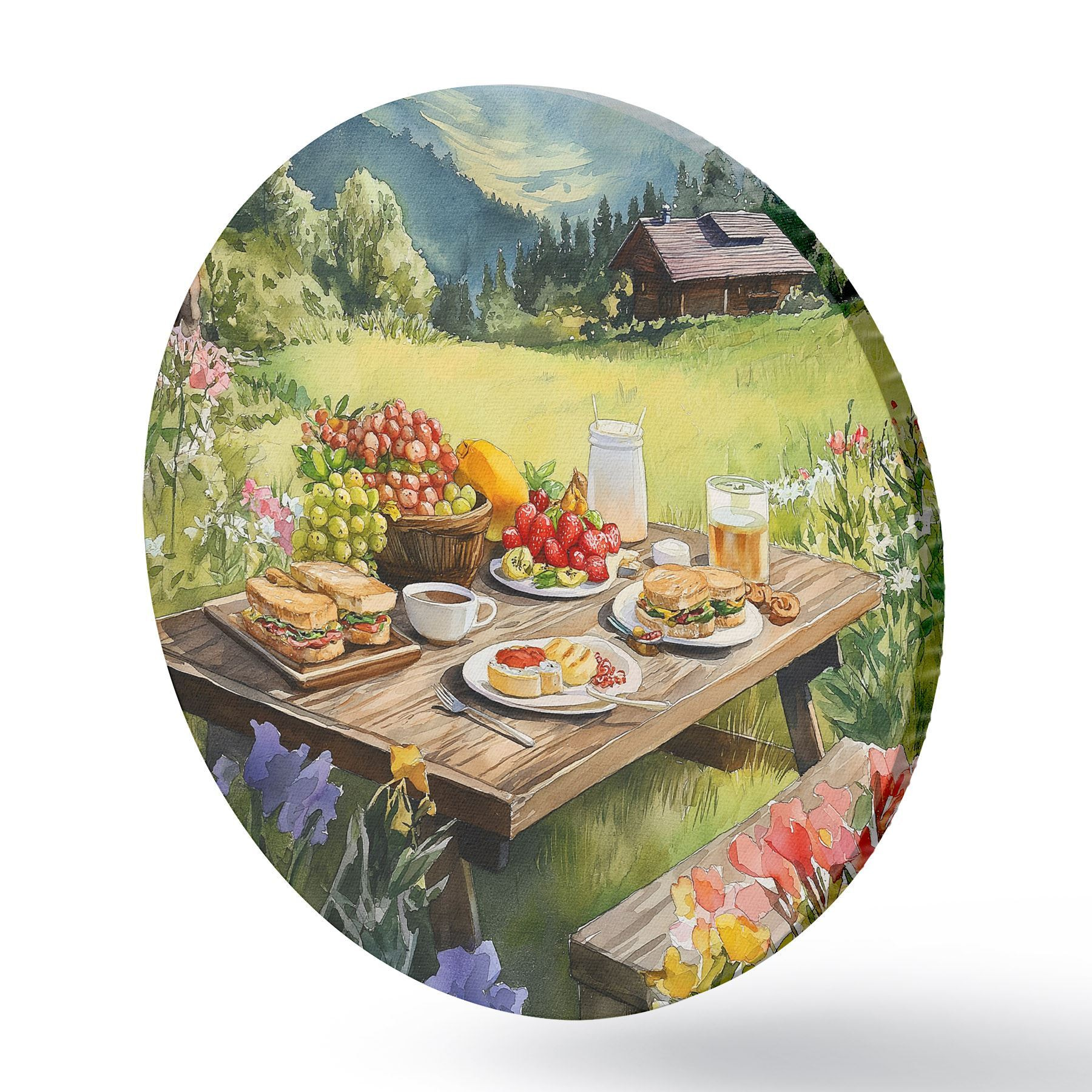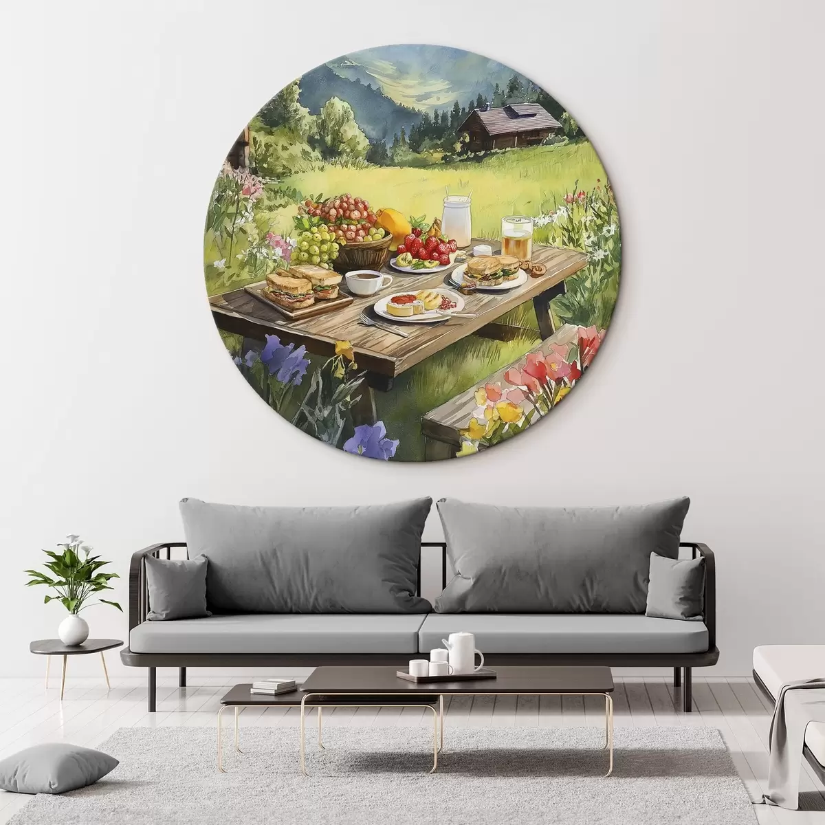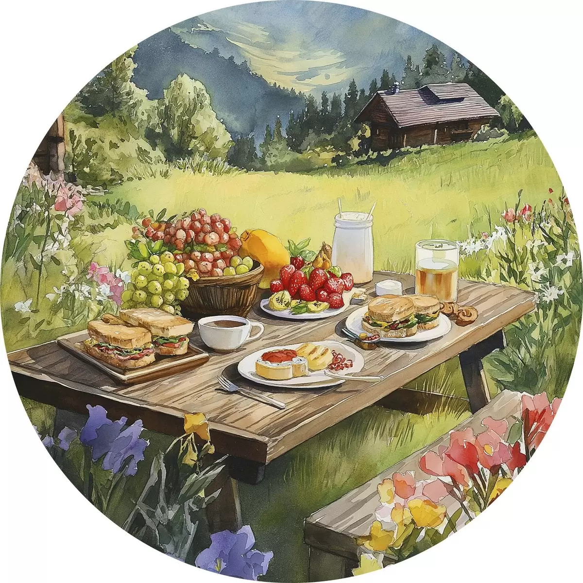 Ronde schilderijen Berglandschappen, zomerweide, houten huizen, ontbijt r42425
