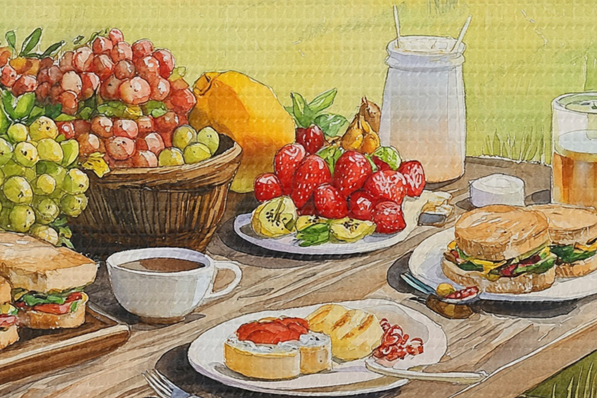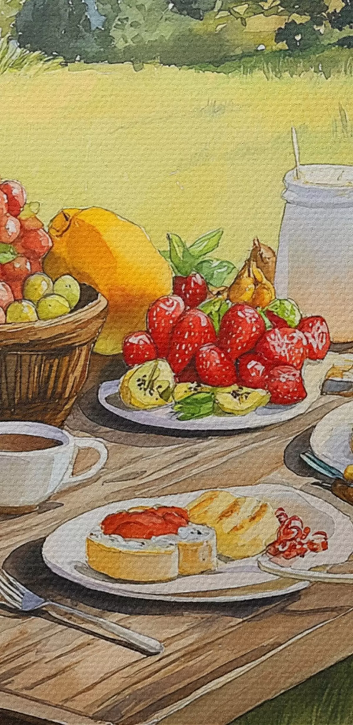 Afbeelding Berglandschappen, zomerweide, houten huizen, ontbijt Nr r42425