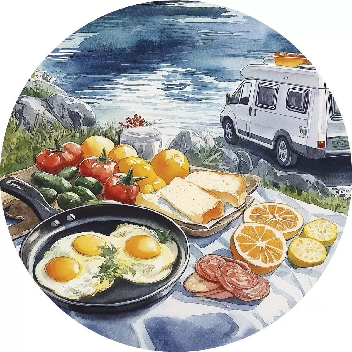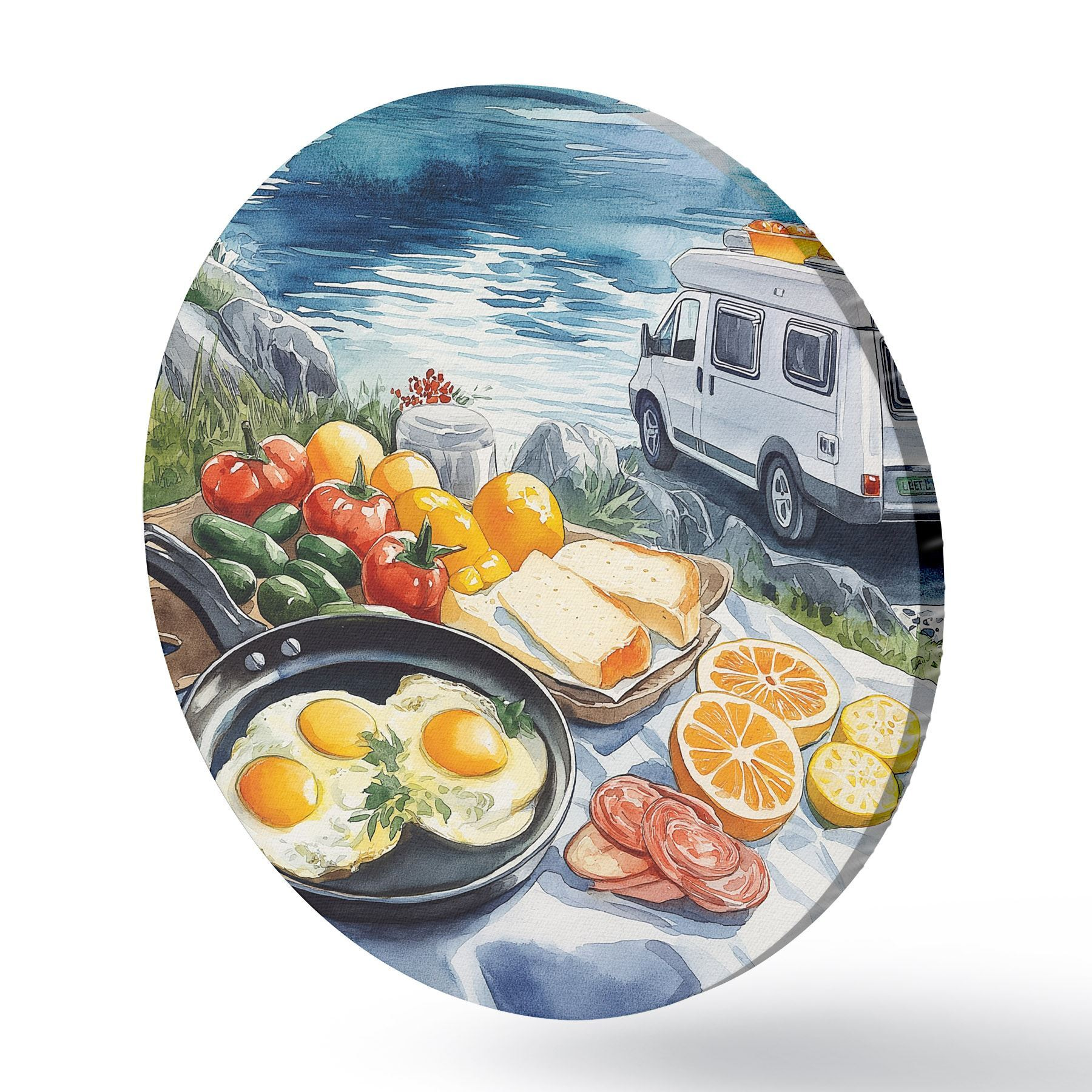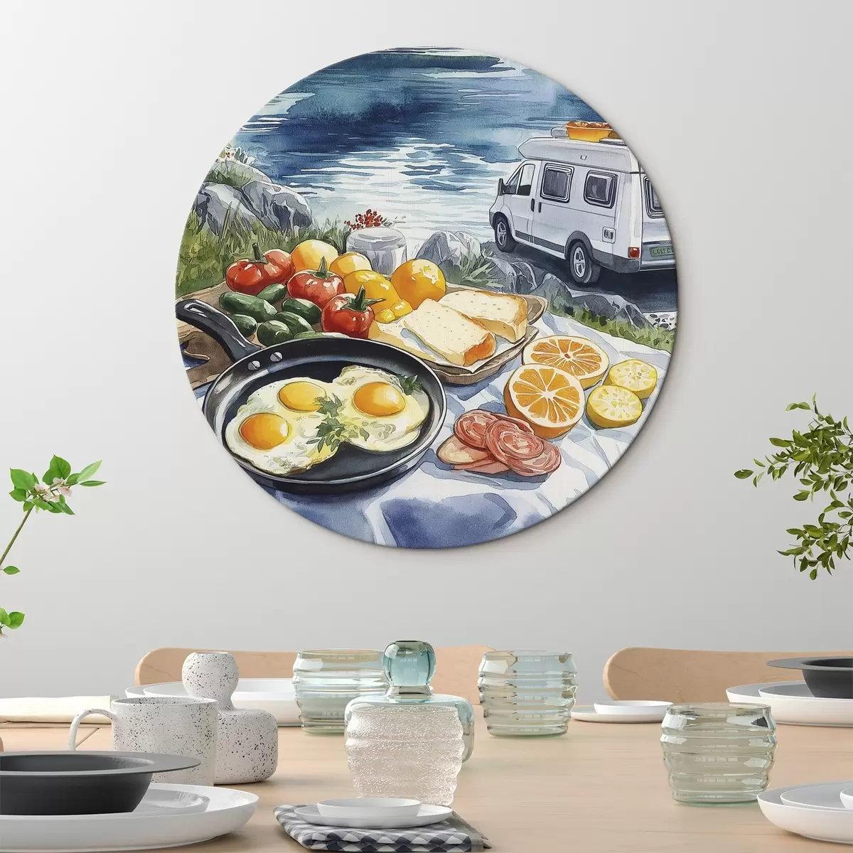 Ronde schilderijen Reizen, buitenleven, aquarelstijl, Noorwegen, ontbijt r42430