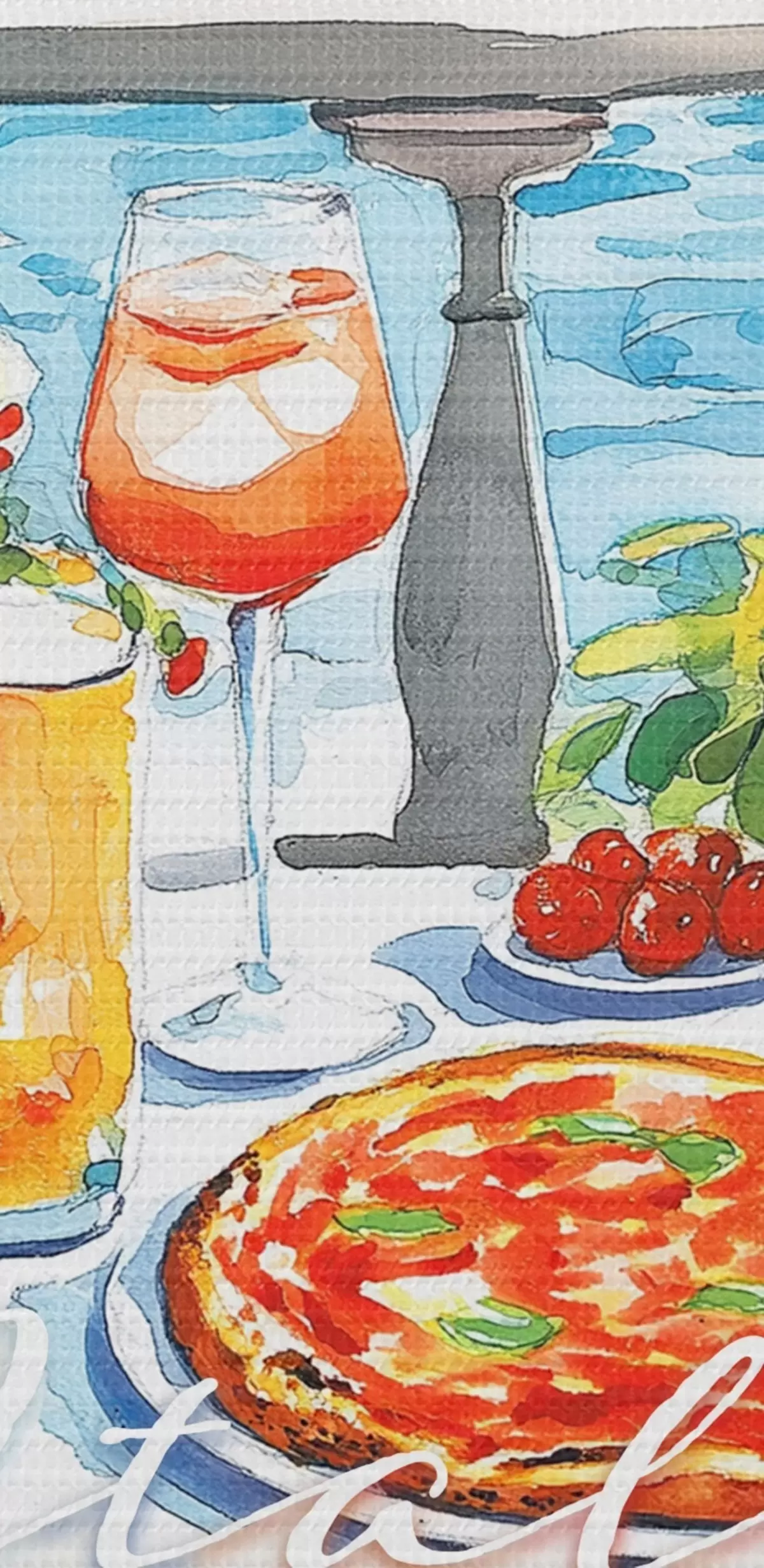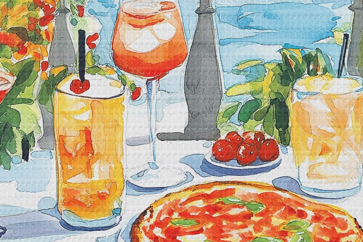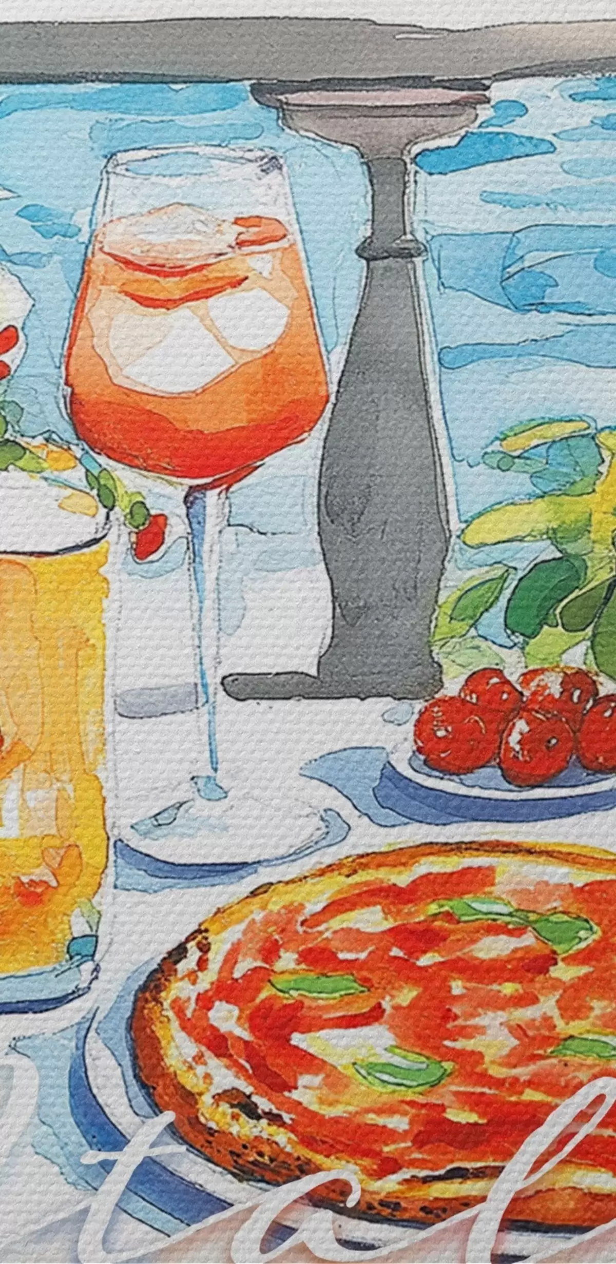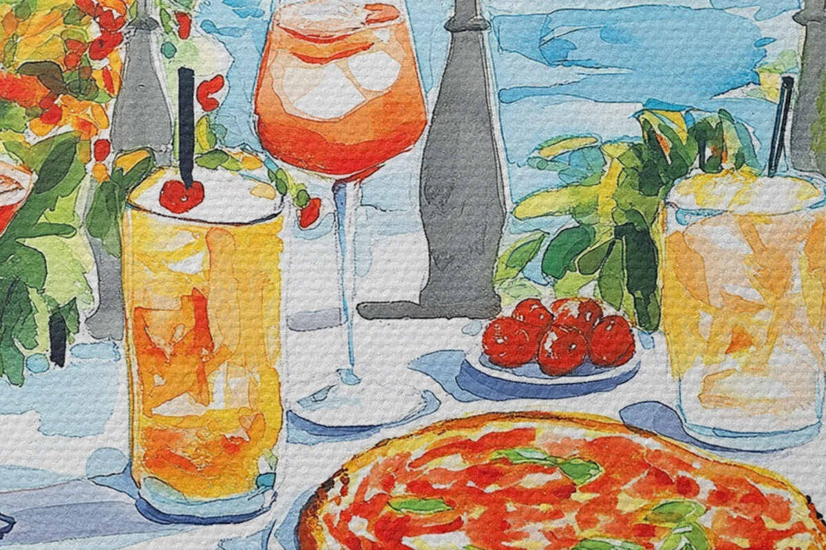 Afbeelding Italië esthetiek, aquarel stijl, pizza en cocktails, bergen Nr r42434