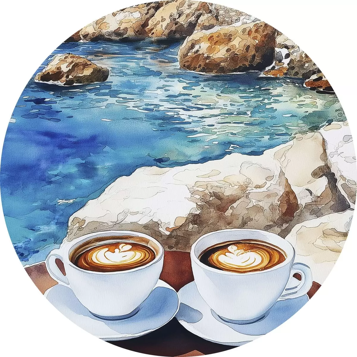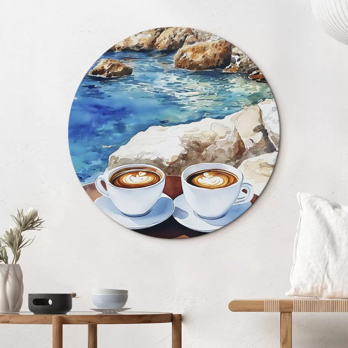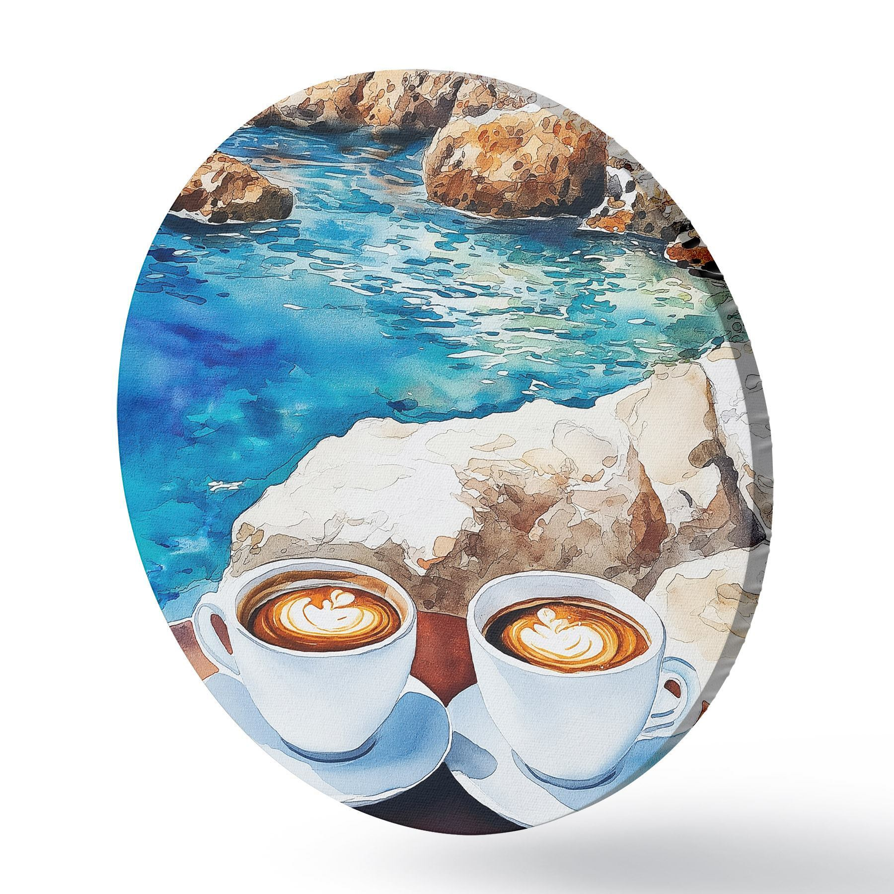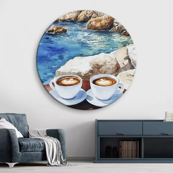 Ronde schilderijen Aquarel zeezijde met kopjes koffie, zomer r42449