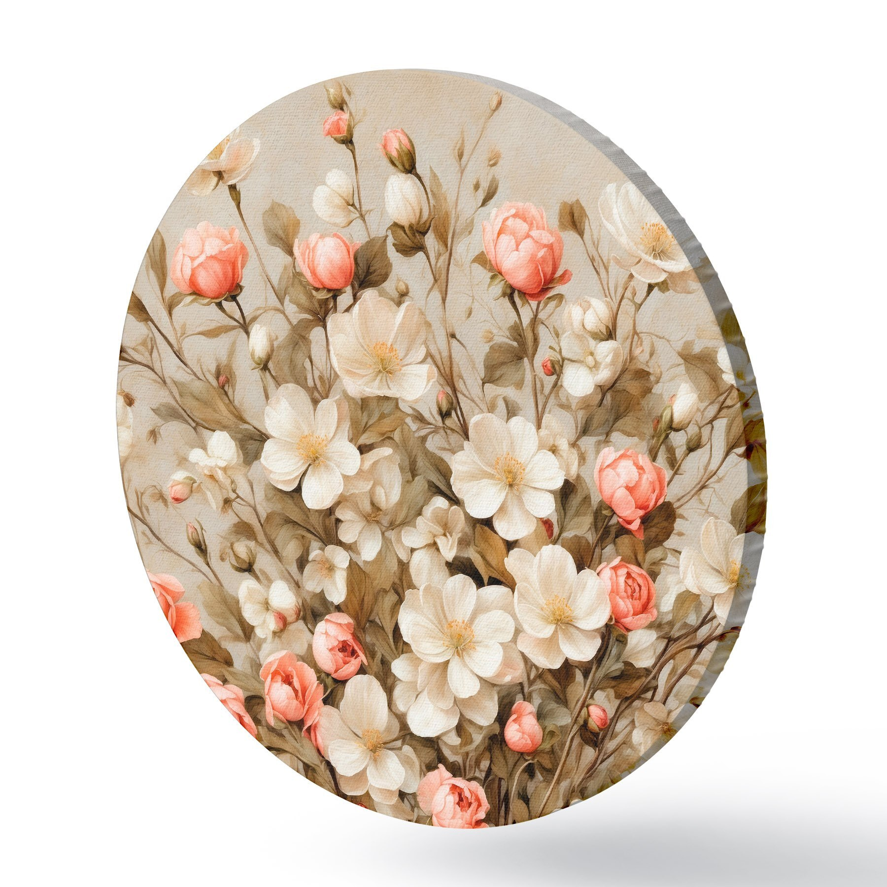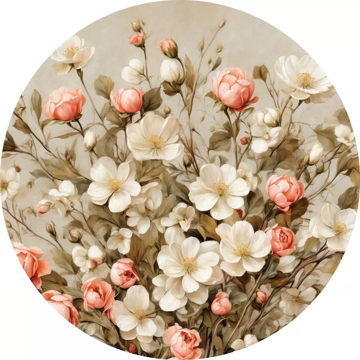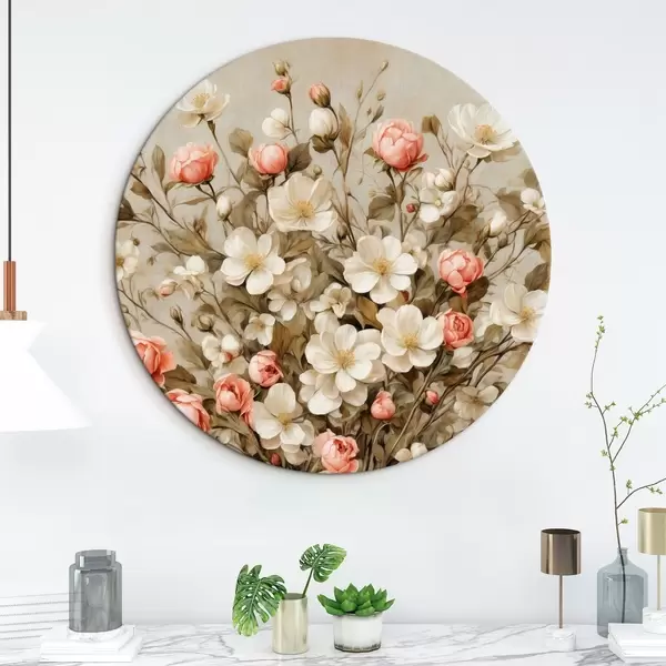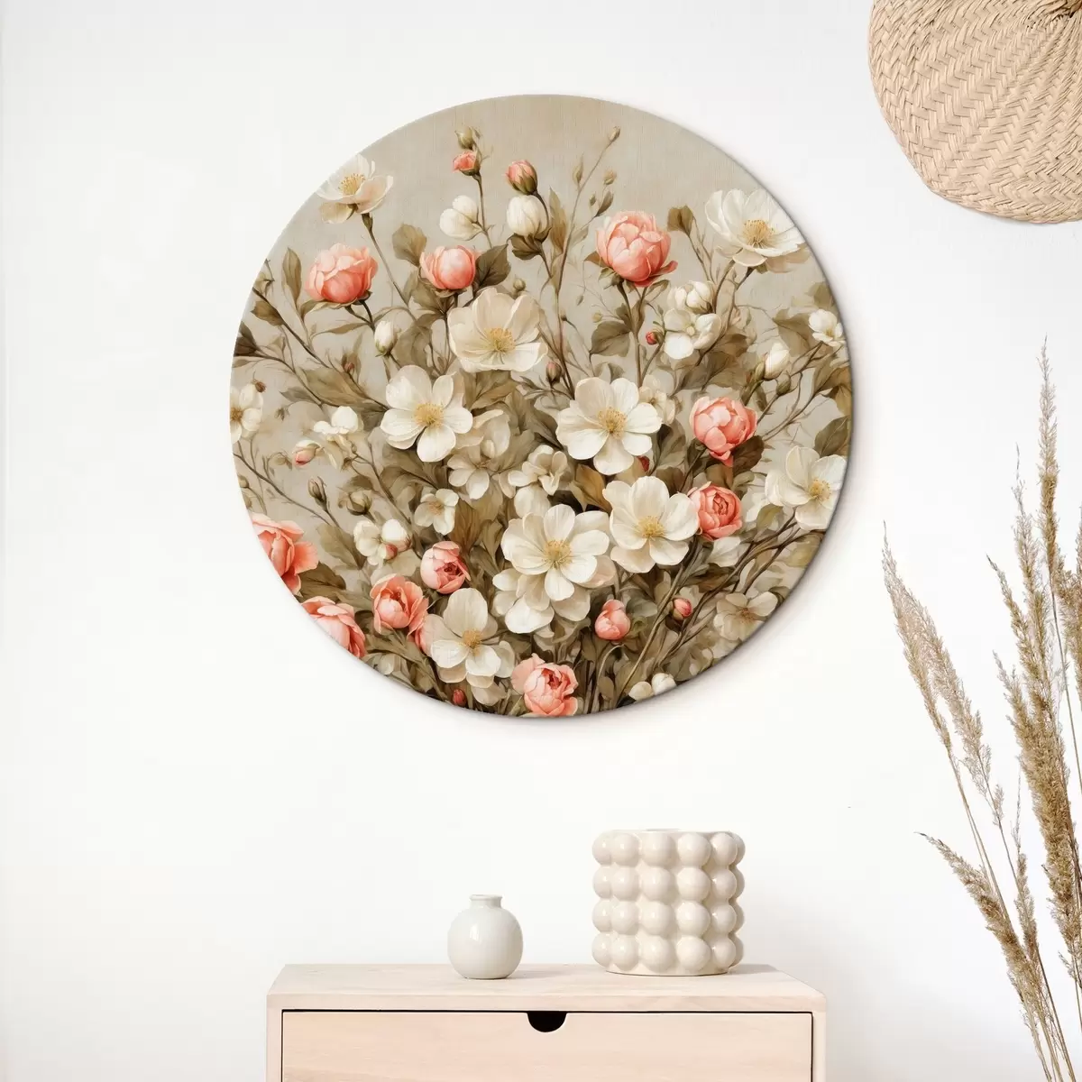 Ronde schilderijen Bloemen in transparante vaas op beige achtergrond r42534