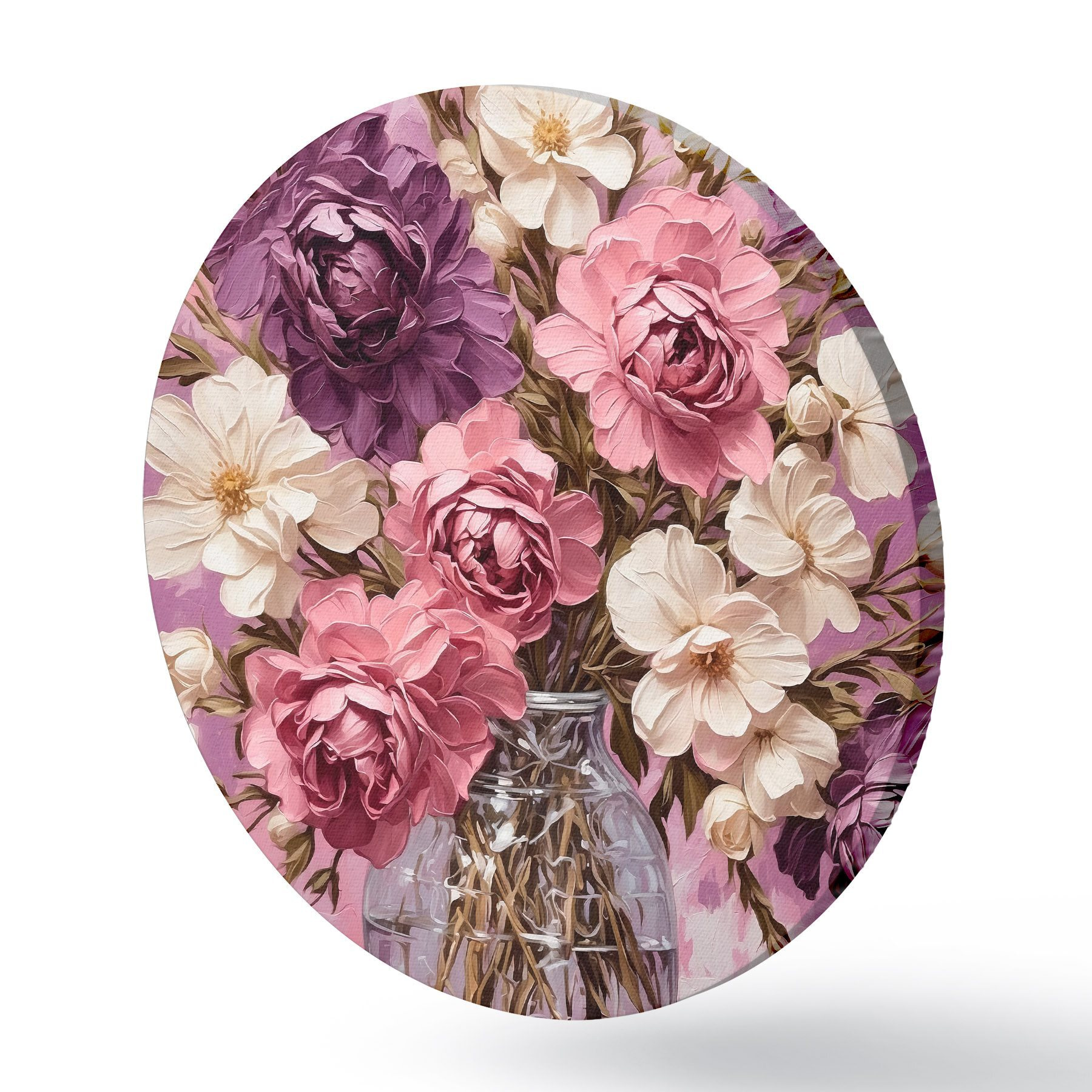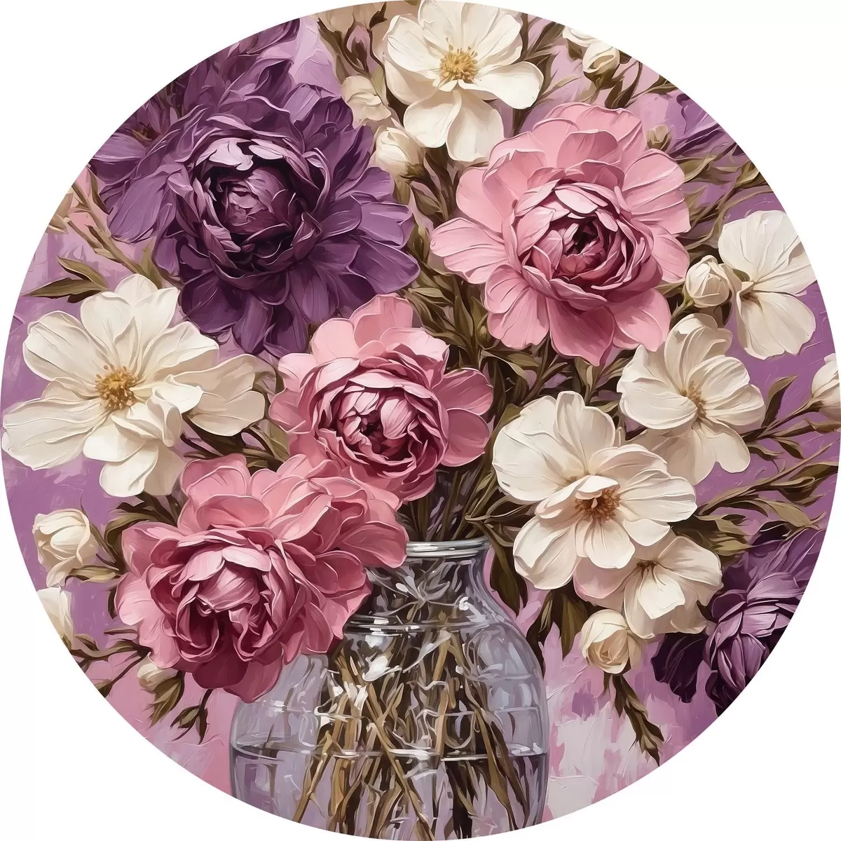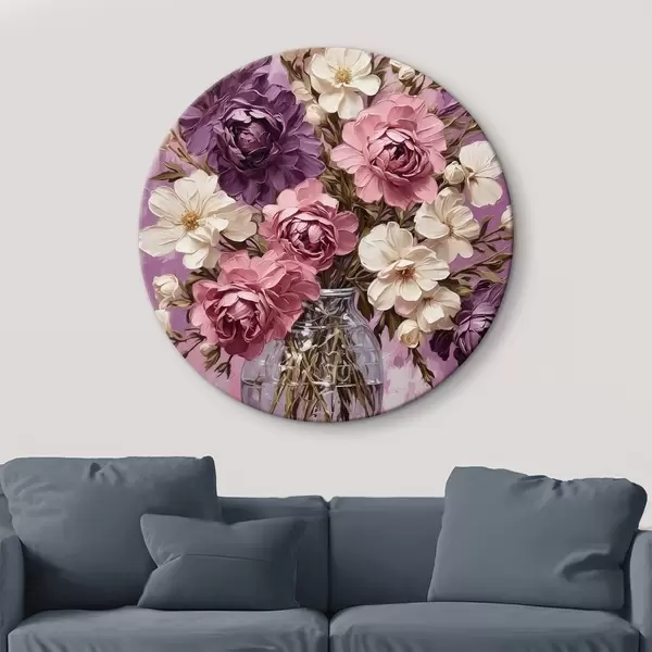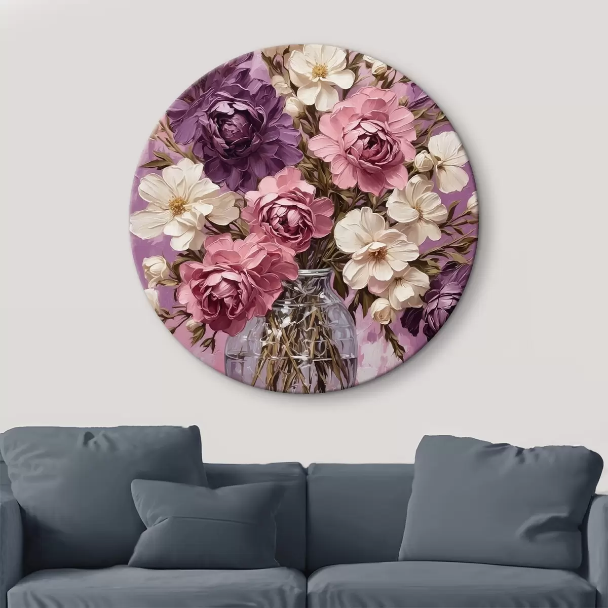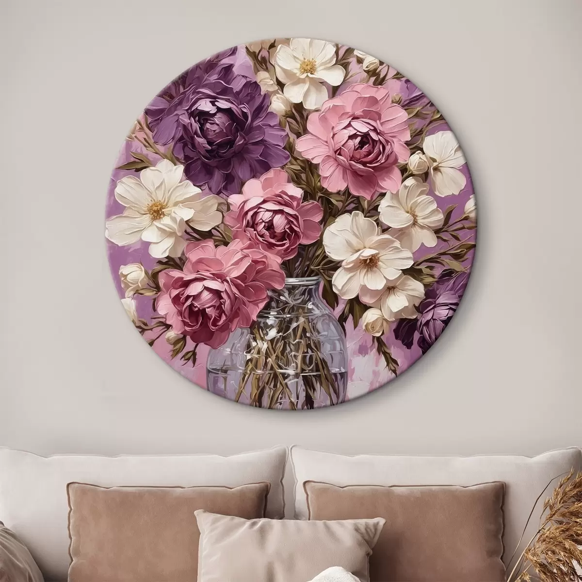 Ronde schilderijen Bloemen in transparante vaas op paarse achtergrond r42535