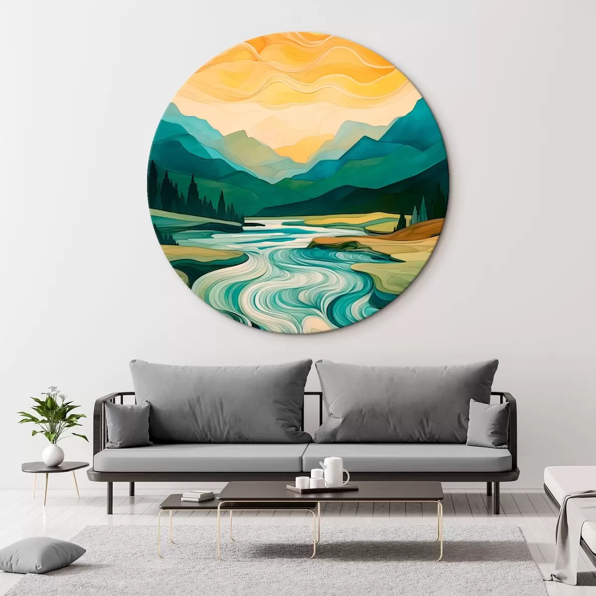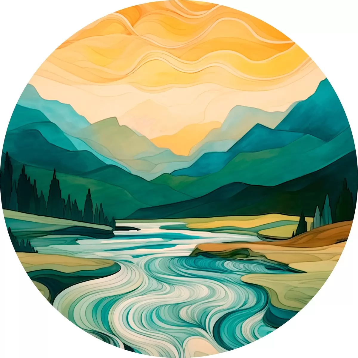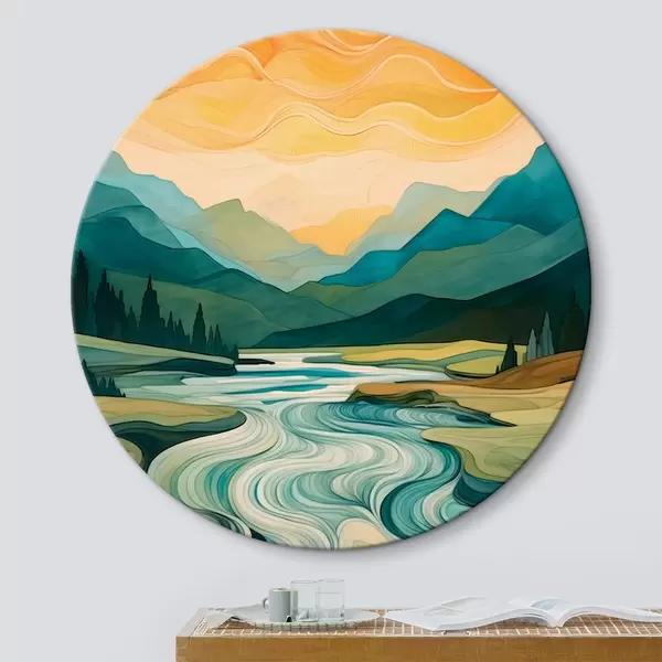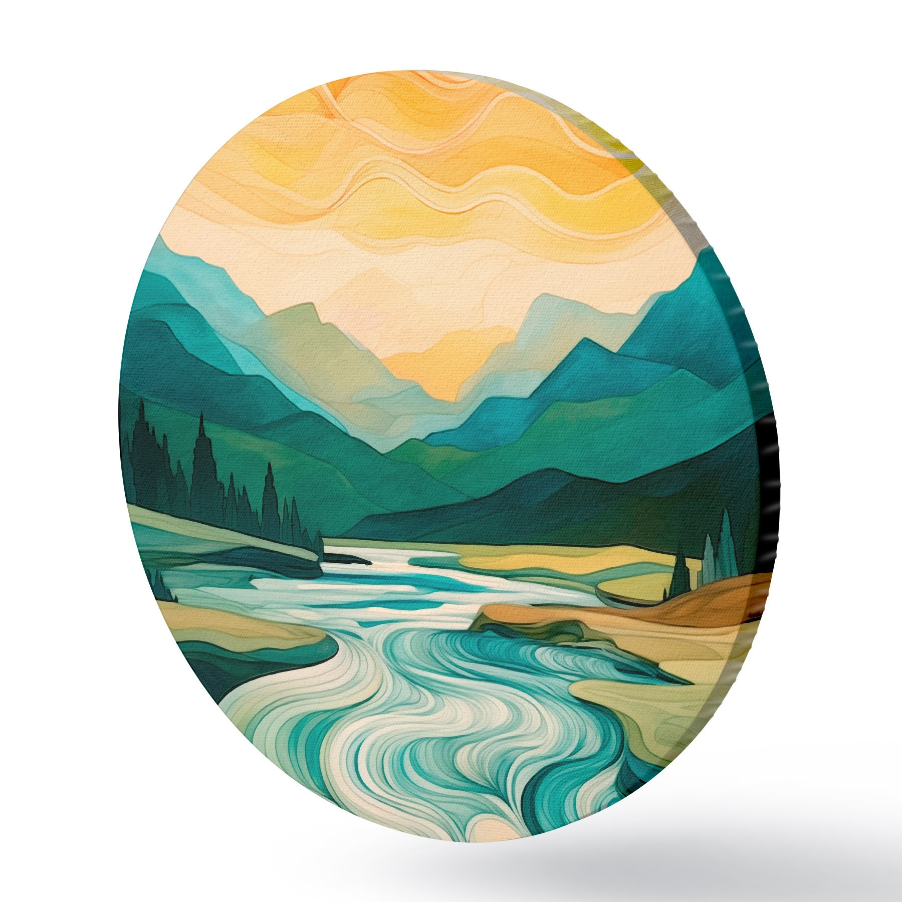 Ronde schilderijen Landschap met rivier in abstracte stijl r42652
