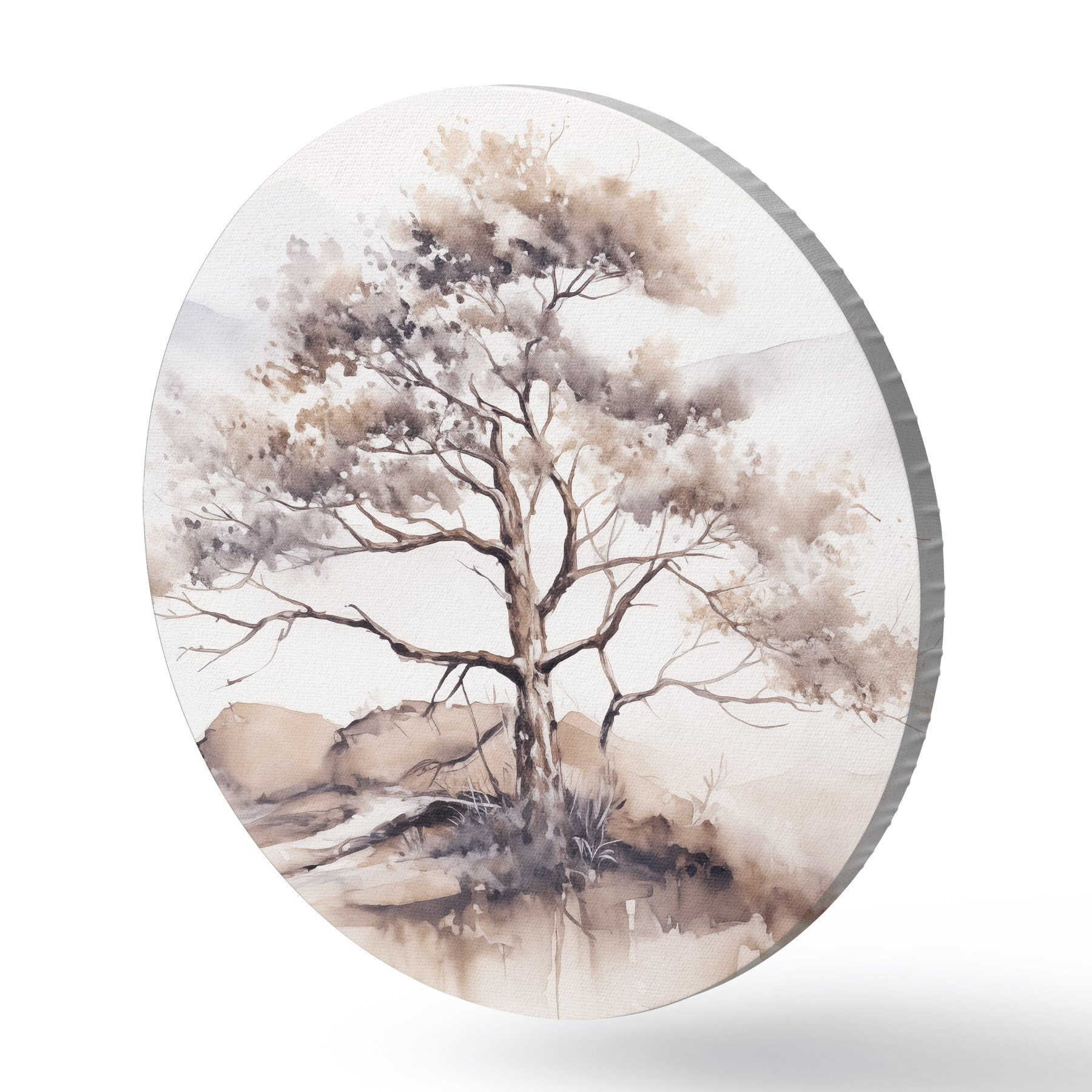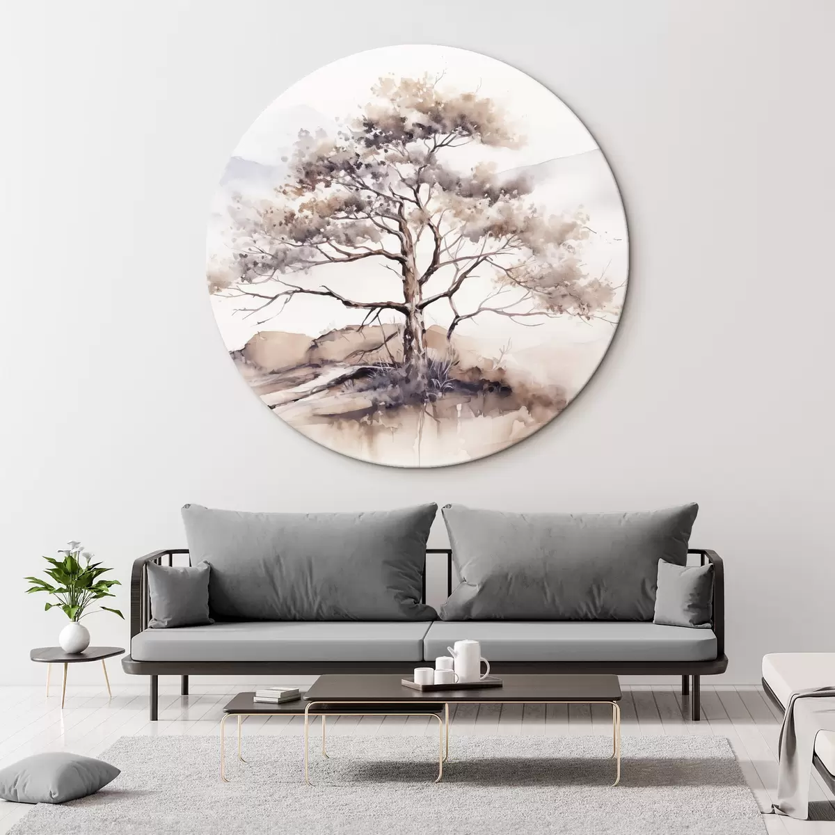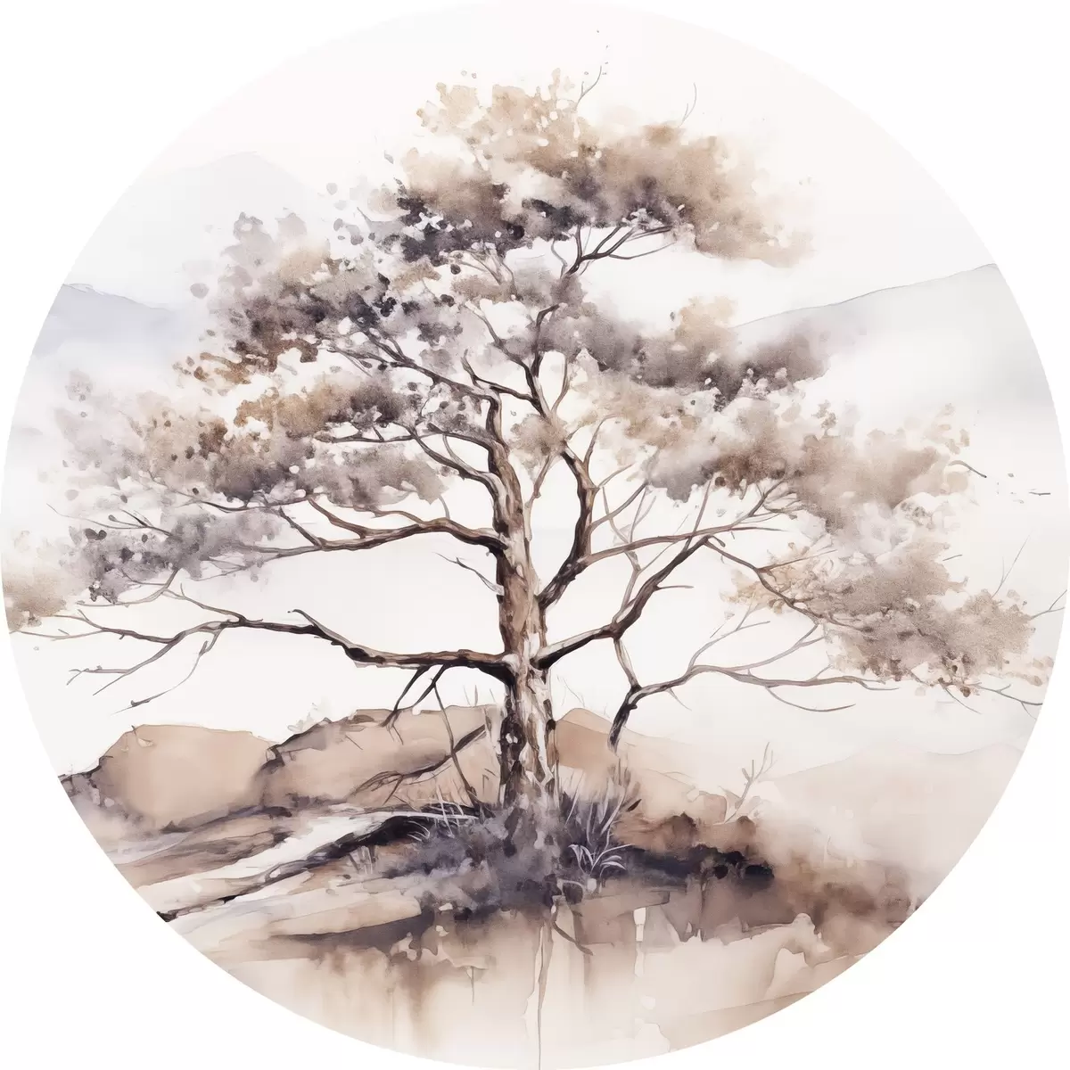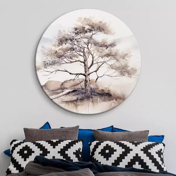 Ronde schilderijen Een eenzame boom met een gedraaide stam en spaarzame takken tegen een zachte, gedempte achtergrond van bergen r42715