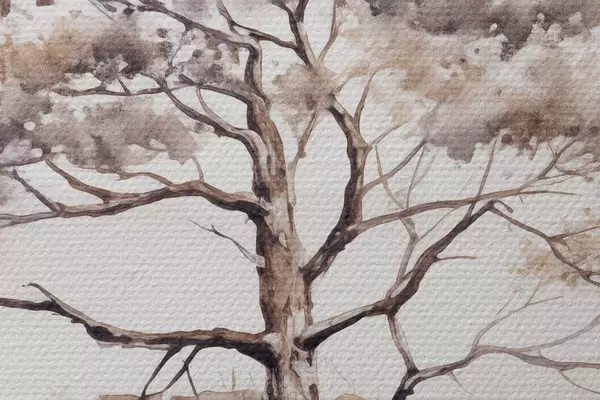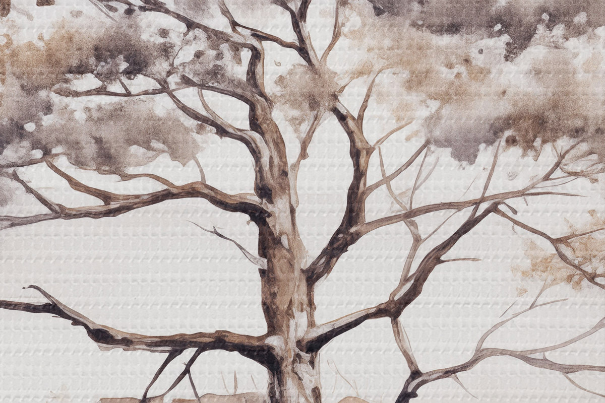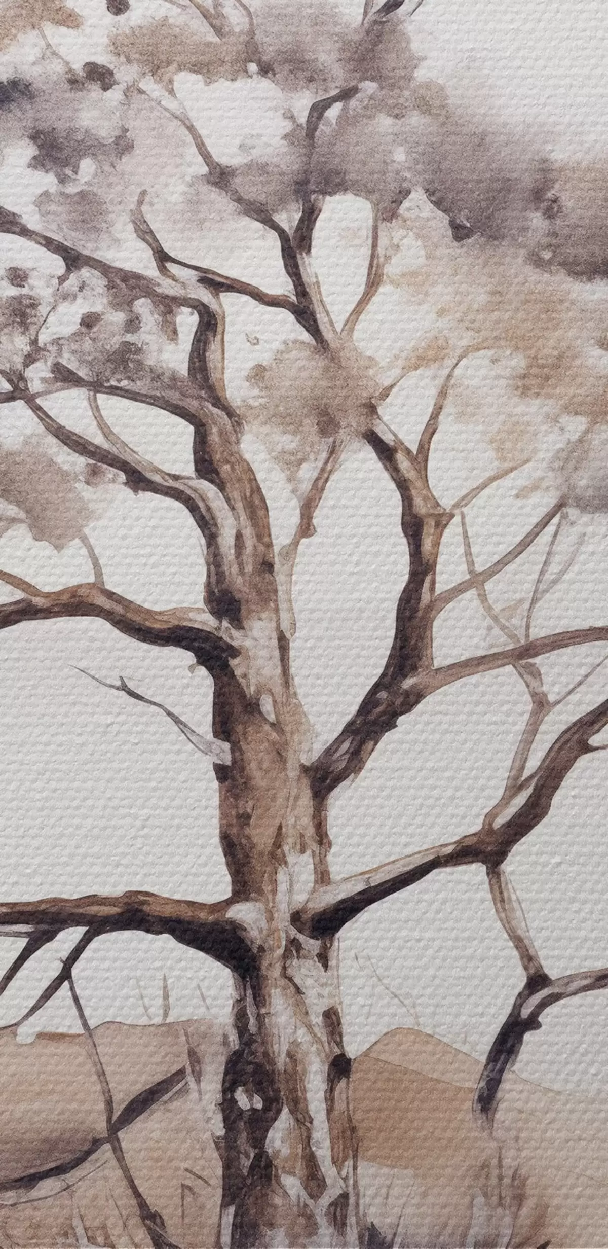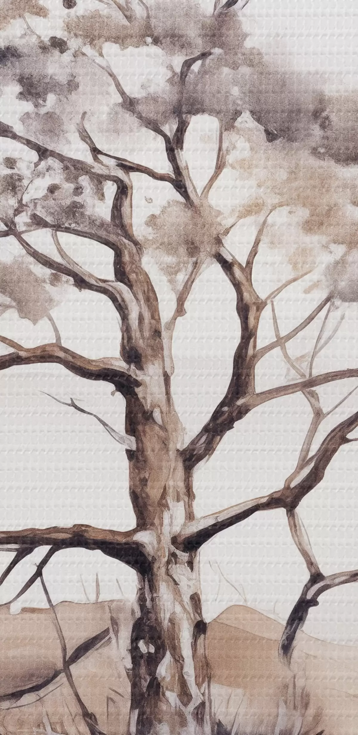 Afbeelding Een eenzame boom met een gedraaide stam en spaarzame takken tegen een zachte, gedempte achtergrond van bergen Nr r42715