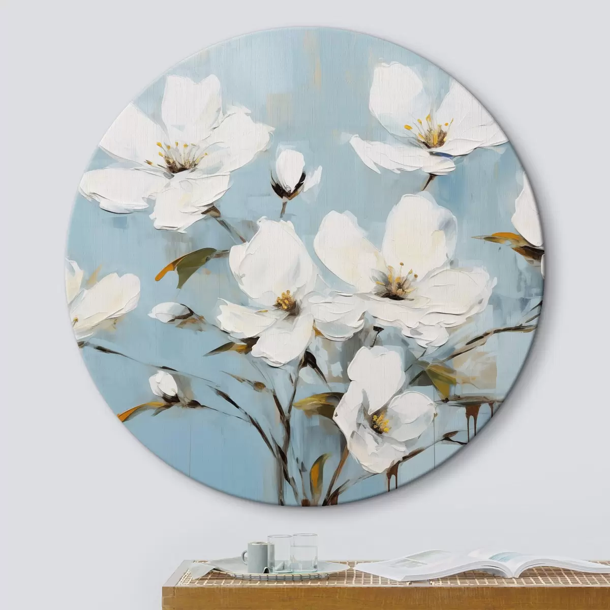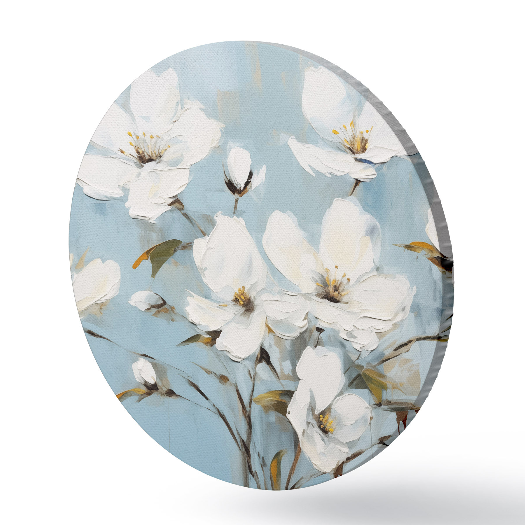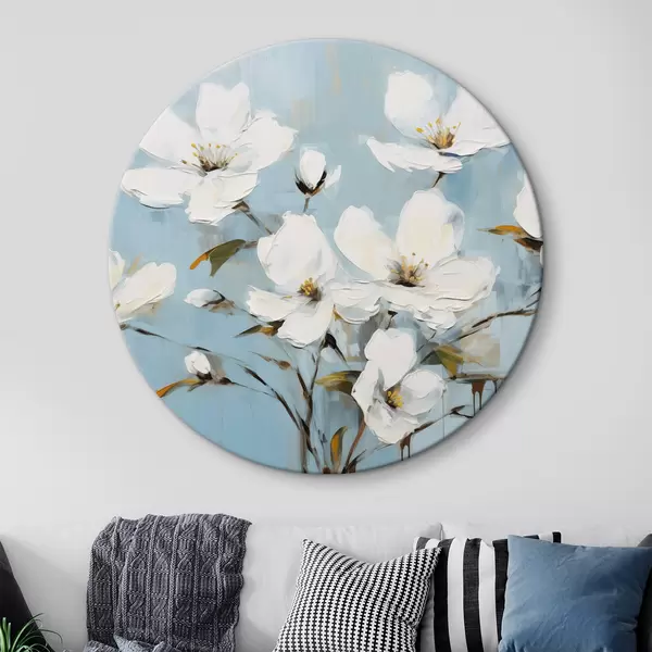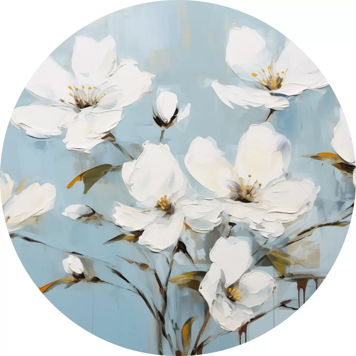 Ronde schilderijen Witte bloemen met fijne bloemblaadjes en groene blaadjes tegen een lichtblauwe achtergrond olieverfschilderij imitatie r42719