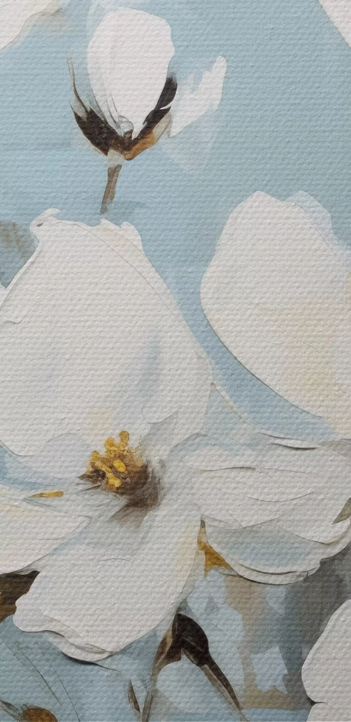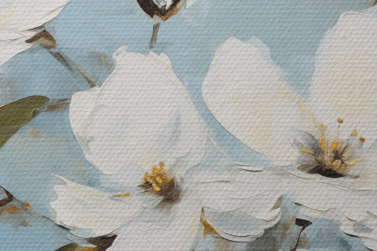 Afbeelding Witte bloemen met fijne bloemblaadjes en groene blaadjes tegen een lichtblauwe achtergrond olieverfschilderij imitatie Nr r42719