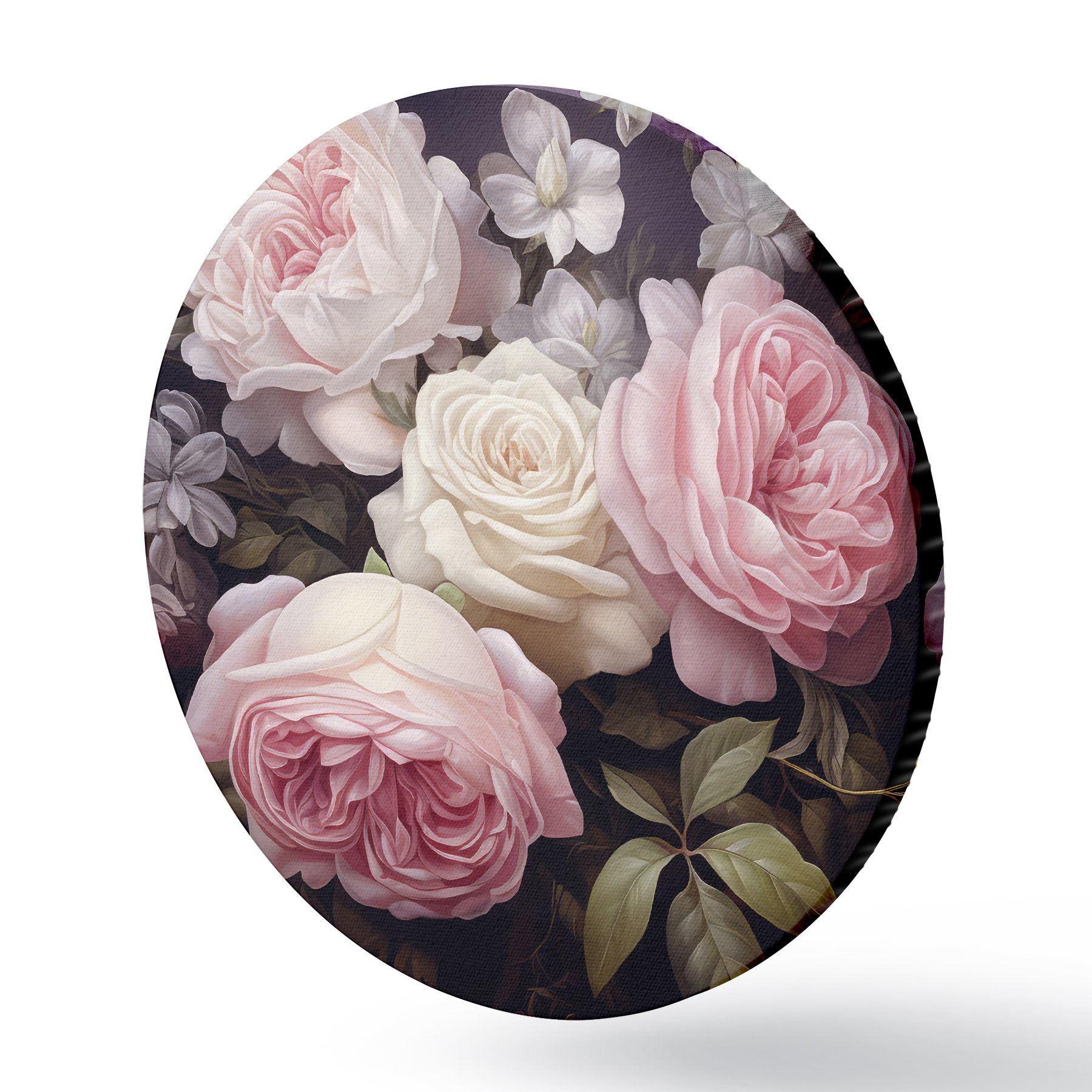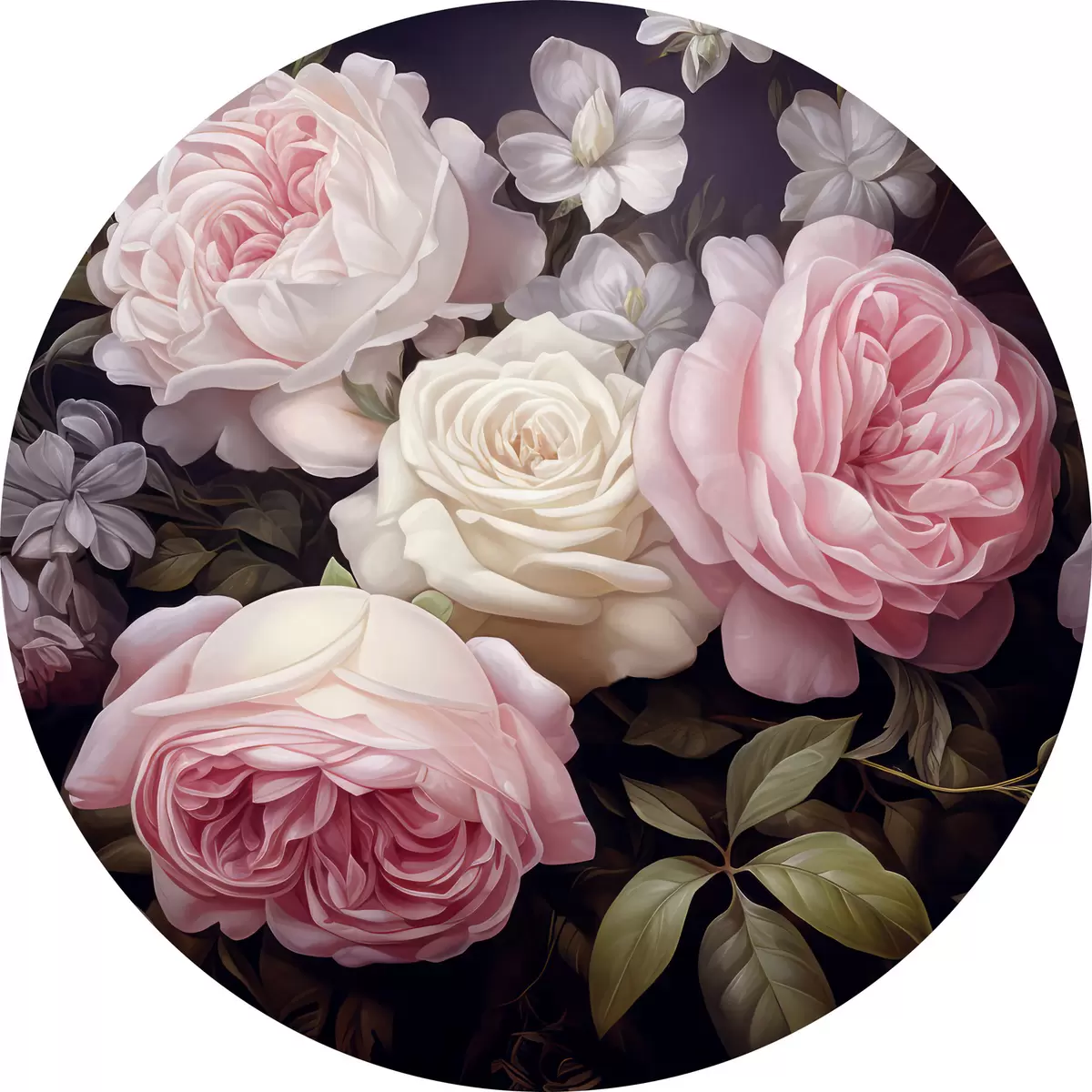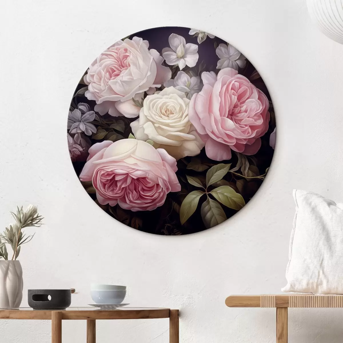 Ronde schilderijen Roze en witte rozen gerangschikt met delicate witte bloemen en groene bladeren tegen een donkere achtergrond r42721