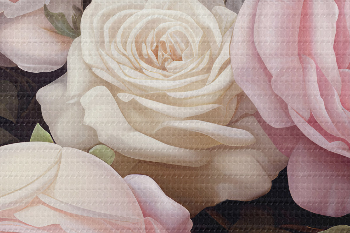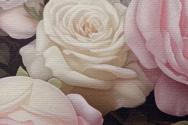 Afbeelding Roze en witte rozen gerangschikt met delicate witte bloemen en groene bladeren tegen een donkere achtergrond Nr r42721