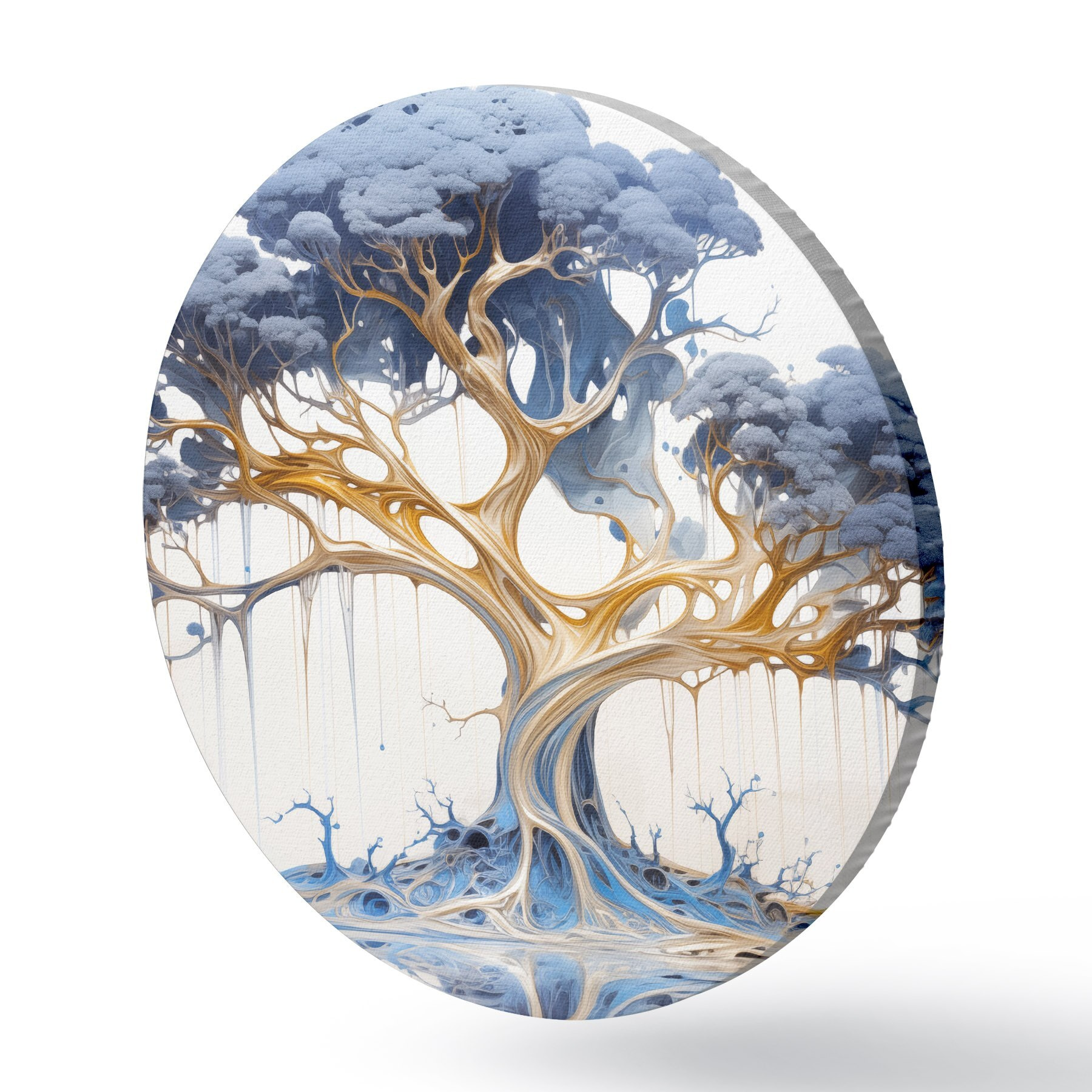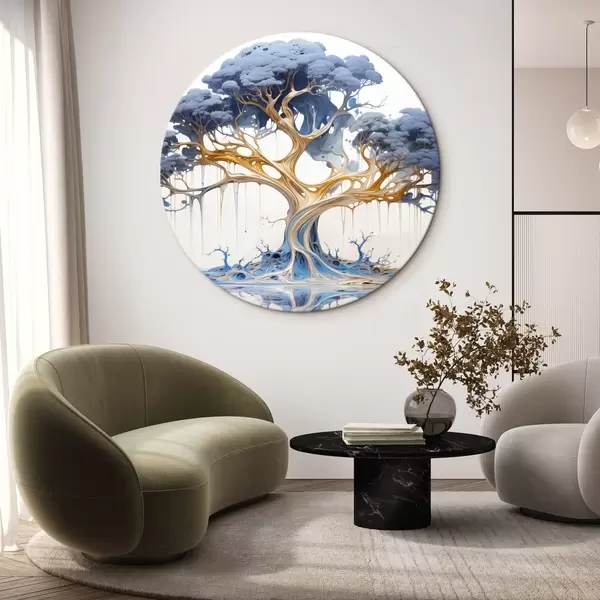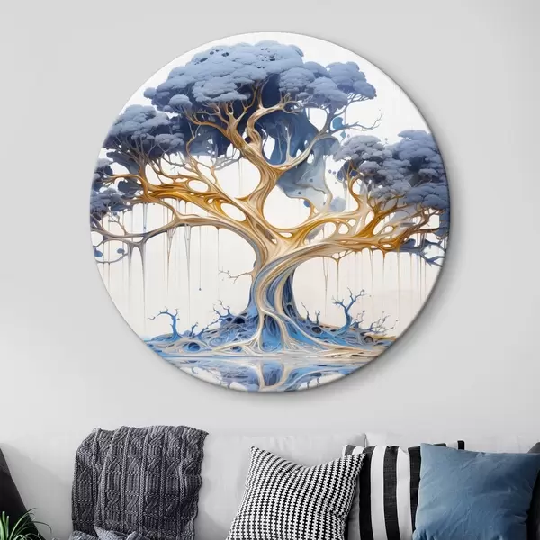 Ronde schilderijen Een gestileerde boom met ingewikkelde takken en gebladerte, met een mix van blauwe en gele tinten r42722