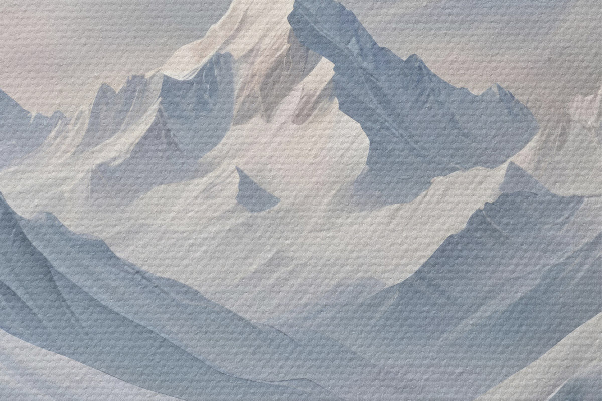 Afbeelding Besneeuwde bergen met scherpe pieken en een zacht verlopende lucht die overgaat van lichtblauw naar lichtblauw Nr r42724